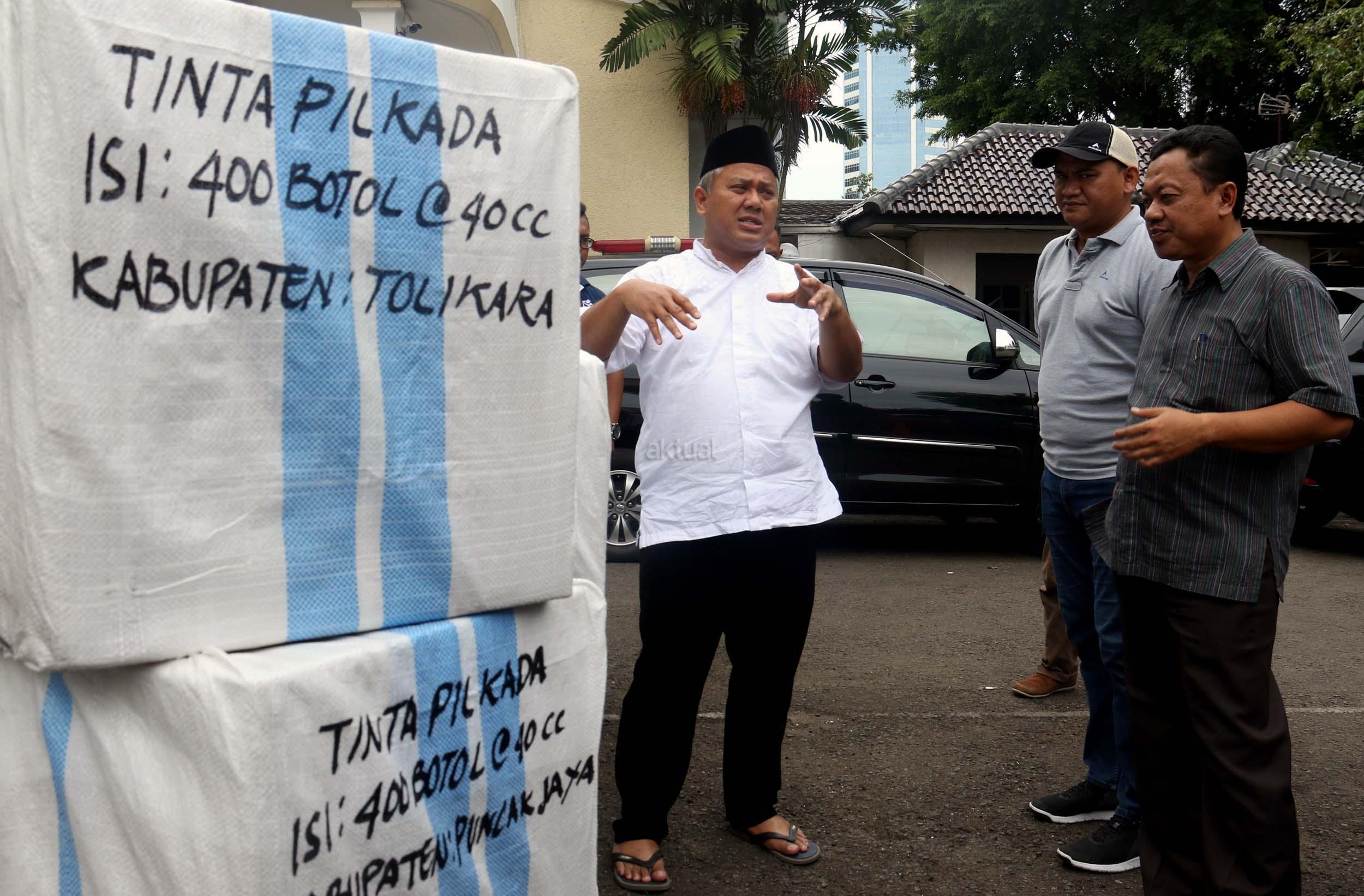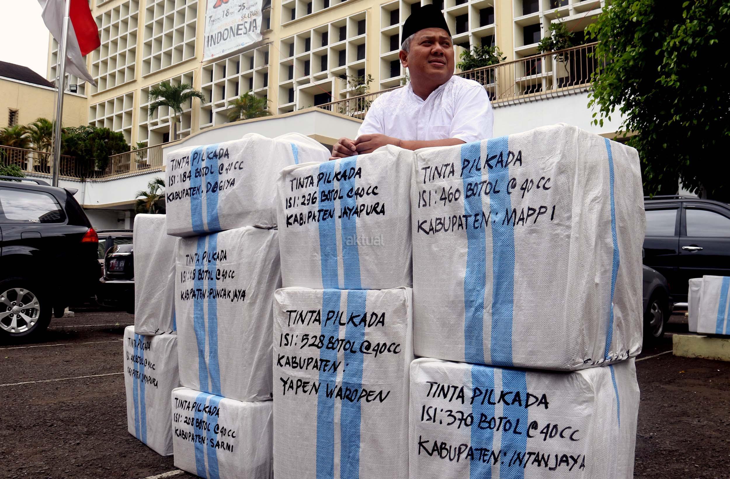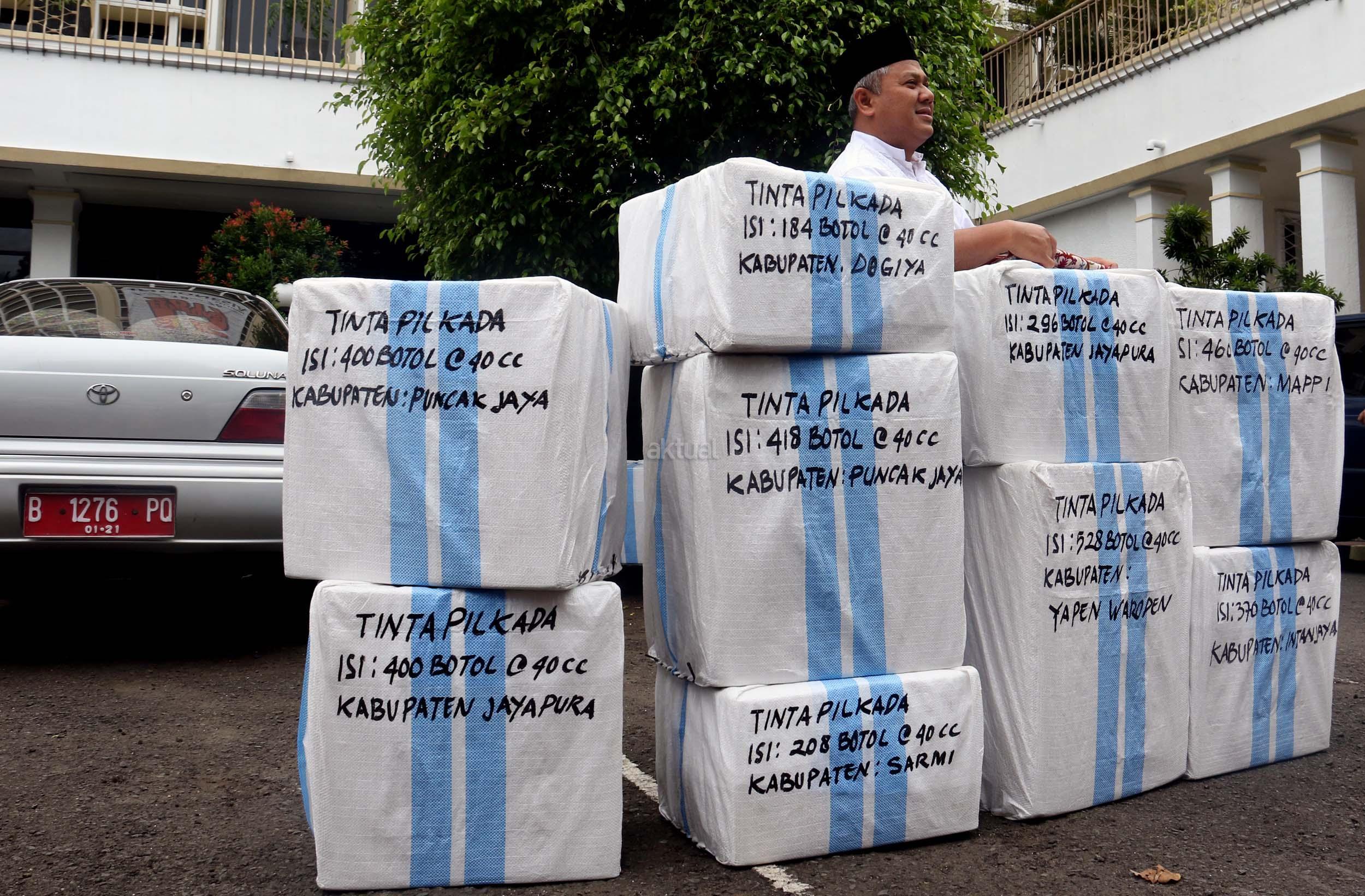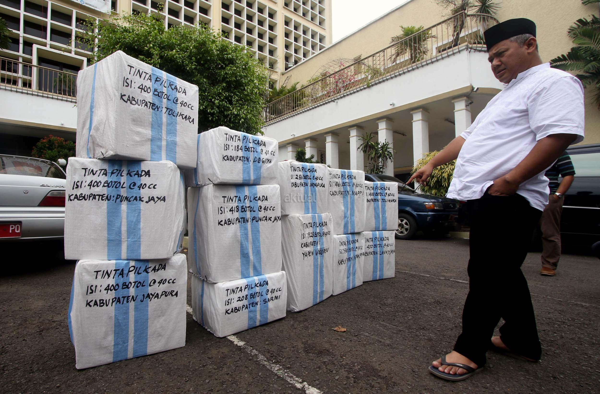 Komisioner KPU Arief Budiman mengecek pengiriman tinta Pilkada Provinsi Papua di KPU, Jakarta, Jumat (13/1/2017). Perbedaan letak geografis di berbagai wilayah Indonesia dan untuk mensukses Pilkada serentak 2017, KPU mulai melakukan pengiriman logistik lebih awal untuk wilayah pegunungan.
