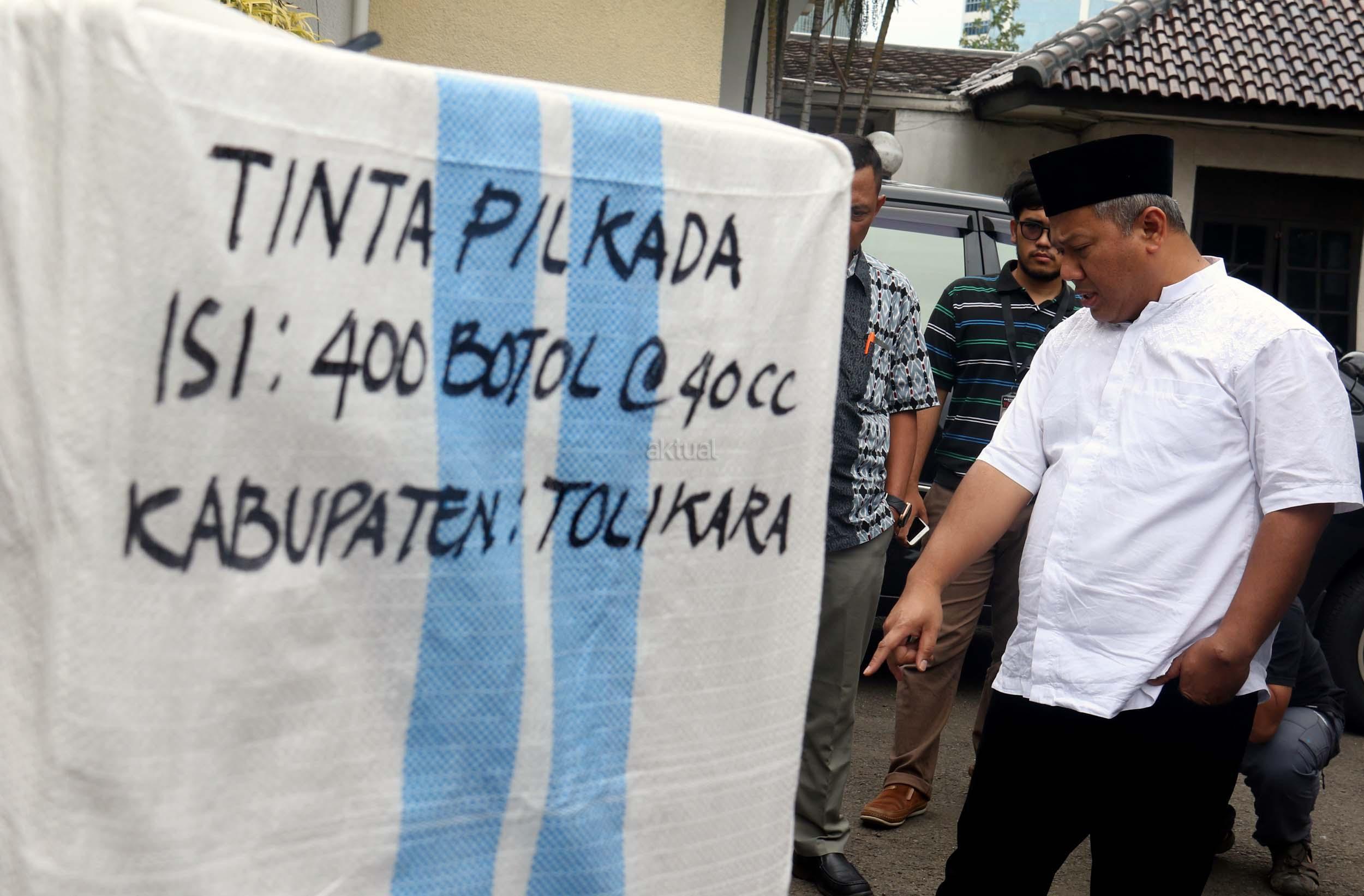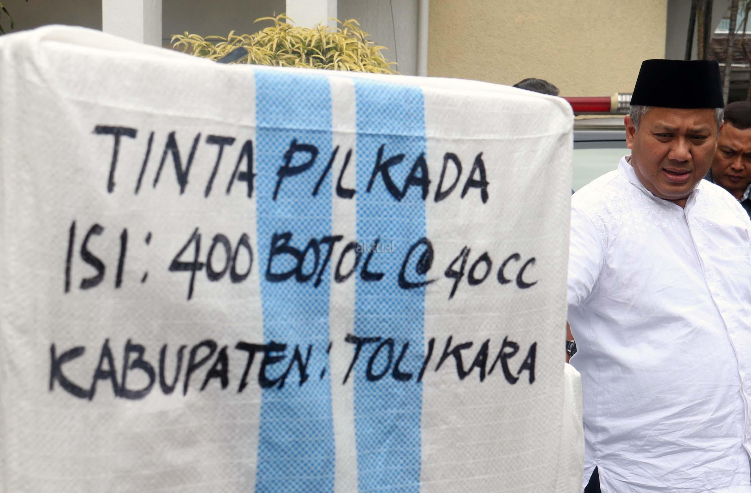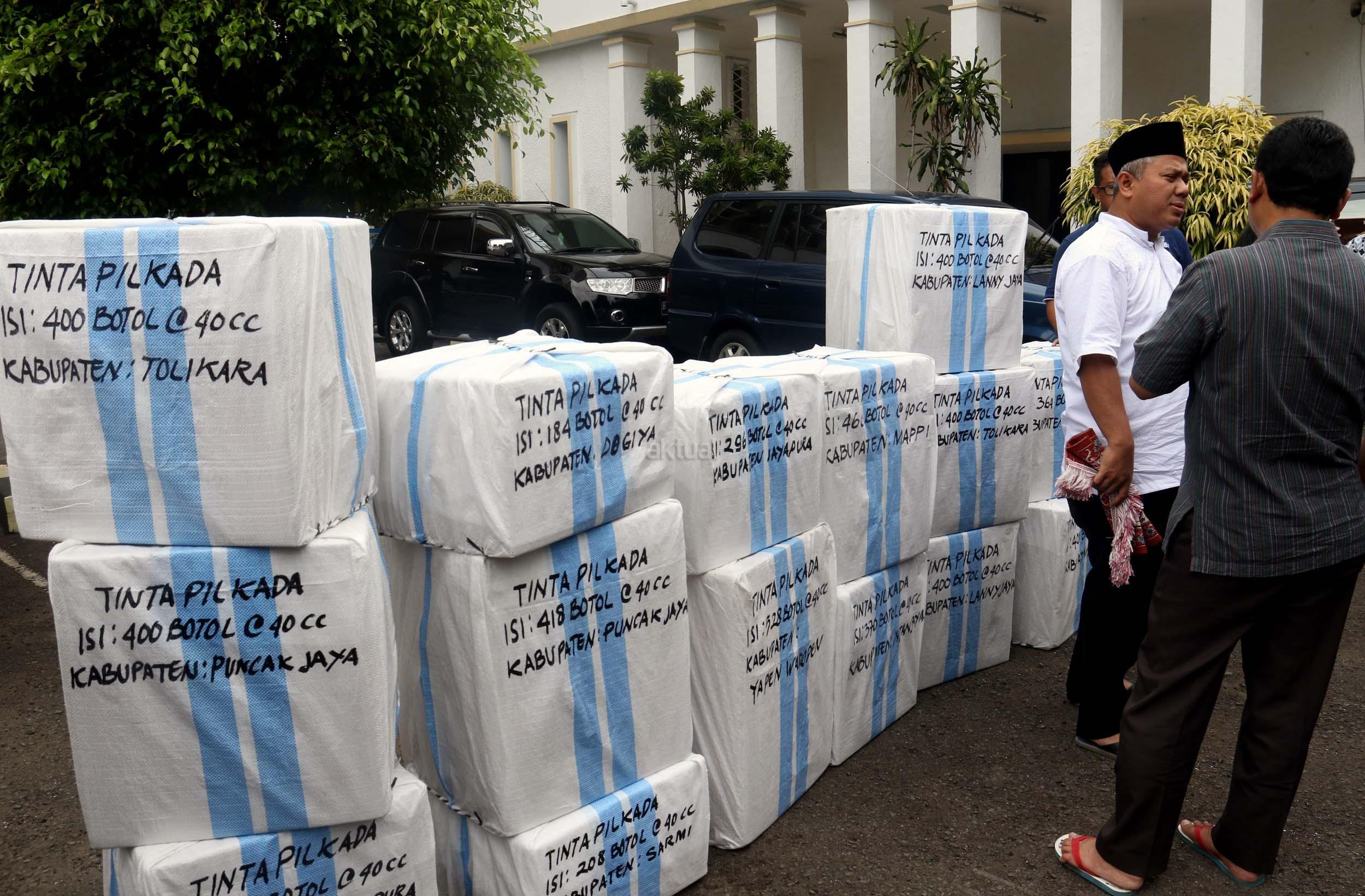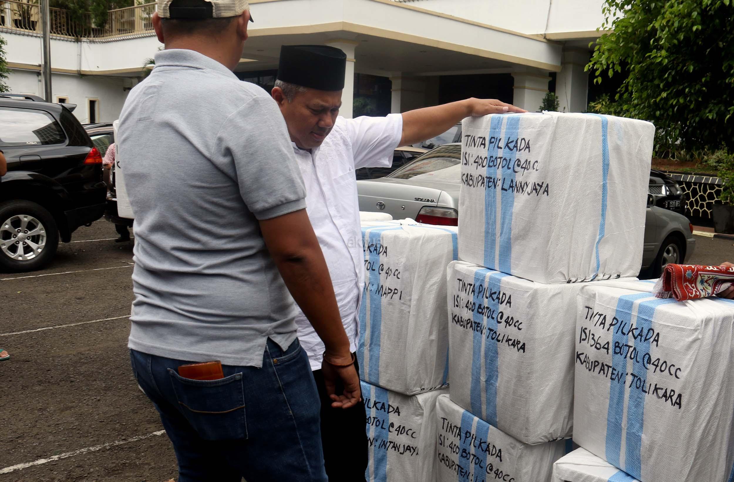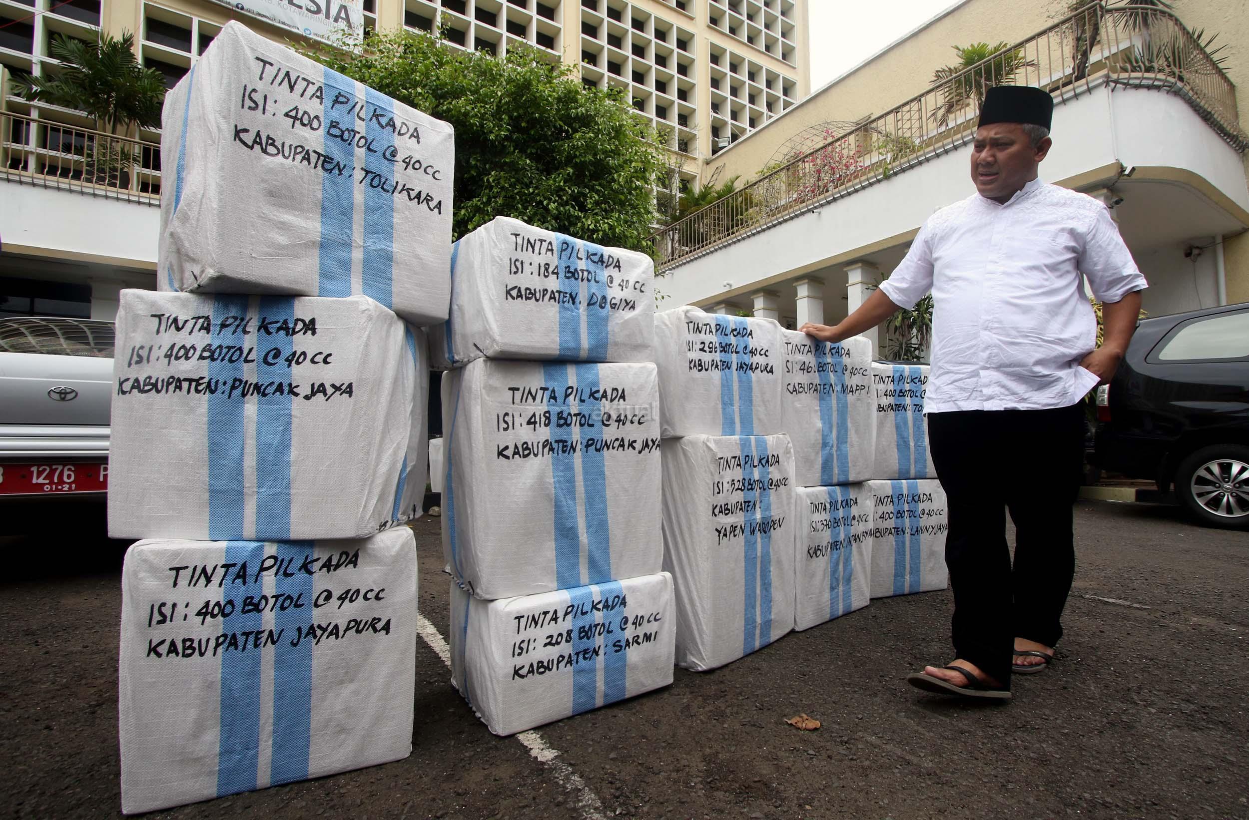 Komisioner KPU Arief Budiman mengecek pengiriman tinta Pilkada Provinsi Papua di KPU, Jakarta, Jumat (13/1/2017). Perbedaan letak geografis di berbagai wilayah Indonesia dan untuk mensukses Pilkada serentak 2017, KPU mulai melakukan pengiriman logistik lebih awal untuk wilayah pegunungan.