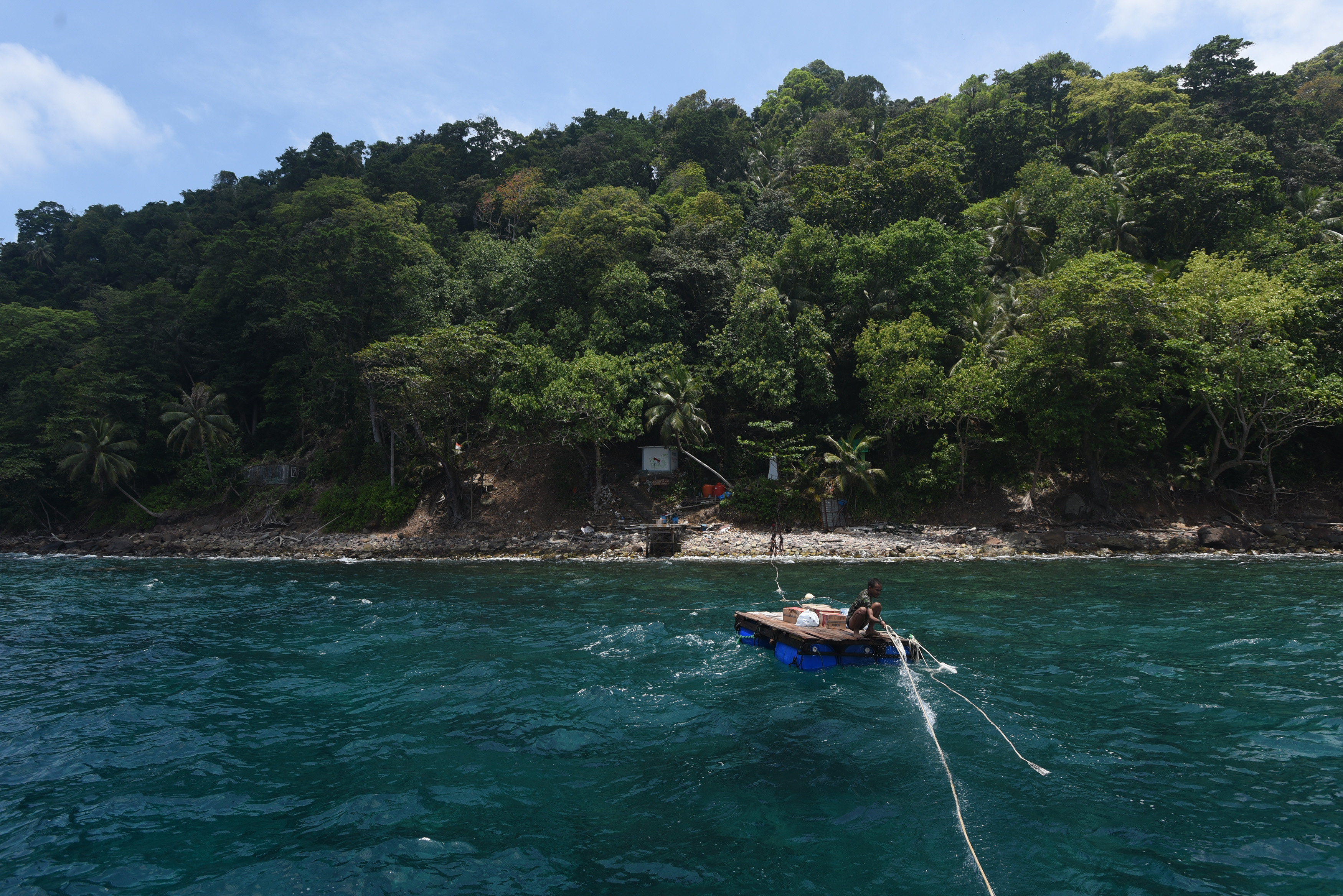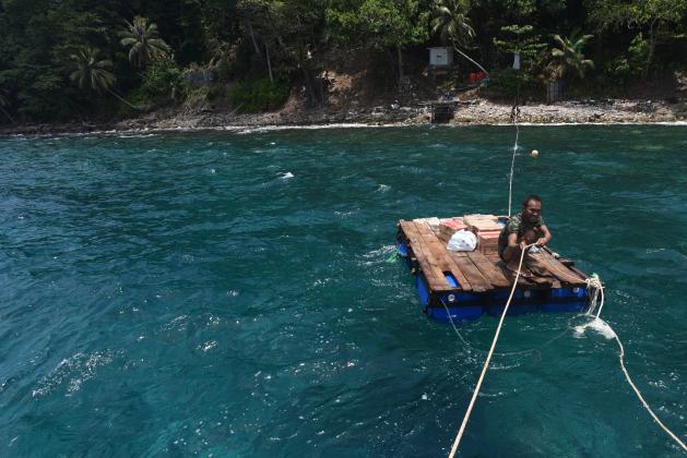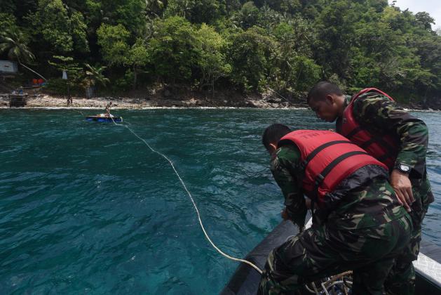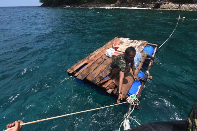Prajurit mengangkut logistik menggunakan rakit di dermaga Pulau Rondo, Aceh, Sabtu (16/4). Akibat rusaknya dermaga dan sulitnya menjangkau daratan di pulau tersebut, distribusi logistik untuk petugas di pulau terluar itu terpaksa dilakukan dengan menggunakan rakit. ANTARA FOTO/Zabur Karuru/foc/16.