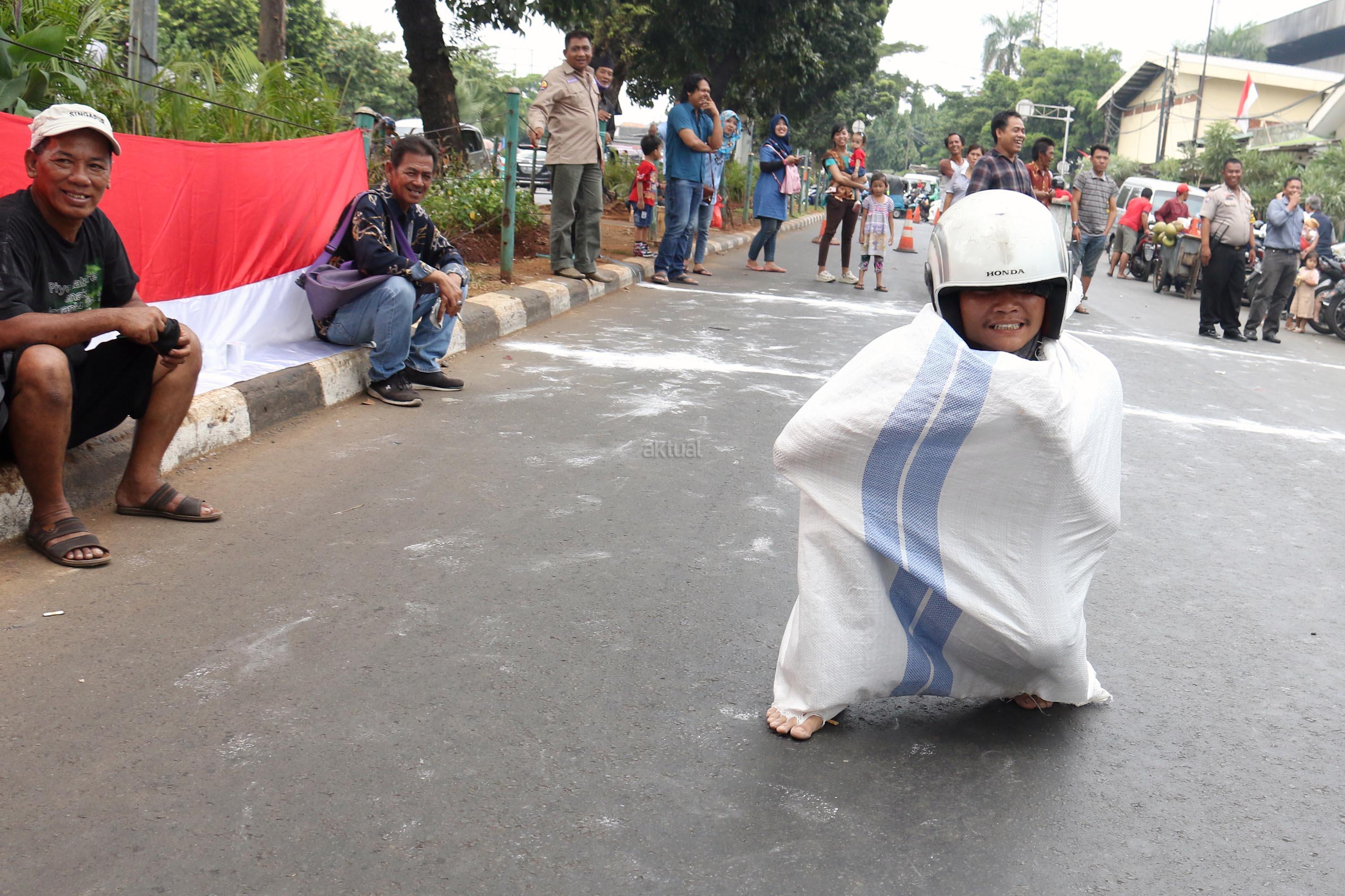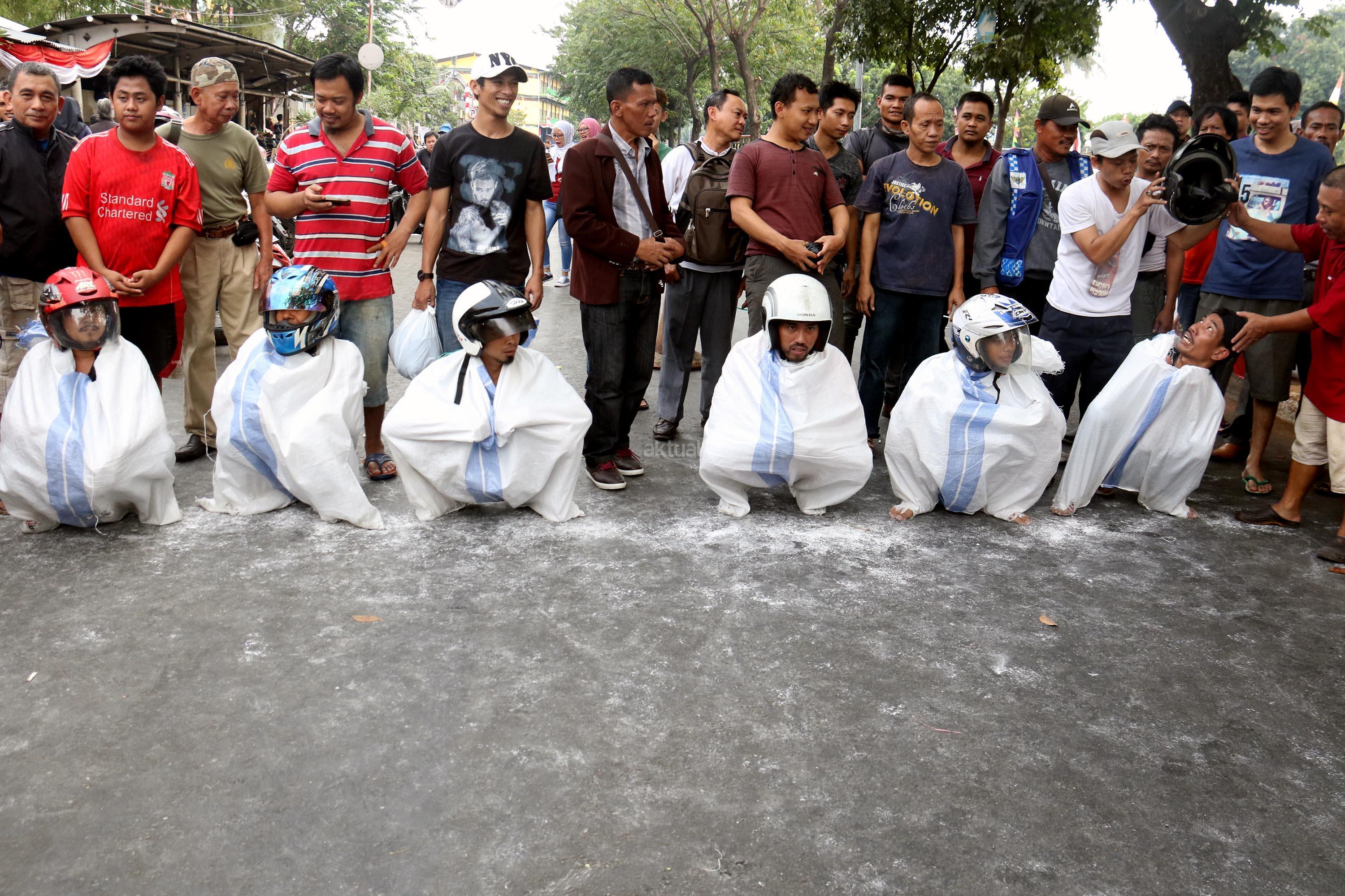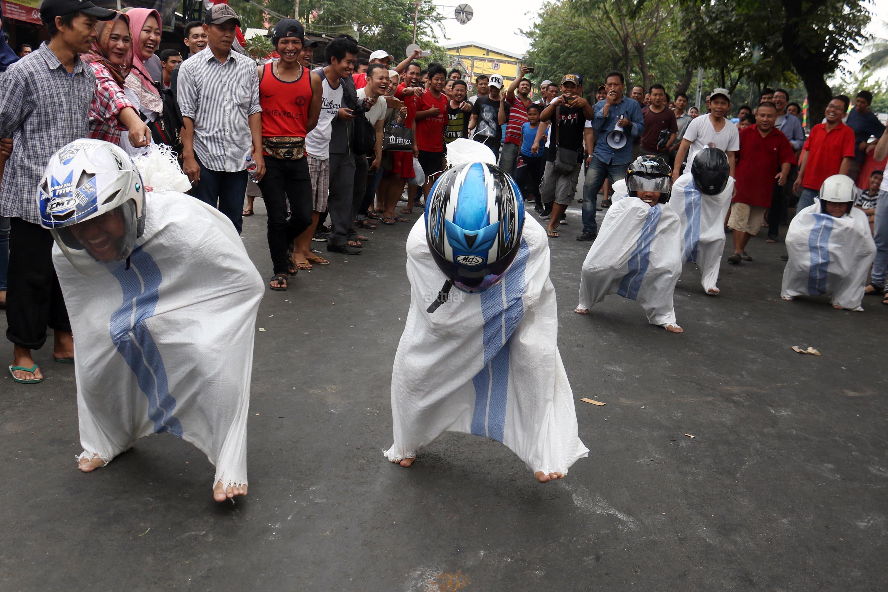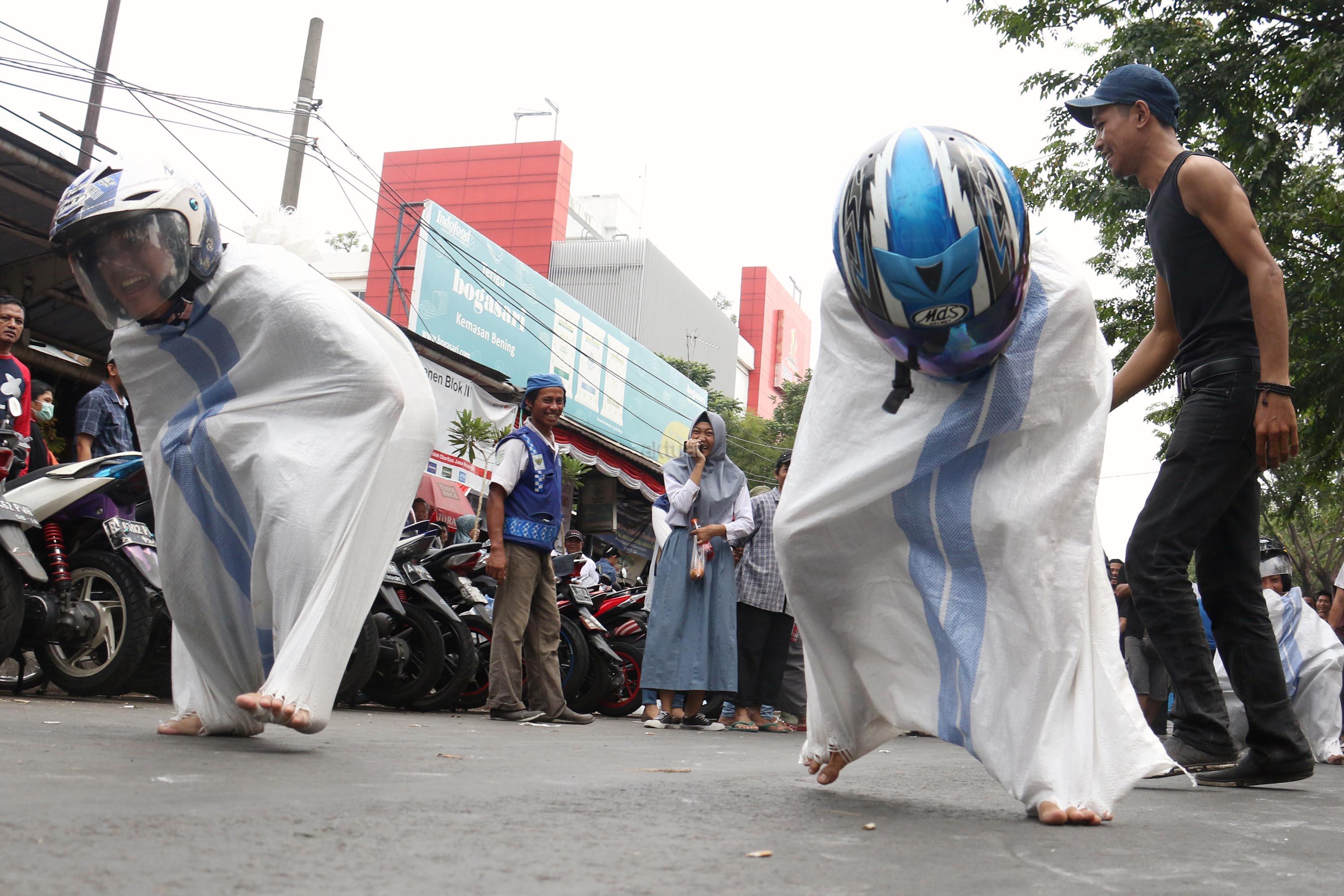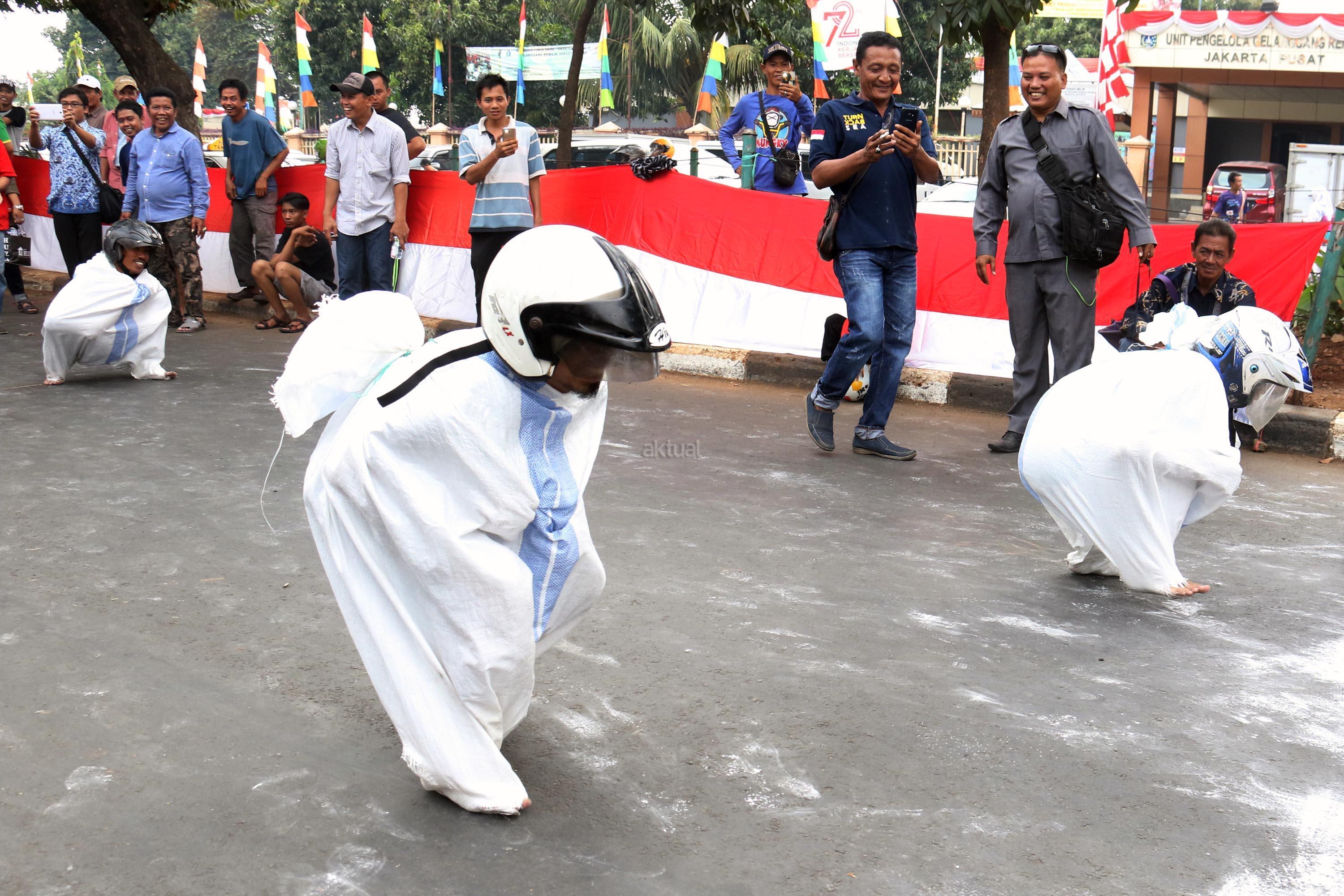 Semangat para pedagang pasar Senen saat mengikuti lomba balap karung di Jakarta, Kamis (17/8/2017). Para pedagang Blok E pasar Senen mengikuti beberapa lomba ketangkasan dalam memeriahkan HUT ke-72 RI. AKTUAL/Munzir