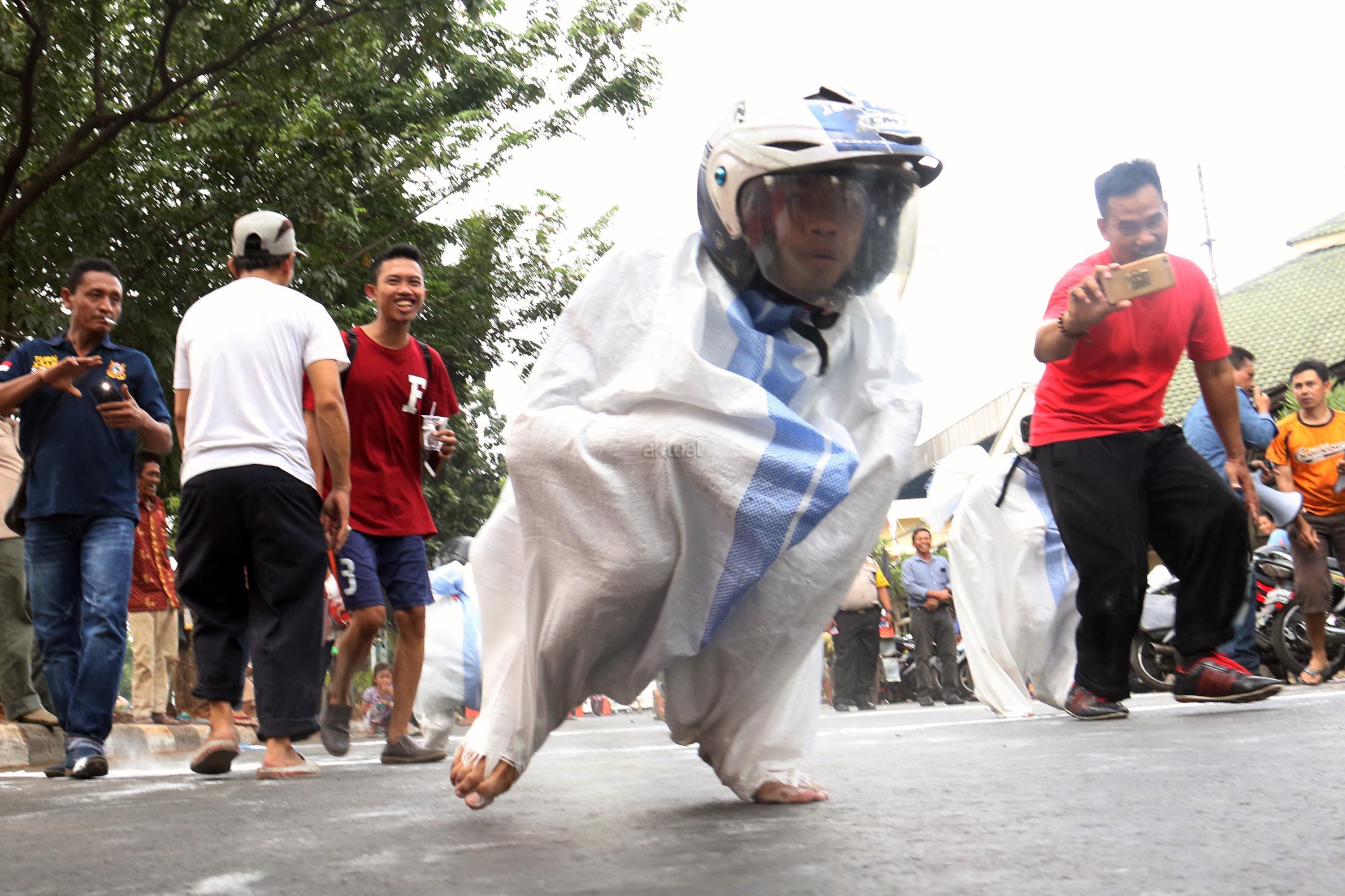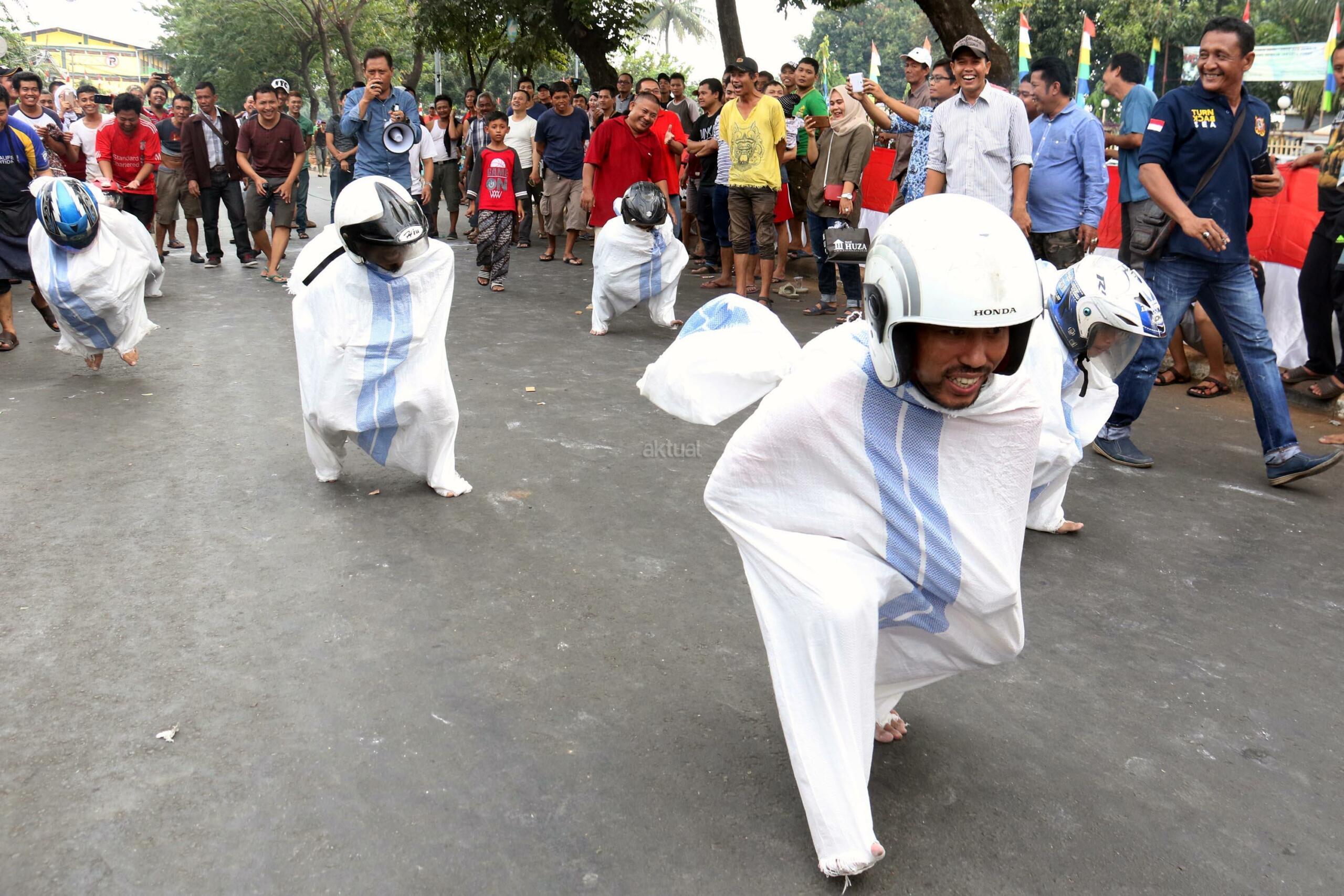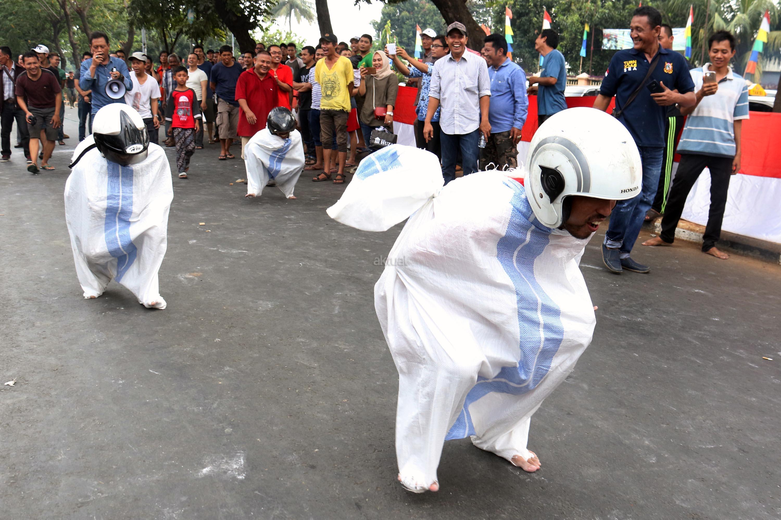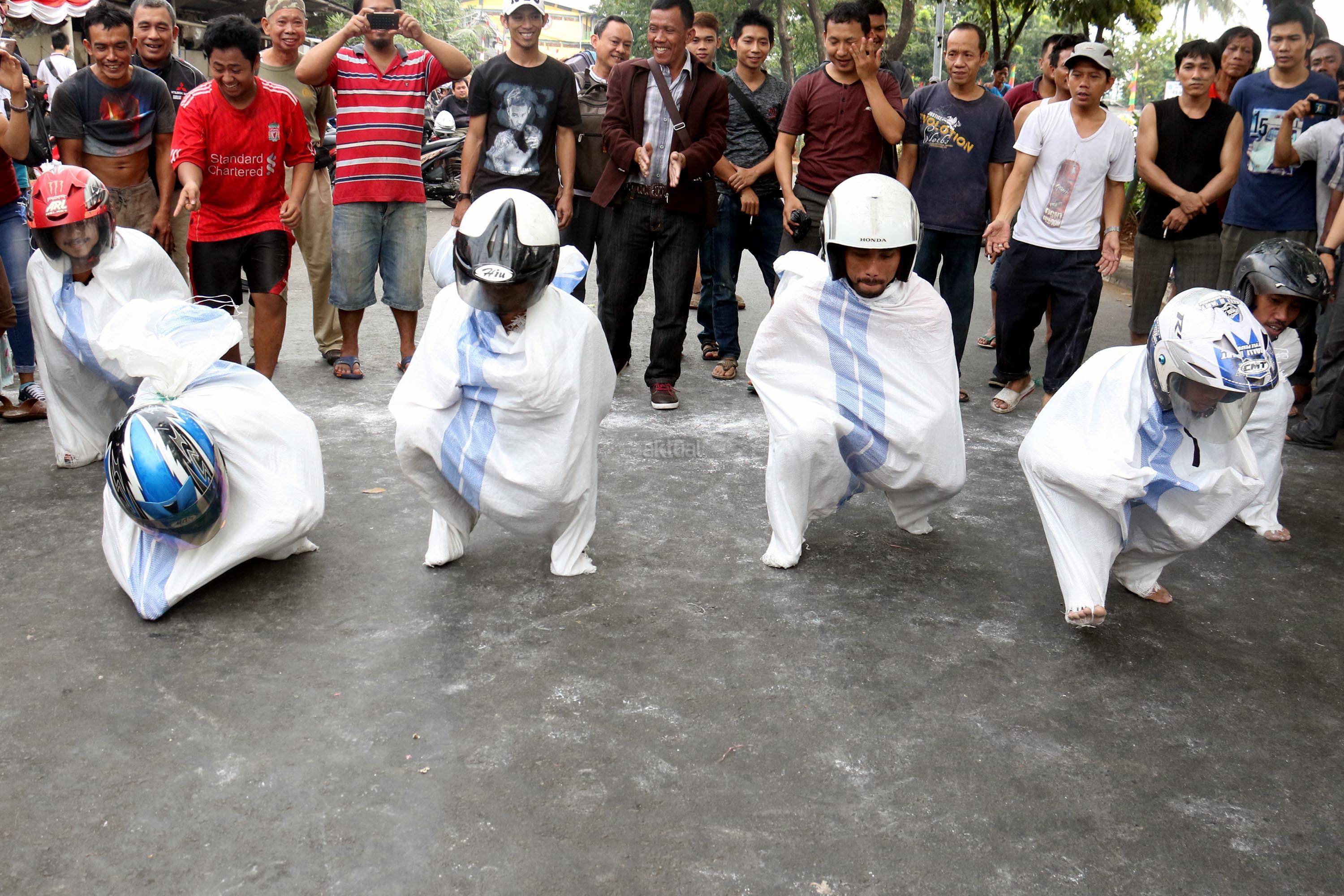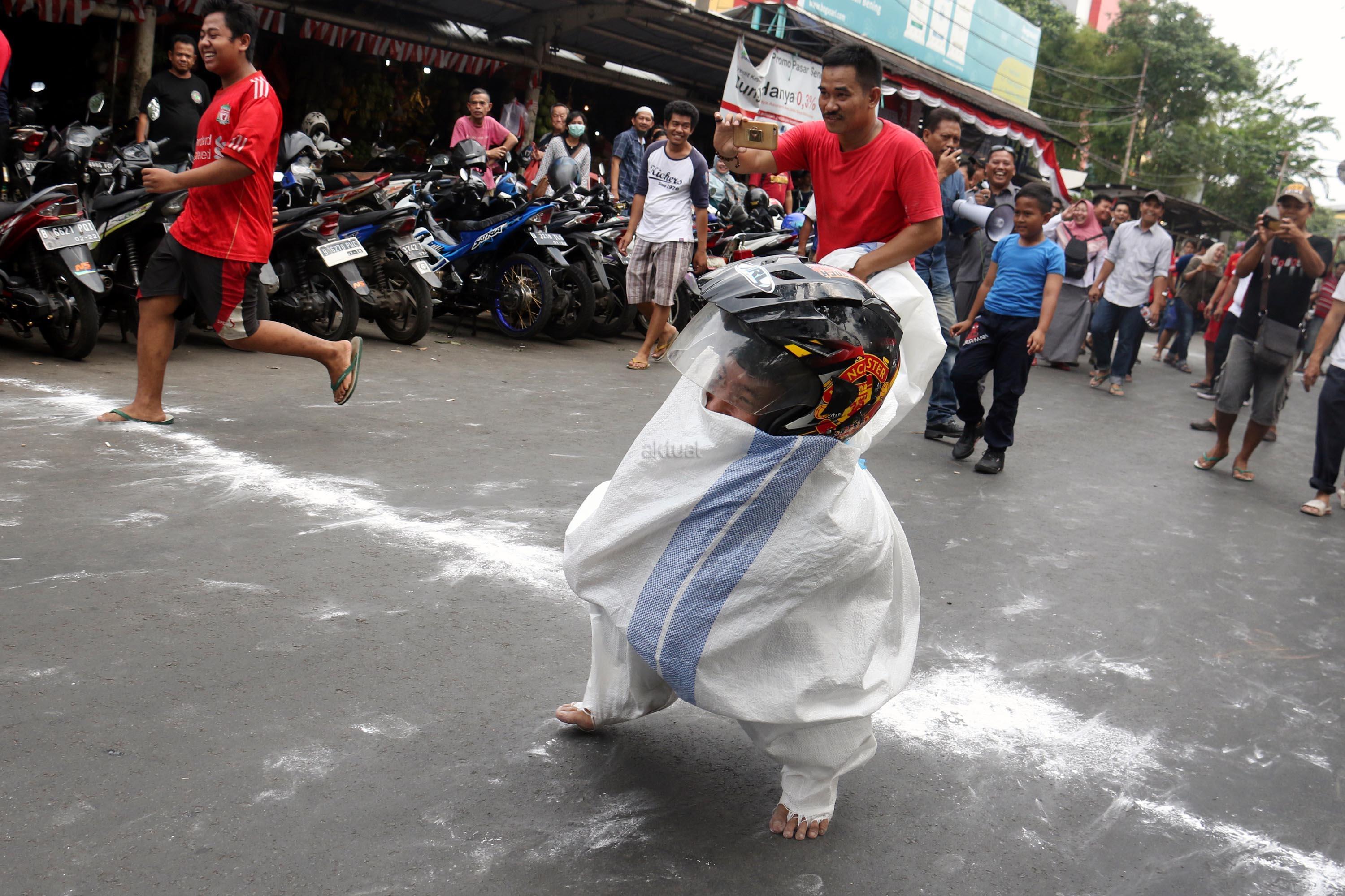 Semangat para pedagang pasar Senen saat mengikuti lomba balap karung di Jakarta, Kamis (17/8/2017). Para pedagang Blok E pasar Senen mengikuti beberapa lomba ketangkasan dalam memeriahkan HUT ke-72 RI. AKTUAL/Munzir