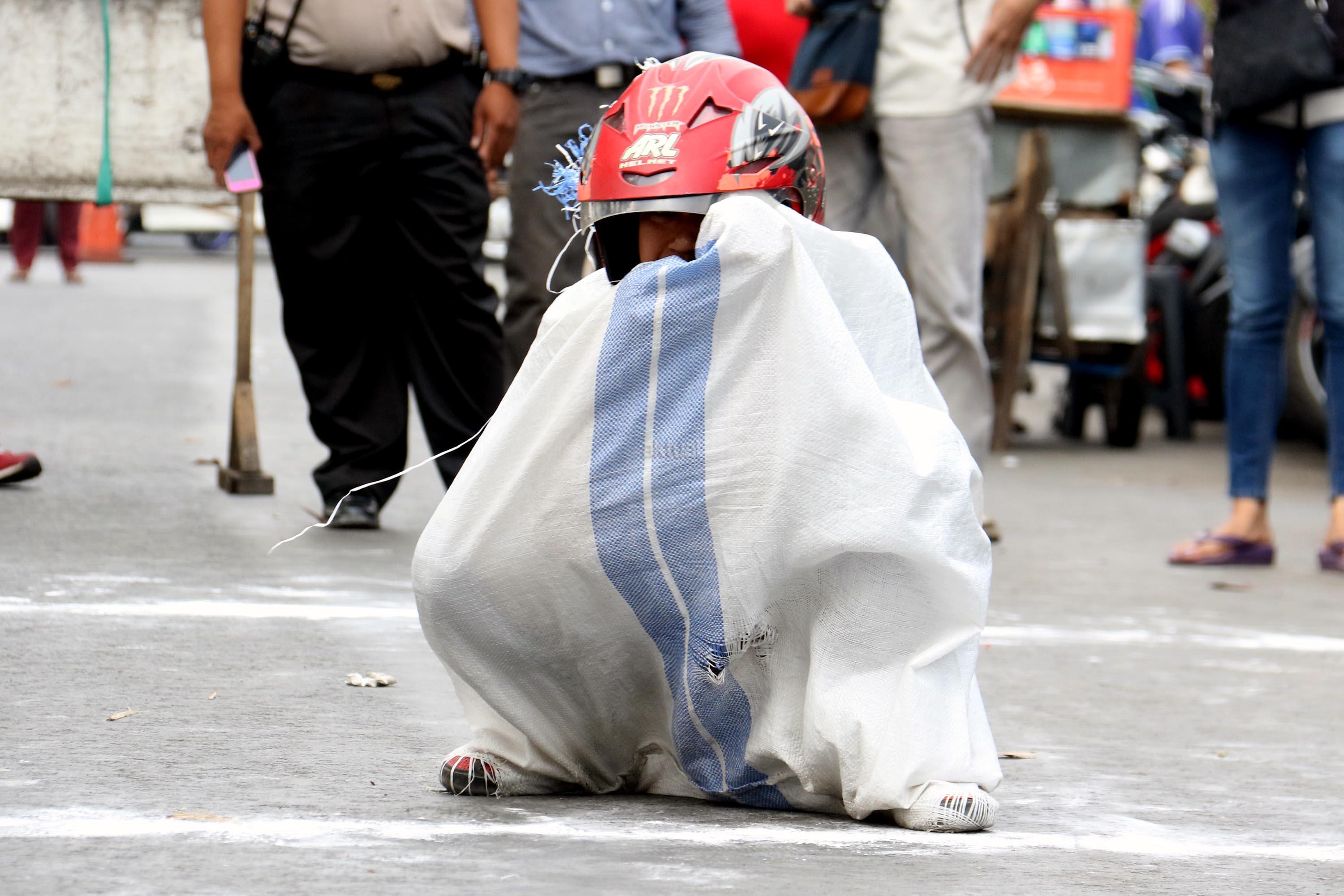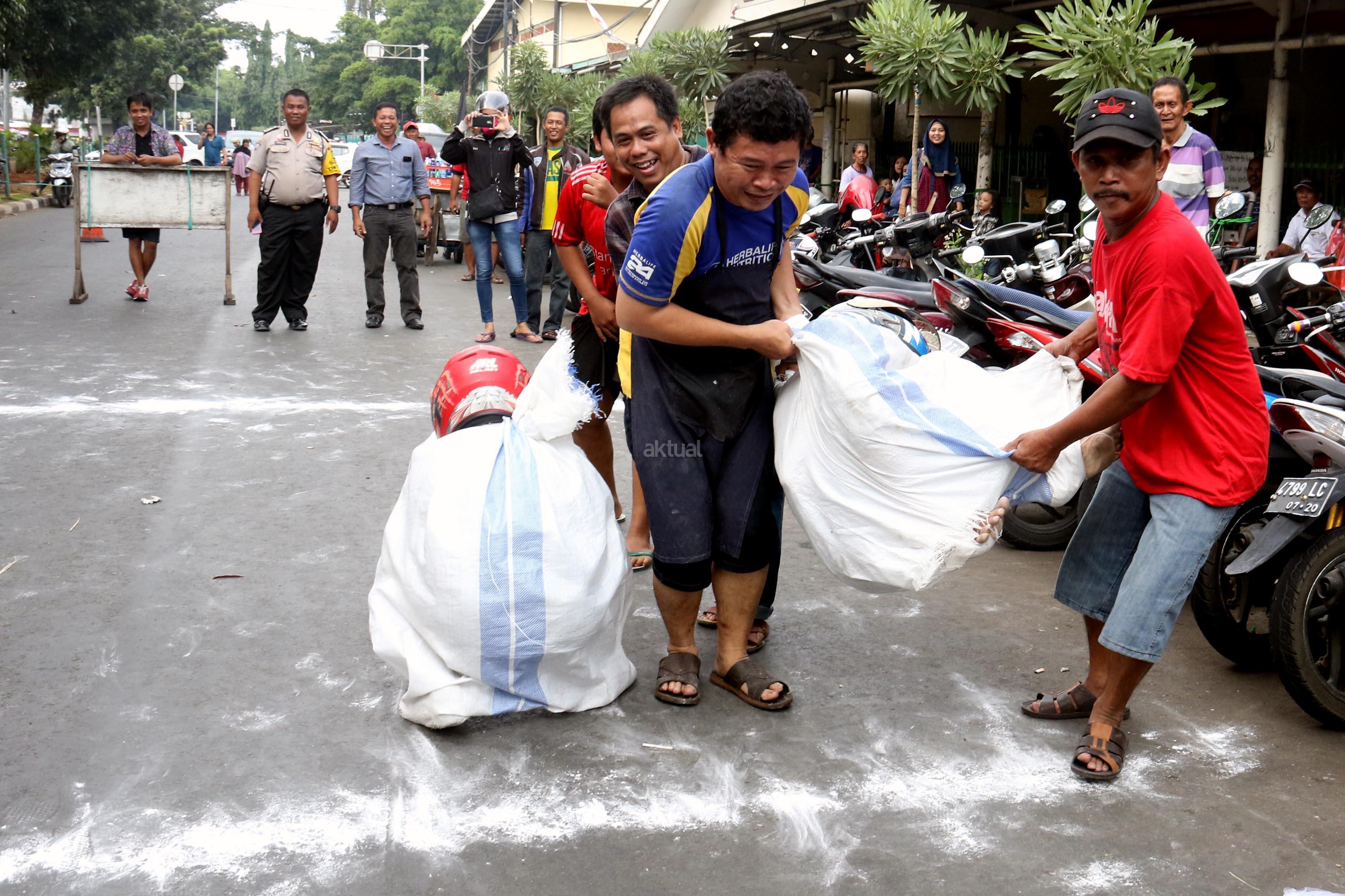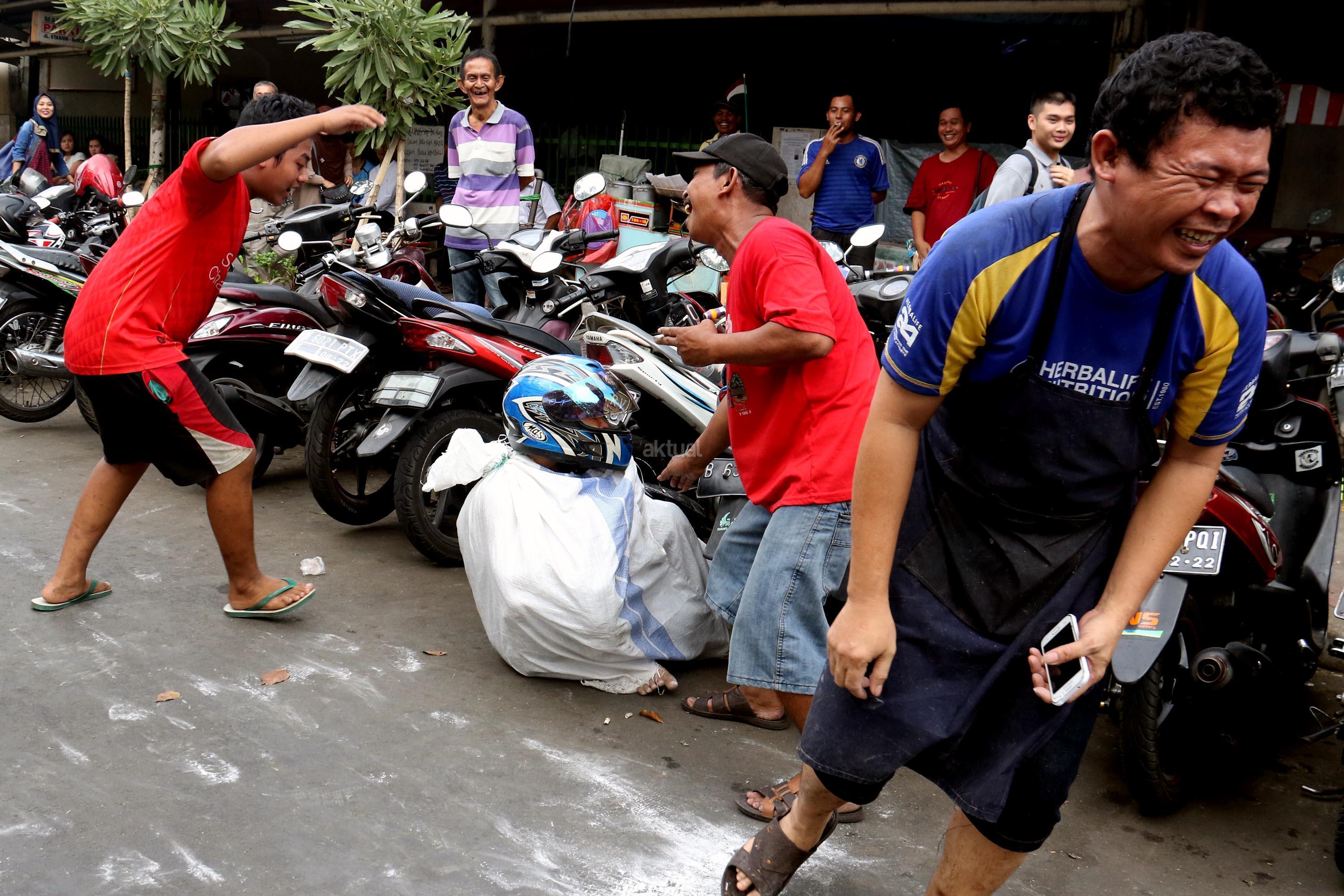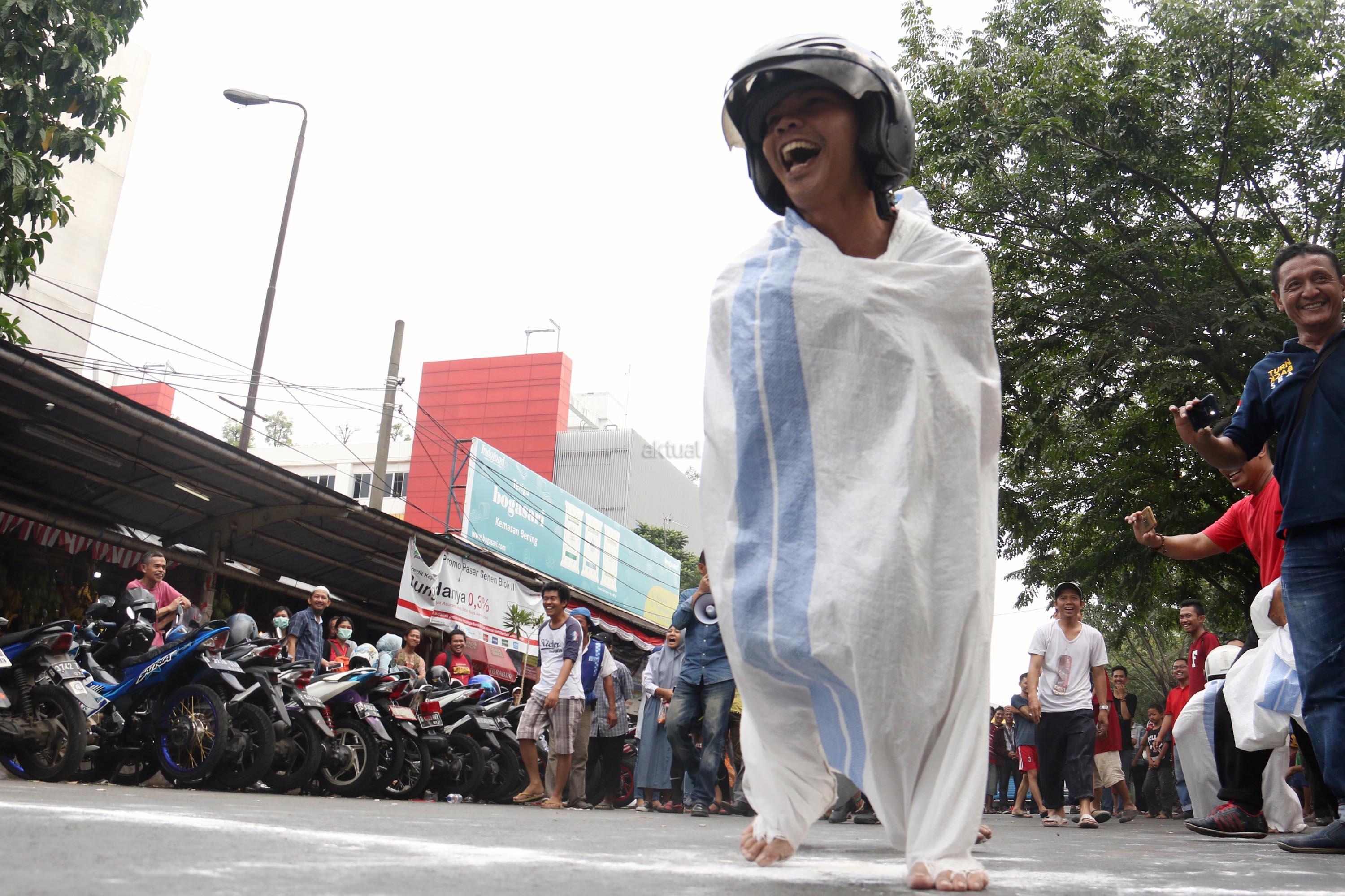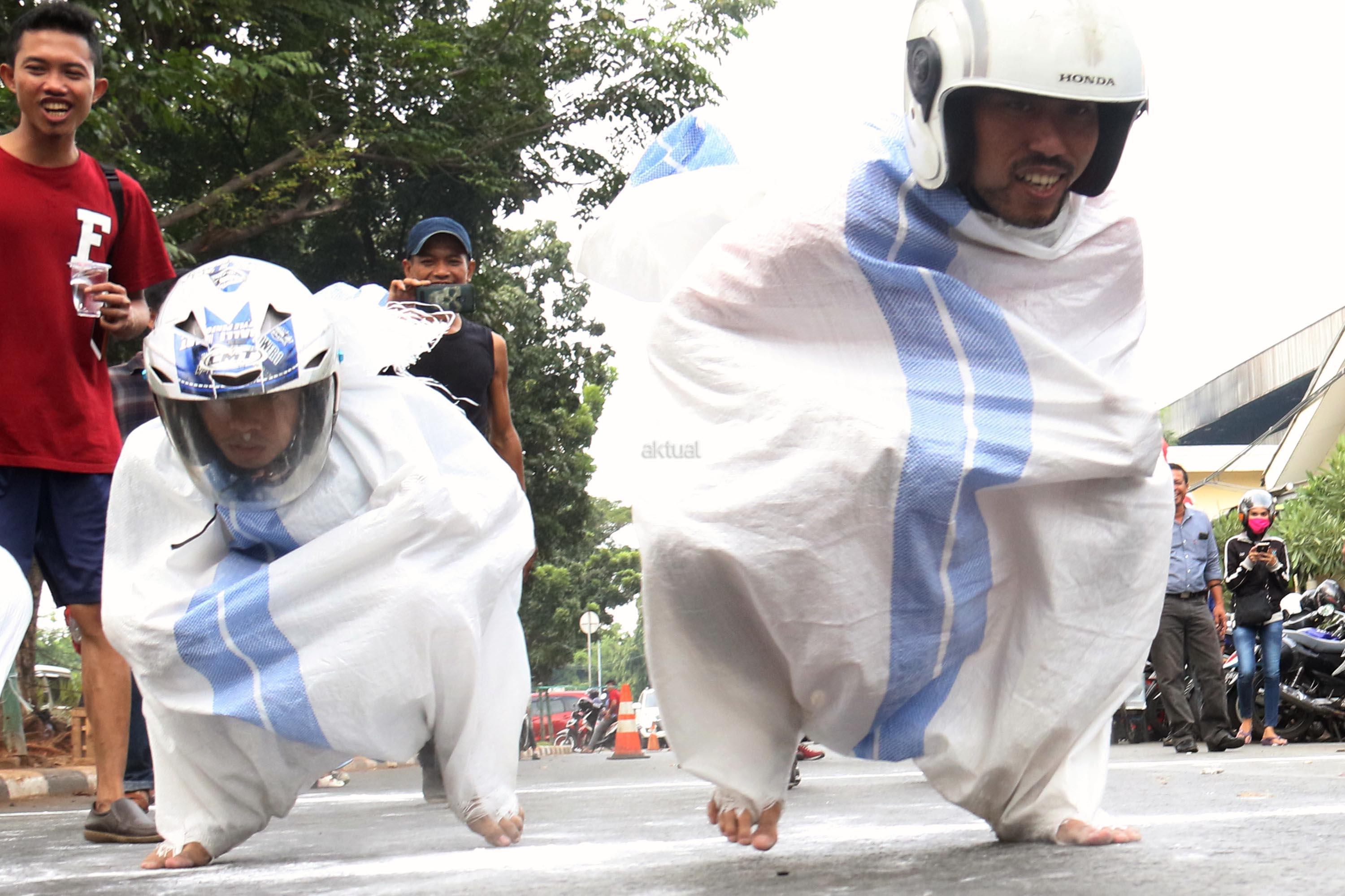 Semangat para pedagang pasar Senen saat mengikuti lomba balap karung di Jakarta, Kamis (17/8/2017). Para pedagang Blok E pasar Senen mengikuti beberapa lomba ketangkasan dalam memeriahkan HUT ke-72 RI. AKTUAL/Munzir
