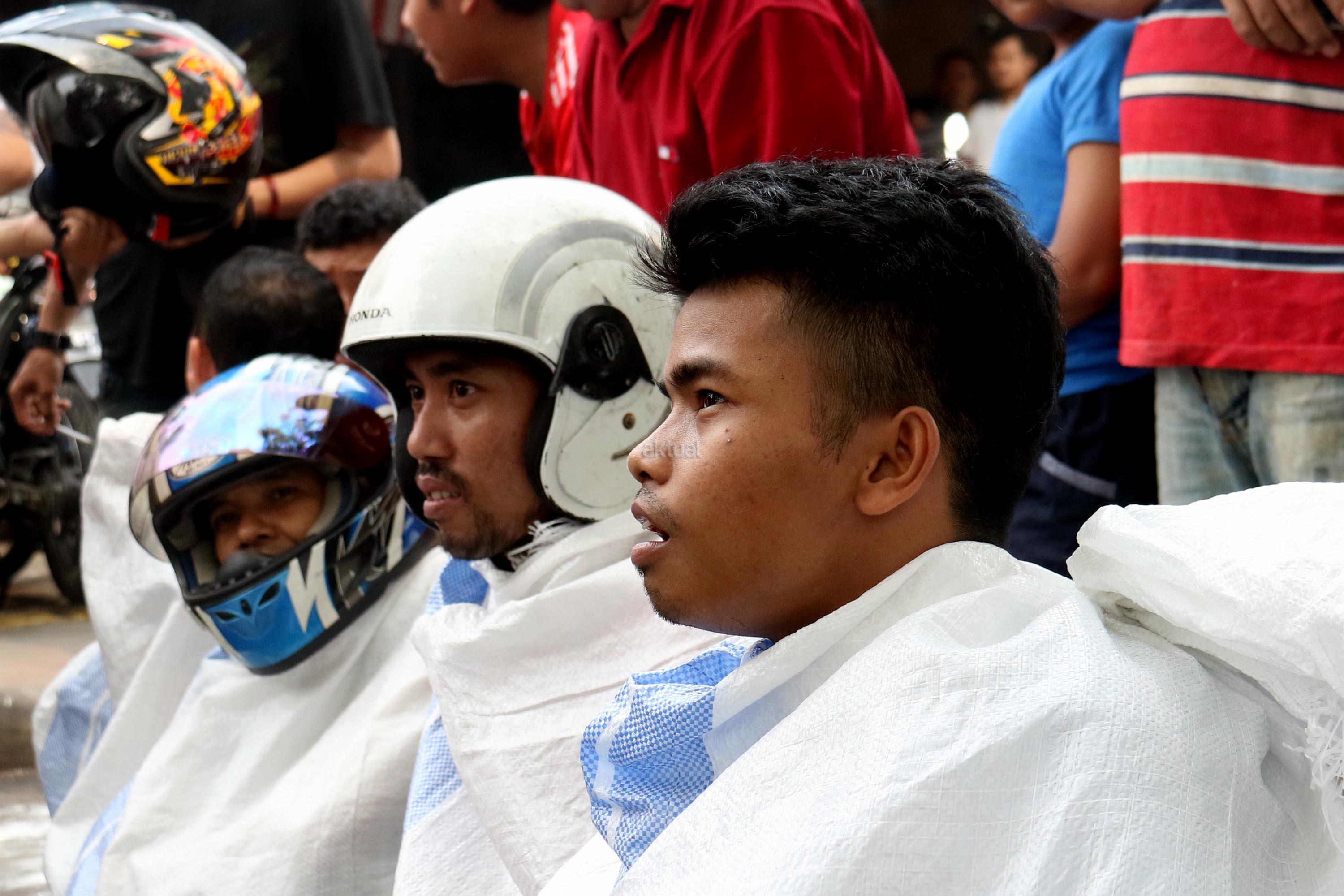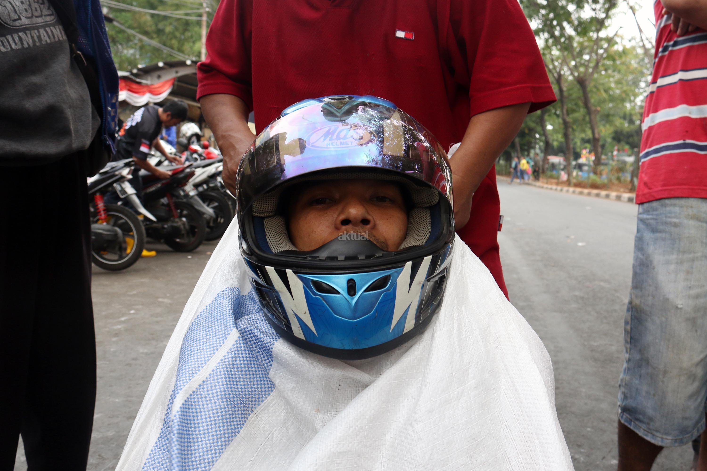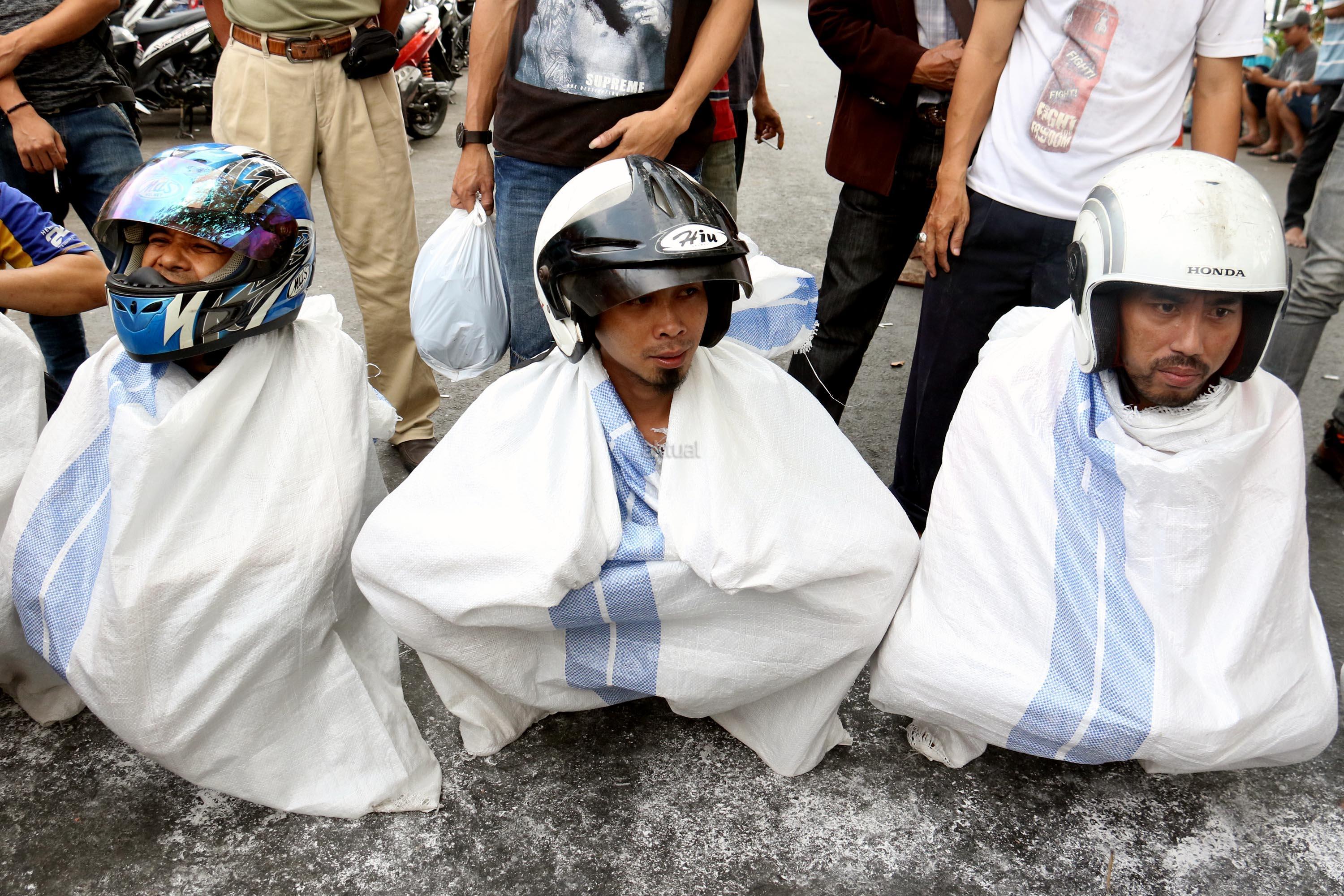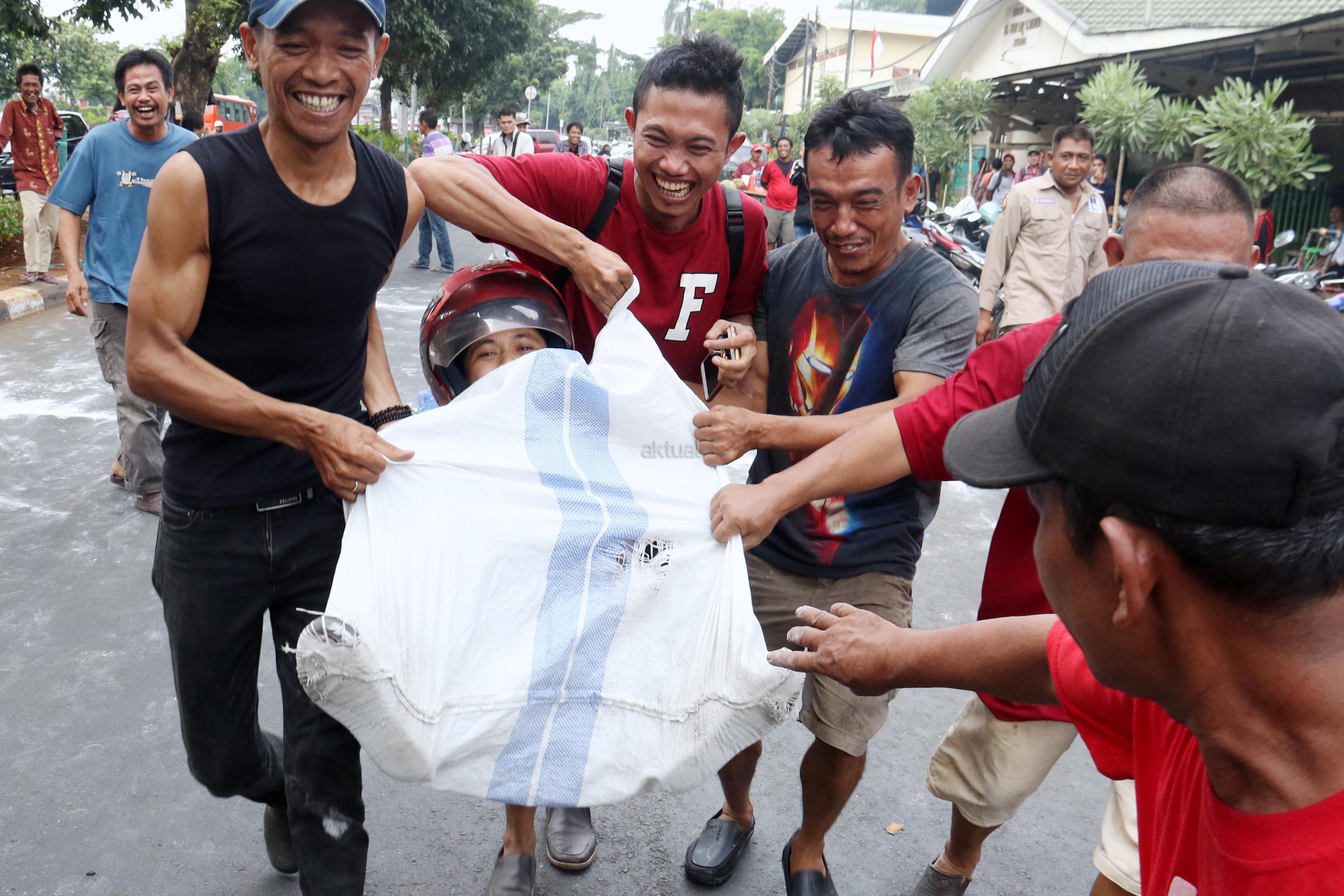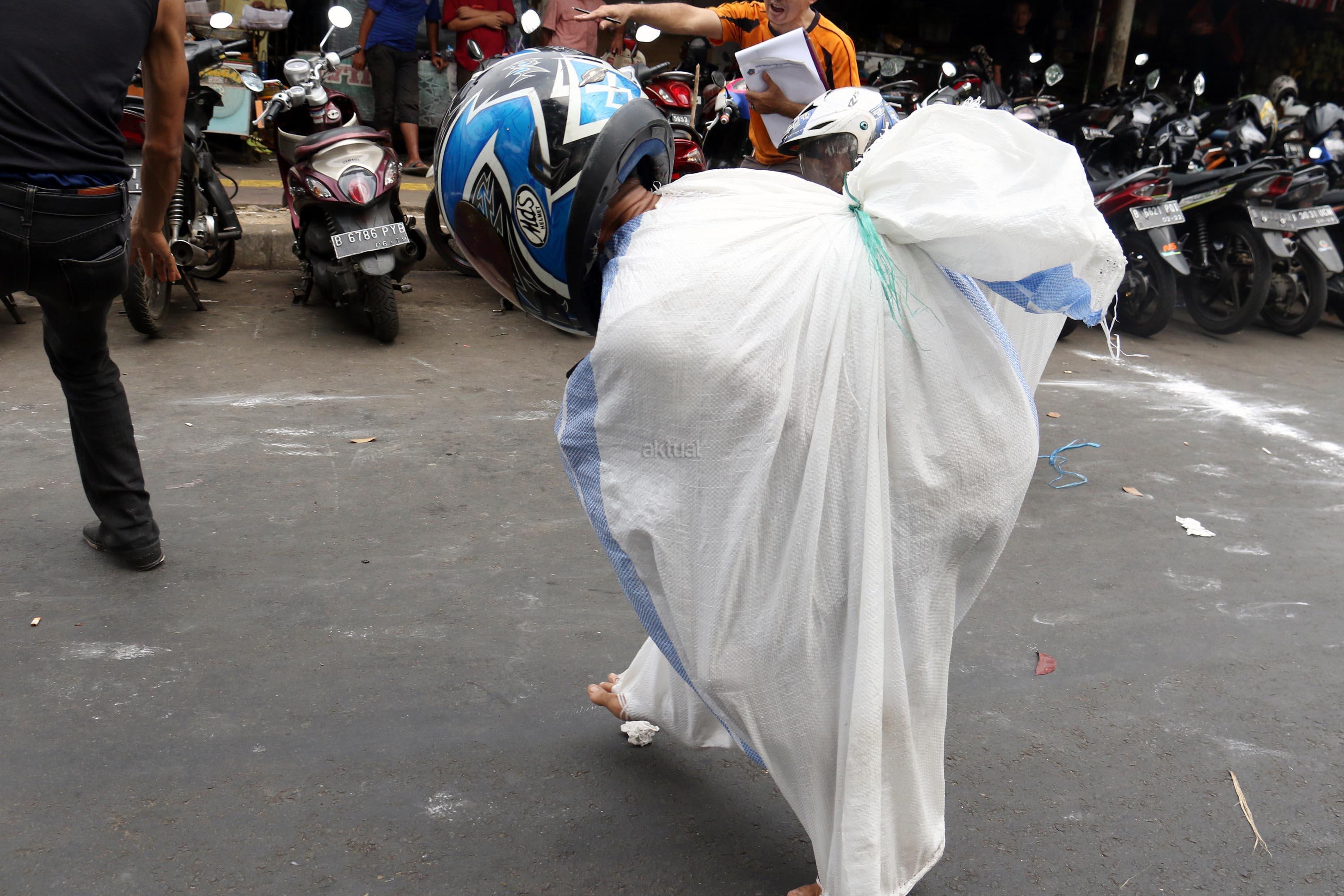 Semangat para pedagang pasar Senen saat mengikuti lomba balap karung di Jakarta, Kamis (17/8/2017). Para pedagang Blok E pasar Senen mengikuti beberapa lomba ketangkasan dalam memeriahkan HUT ke-72 RI. AKTUAL/Munzir