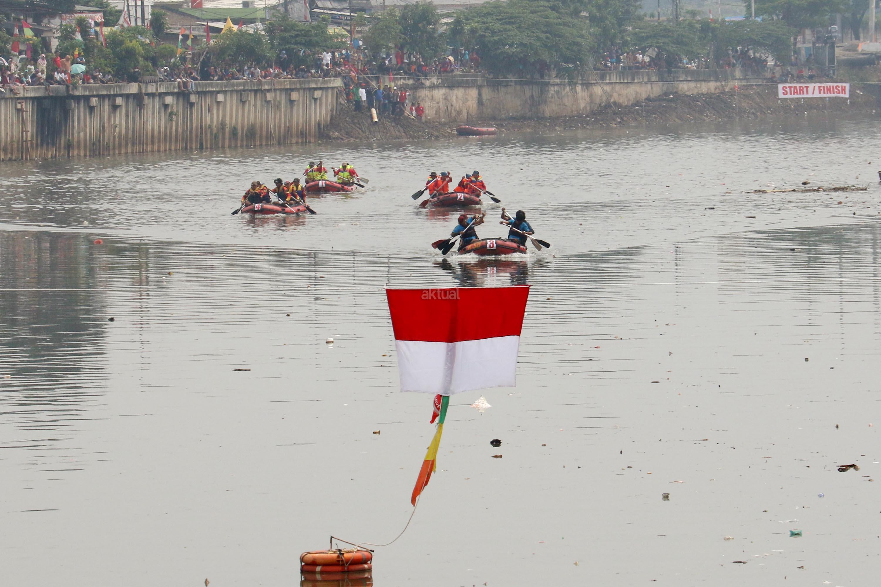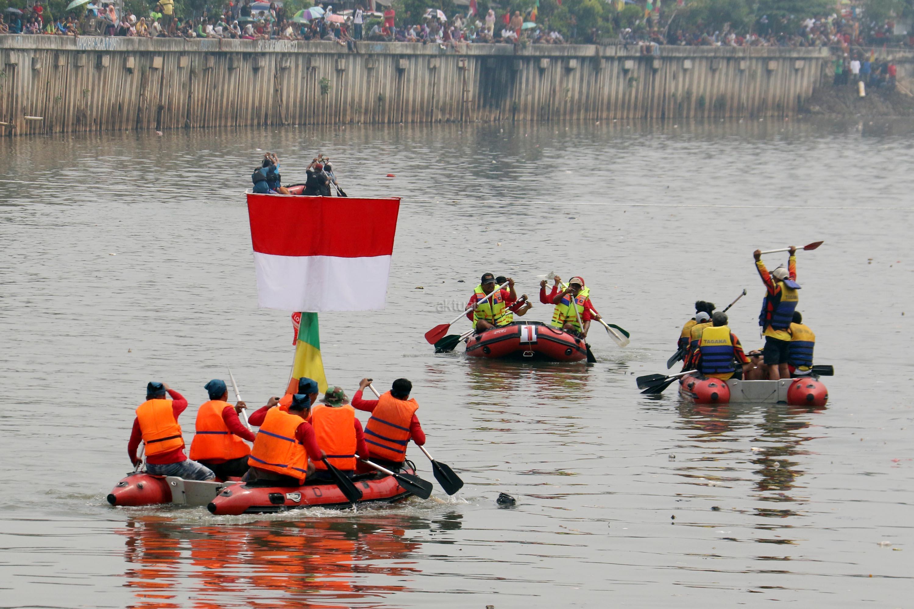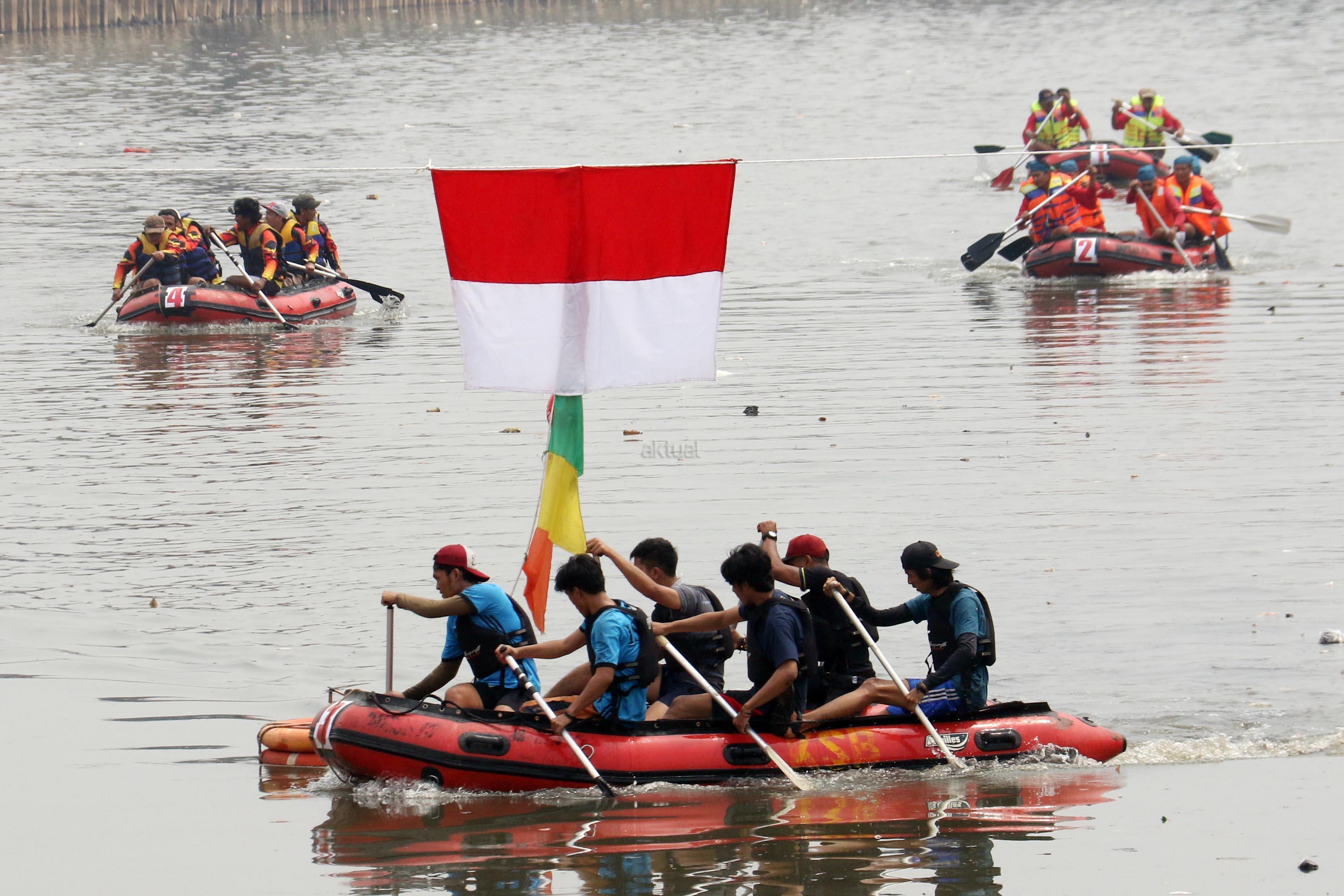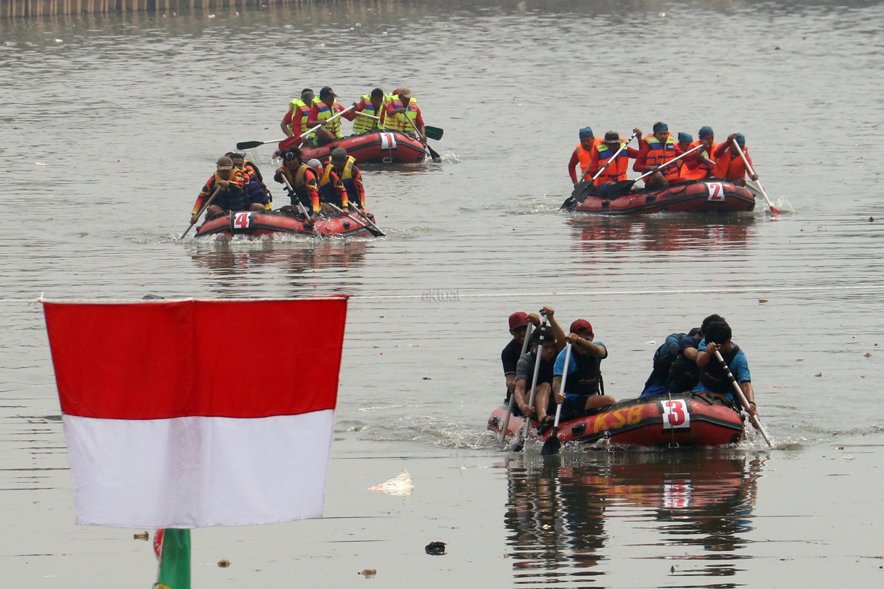 Peserta beradu cepat saat lomba dayung perahu karet saat mengikuti lomba dayung dalam memperingati HUT RI Ke-72 di kali Cengkareng Drain,Banjir Kanal Barat (BKB), Jakarta Barat, Minggu (20/8/2017). Lomba dayung perahu karet mengajak peserta menjunjung tinggi sportifitas dalam berolahraga dengan baik karena kegiatan lomba ini merupakan ajang persahabatan sekaligus memupuk persatuan dan kesatuan sebagai penerus bangsa. AKTUAL/Munzir