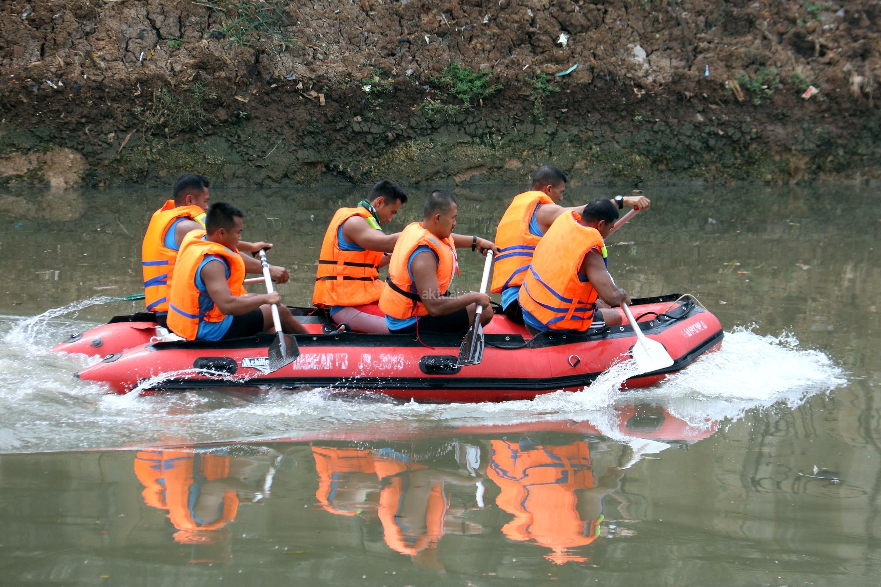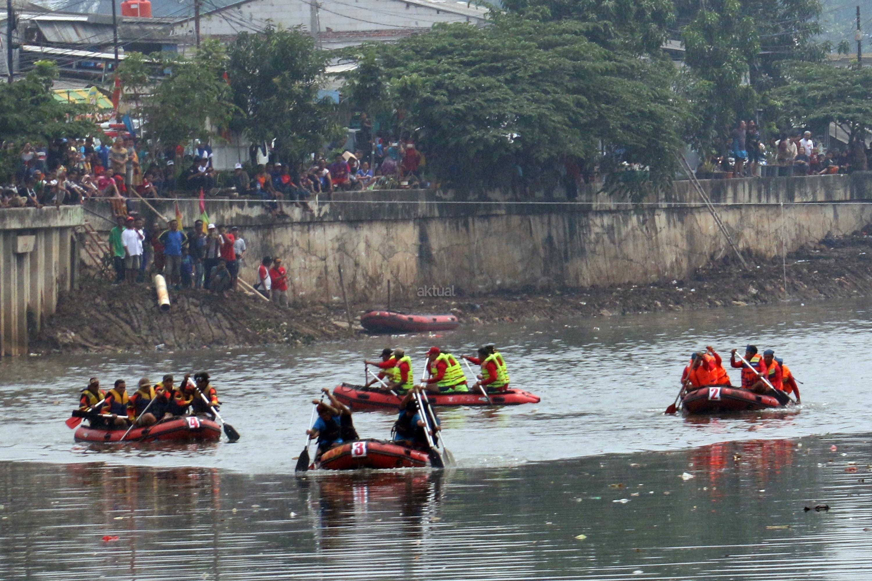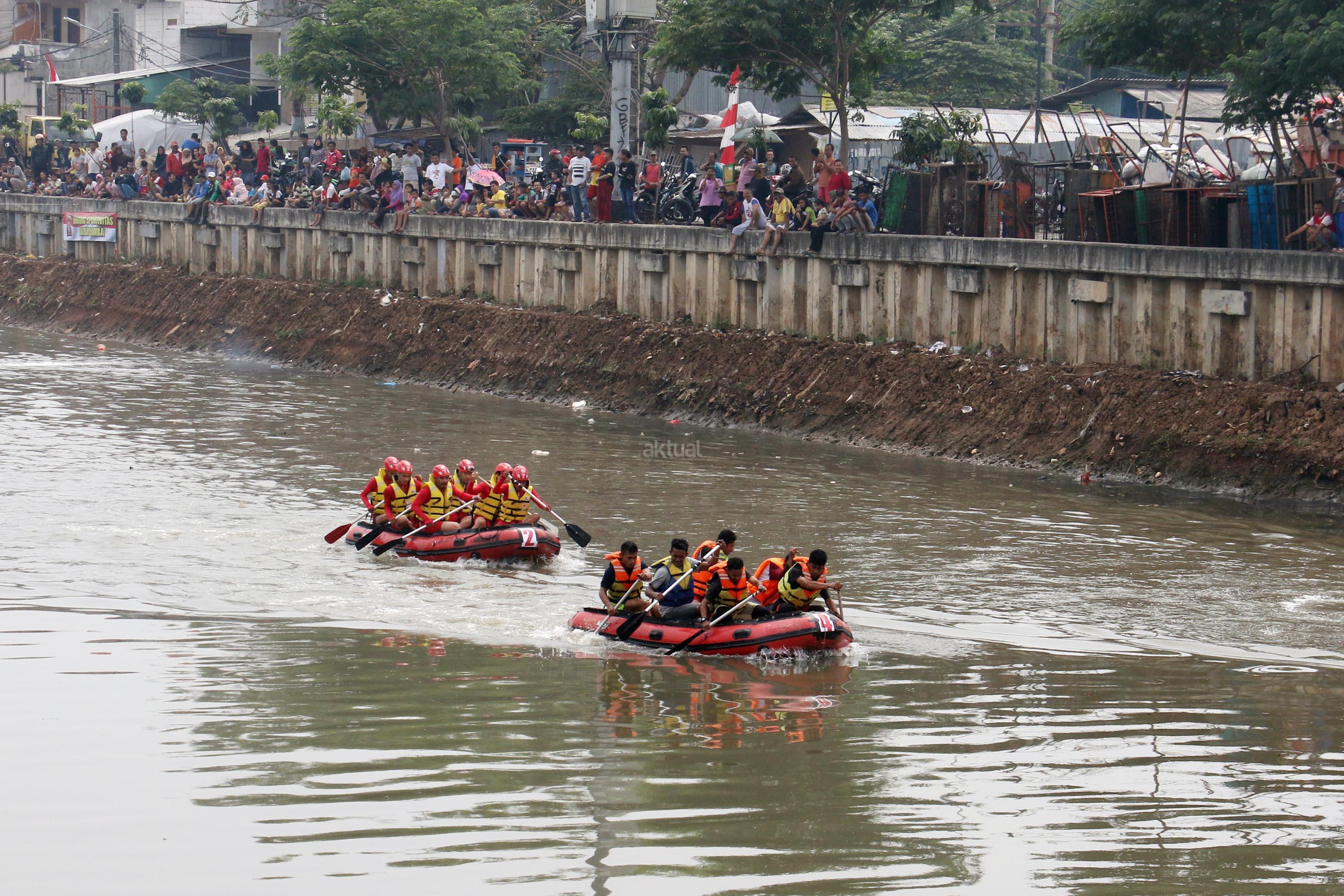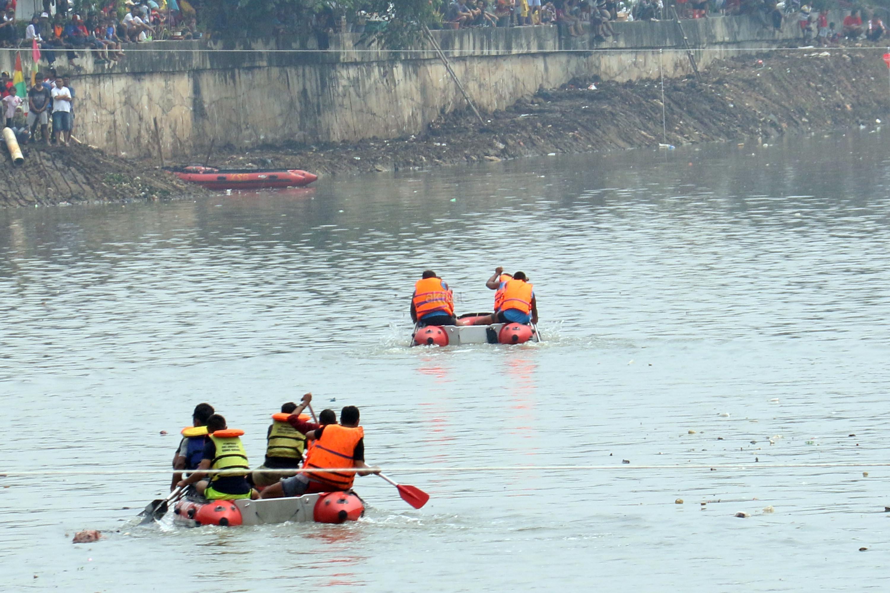Peserta beradu cepat saat lomba dayung perahu karet saat mengikuti lomba dayung dalam memperingati HUT RI Ke-72 di kali Cengkareng Drain,Banjir Kanal Barat (BKB), Jakarta Barat, Minggu (20/8/2017). Lomba dayung perahu karet mengajak peserta menjunjung tinggi sportifitas dalam berolahraga dengan baik karena kegiatan lomba ini merupakan ajang persahabatan sekaligus memupuk persatuan dan kesatuan sebagai penerus bangsa. AKTUAL/Munzir