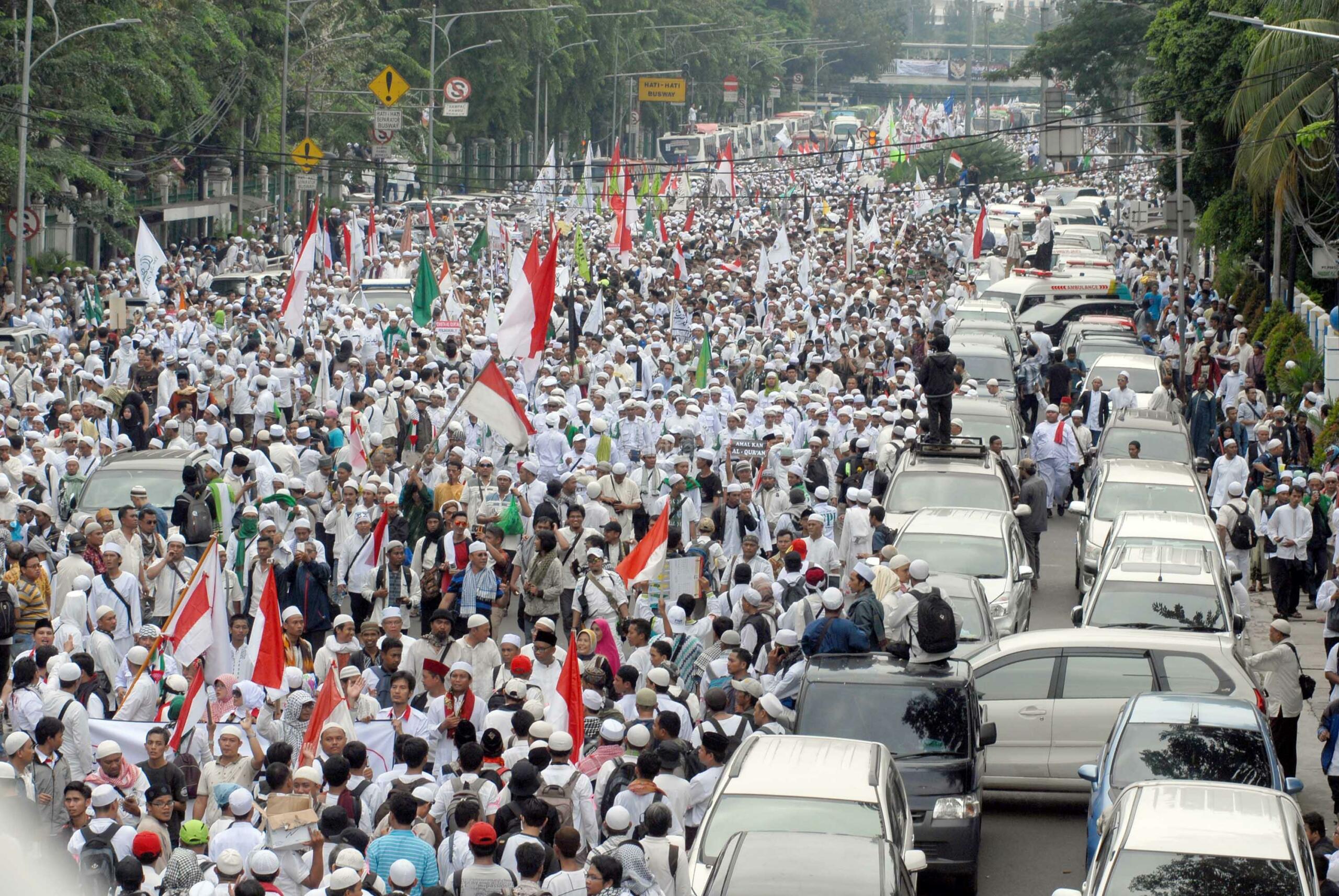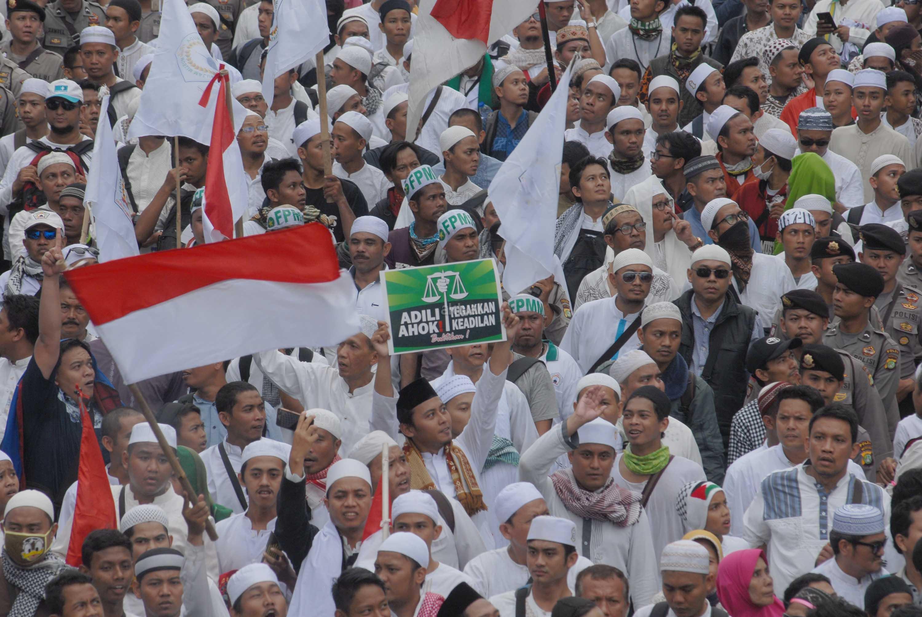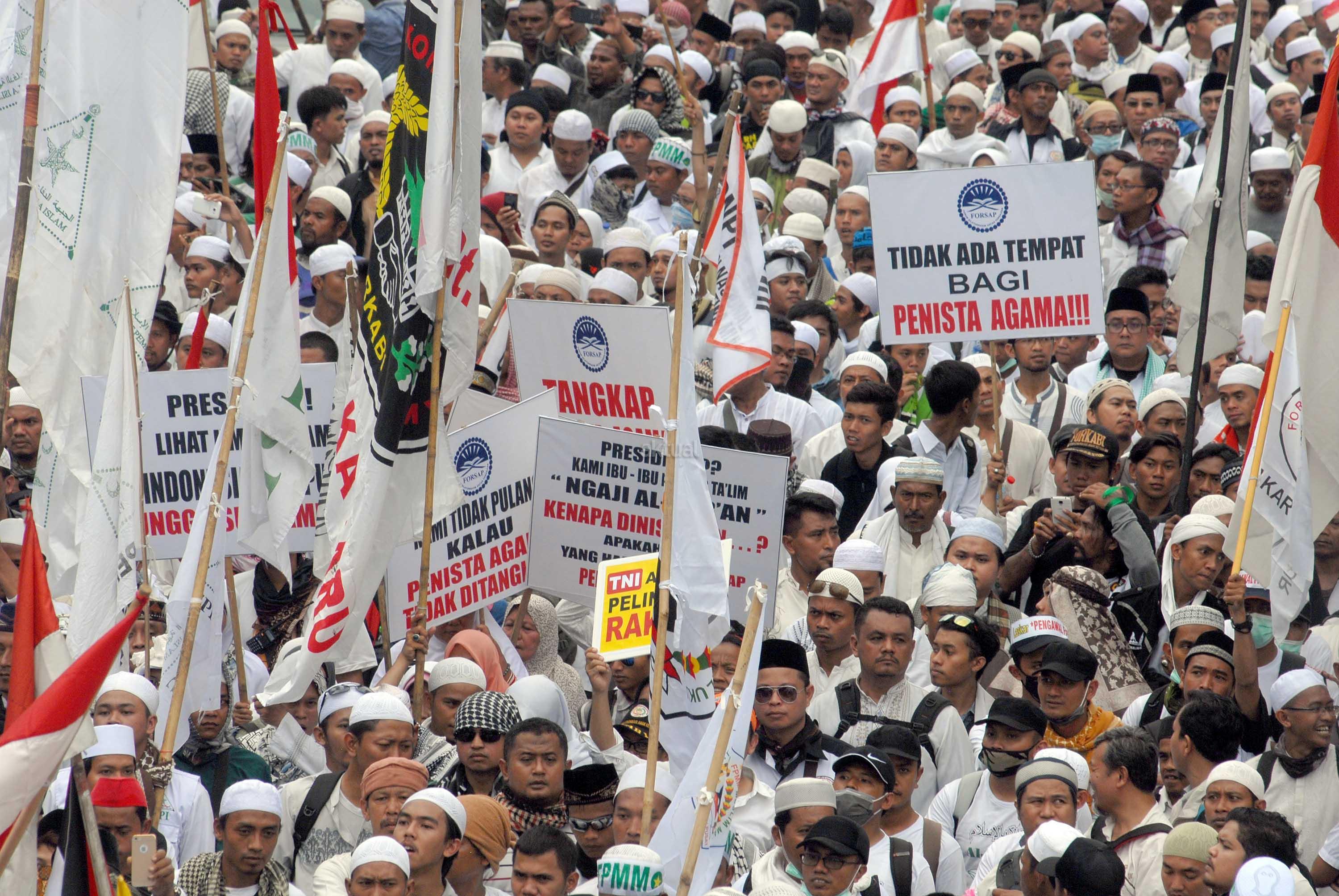 Ratusan ribu orang bergerak dari Masjid Istiqlal menuju Balai Kota dan memadati kawasan Bundaran Air Mancur Patung Kuda di Jakarta, Jumat (4/11). Mereka berunjuk rasa menuntut pemerintah untuk mengusut kasus dugaan penistaan agama dengan terlapor Gubernur DKI Jakarta Basuki Tjahaja Purnama atau Ahok. AKTUAL/Eko Hilman
