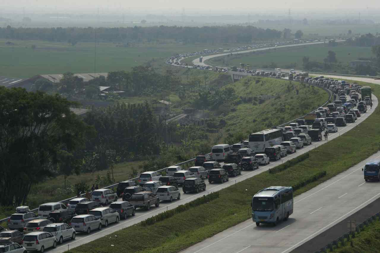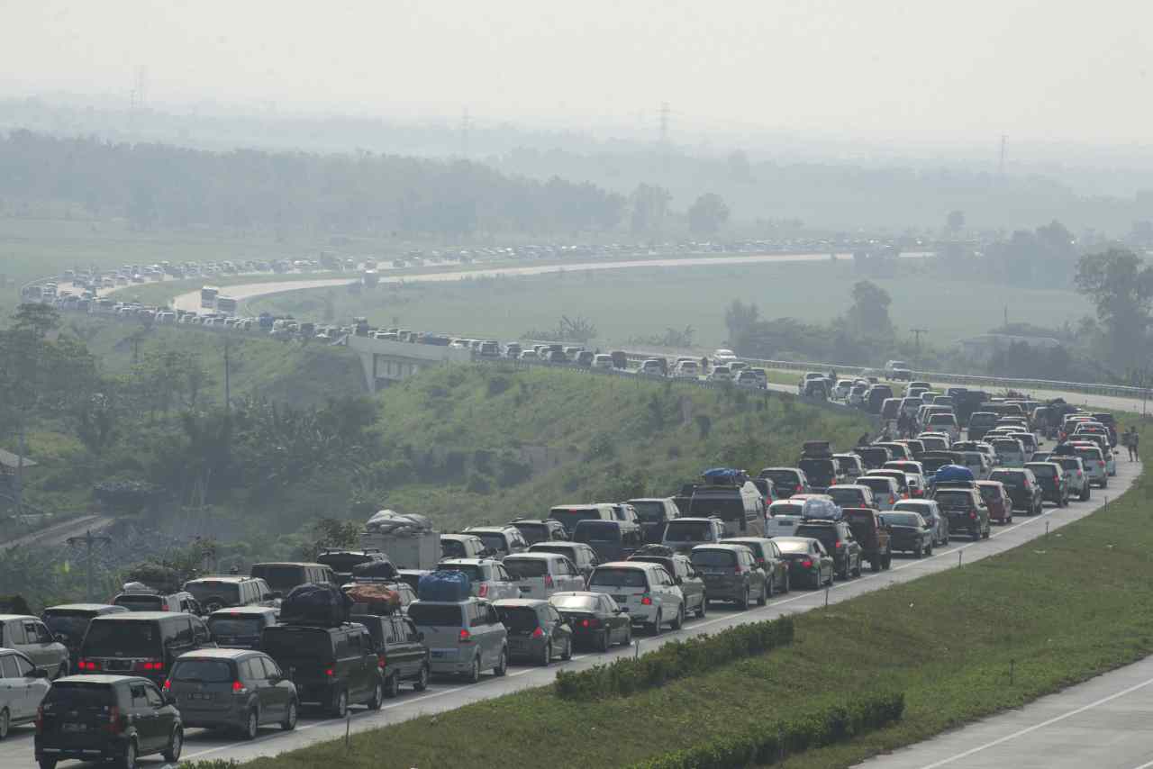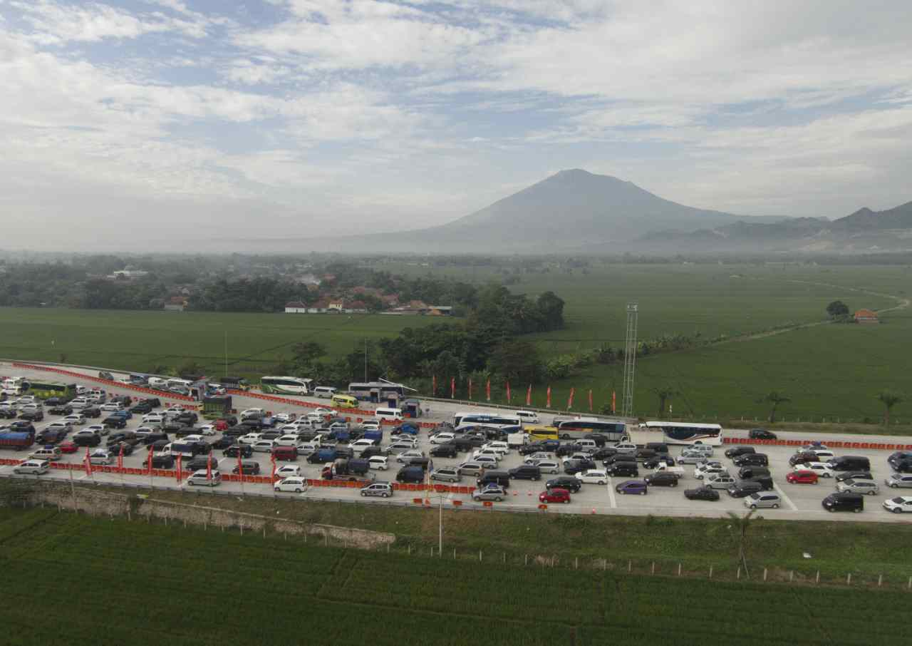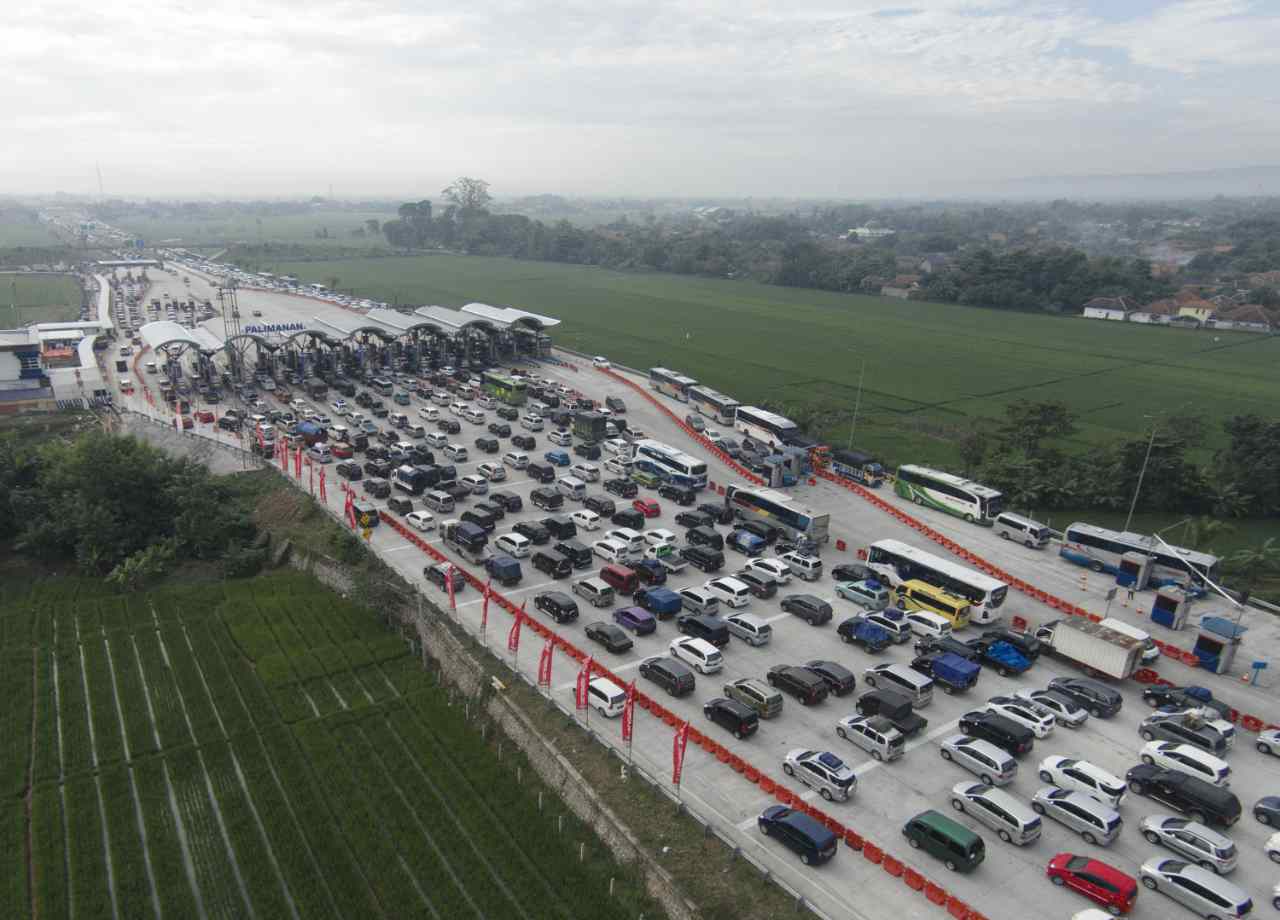 Foto aerial suasana kendaraan mengantre di pintu keluar tol Palimanan, Cirebon, Jawa Barat, Sabtu (2/7). Sebanyak 23 loket pembayaran dibuka untuk mengantisipasi kepadatan kendaraan di pintu tol pada H-4 Lebaran yang menjadi puncak mudik. ANTARA FOTO/Rosa Panggabean/foc/16.