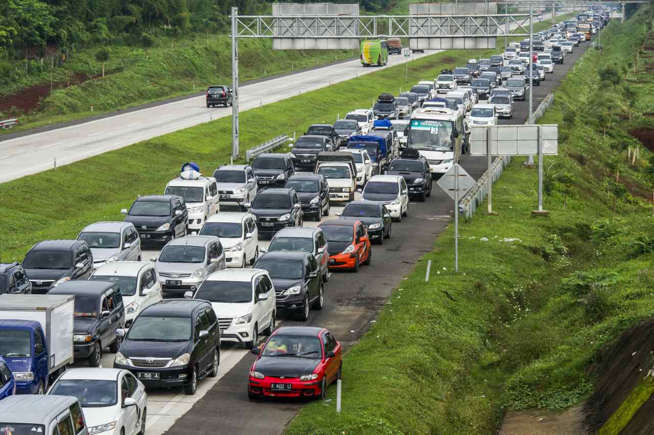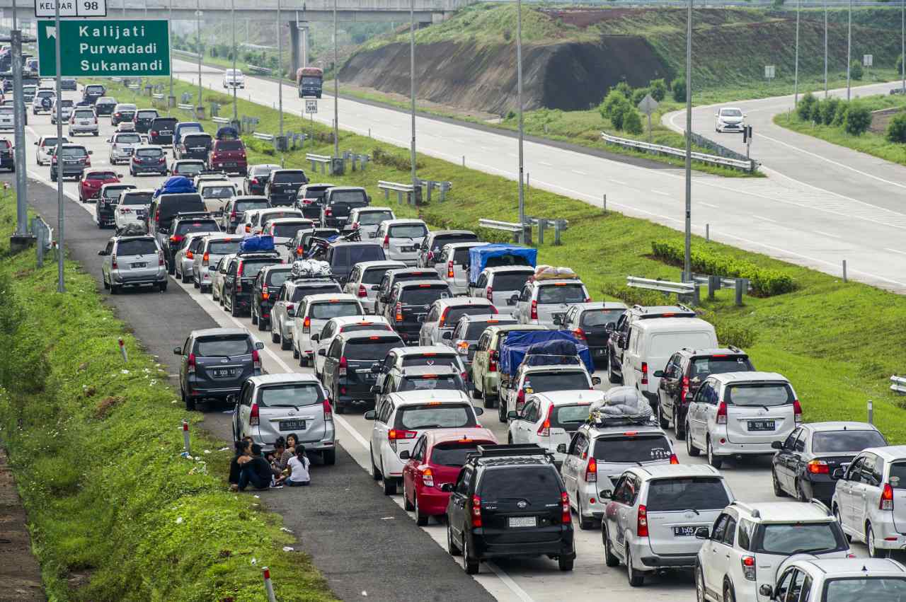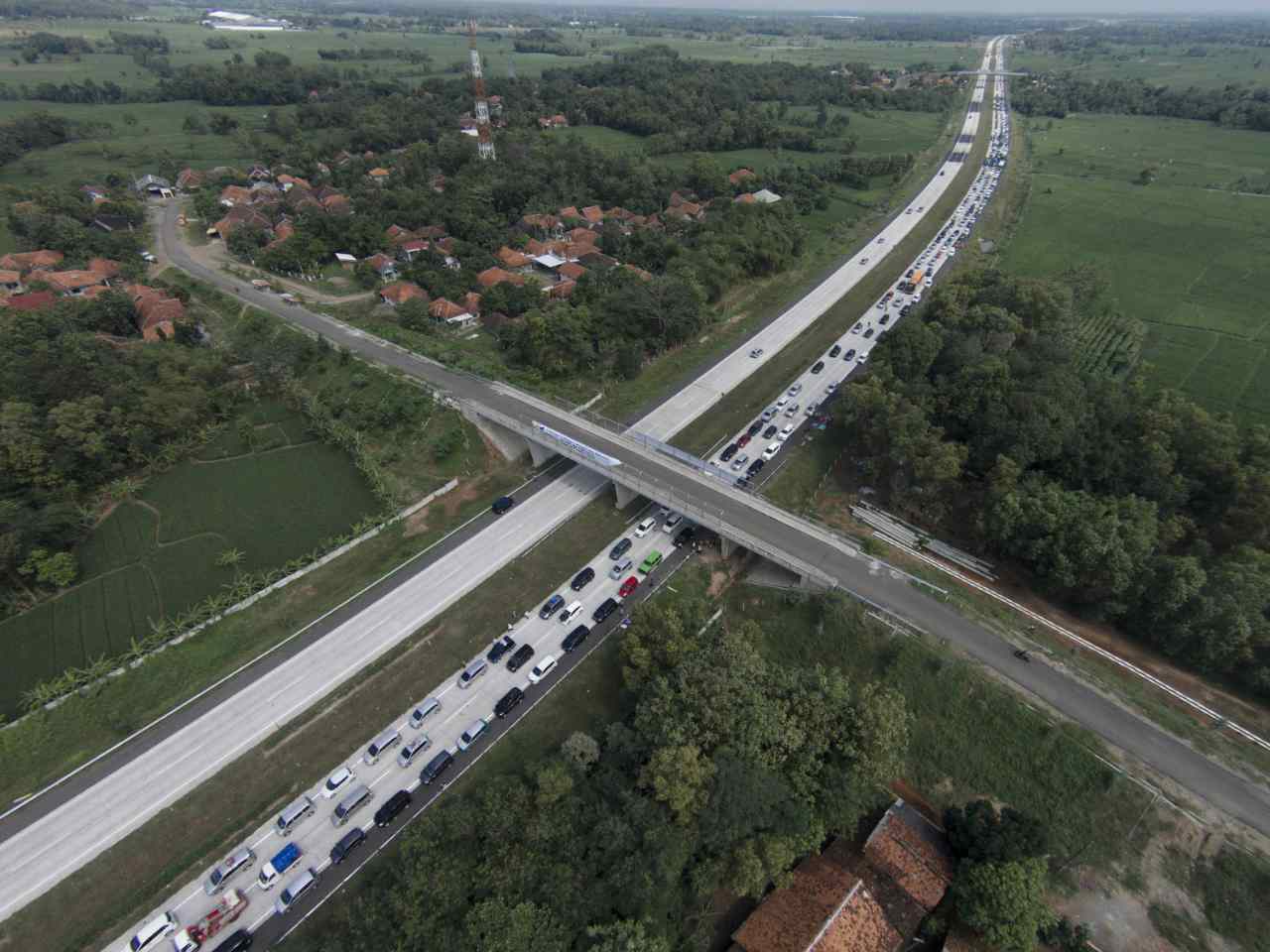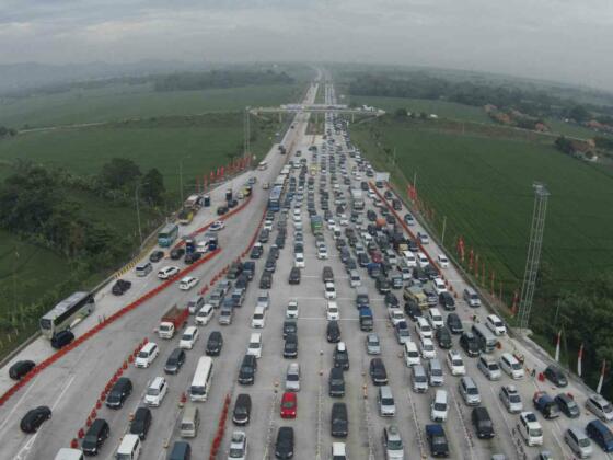 Foto aerial suasana kendaraan mengantre di pintu keluar tol Palimanan, Cirebon, Jawa Barat, Sabtu (2/7). Sebanyak 23 loket pembayaran dibuka untuk mengantisipasi kepadatan kendaraan di pintu tol pada H-4 Lebaran yang menjadi puncak mudik. ANTARA FOTO/Rosa Panggabean/foc/16.