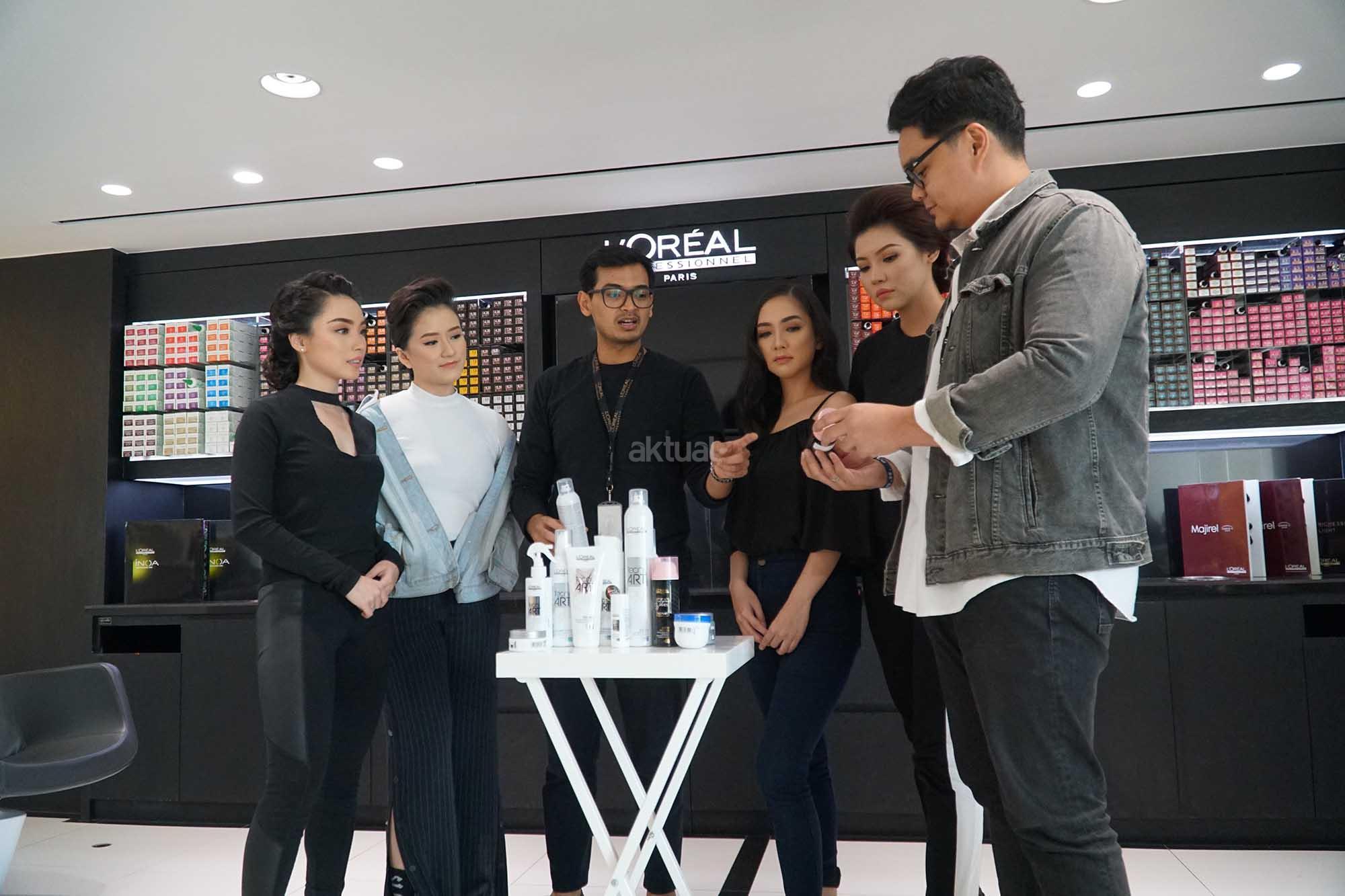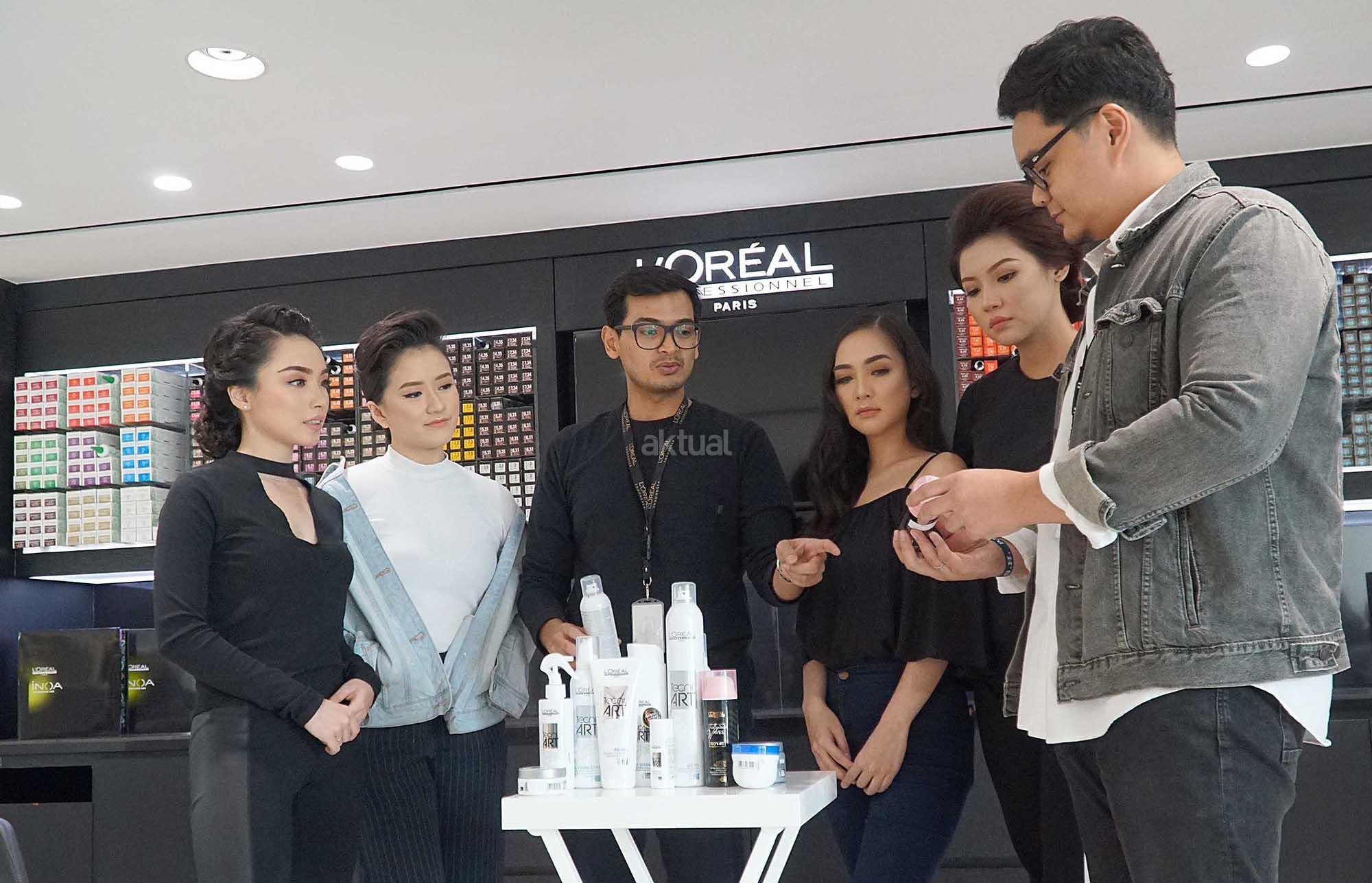 Product Manager Texture & Styling L Oreal Professionnel Dana Putra Gading (ketiga kiri), bersama model berbincang dengan Ekza Novtiano, Group Product Manager L Oreal Professionnel Eliza Novtiano saat jumpa wartawan mengenai kesiapan L’Oreal menjadi official backstage stylist Jakarta Fashion Week (JFW) 2018, di Jakarta, Kamis (19/10/2017). Sejak terlibat pada 2012 hingga 2017, LOreal Professionnel telah mengkontribusikan hampir 300 penata rambut untuk menata lebih dari 10 ribu model di lebih dari 450 fashion show sepanjang pekan mode Jakarta berlangsung. AKTUAL/Eko S Hilman