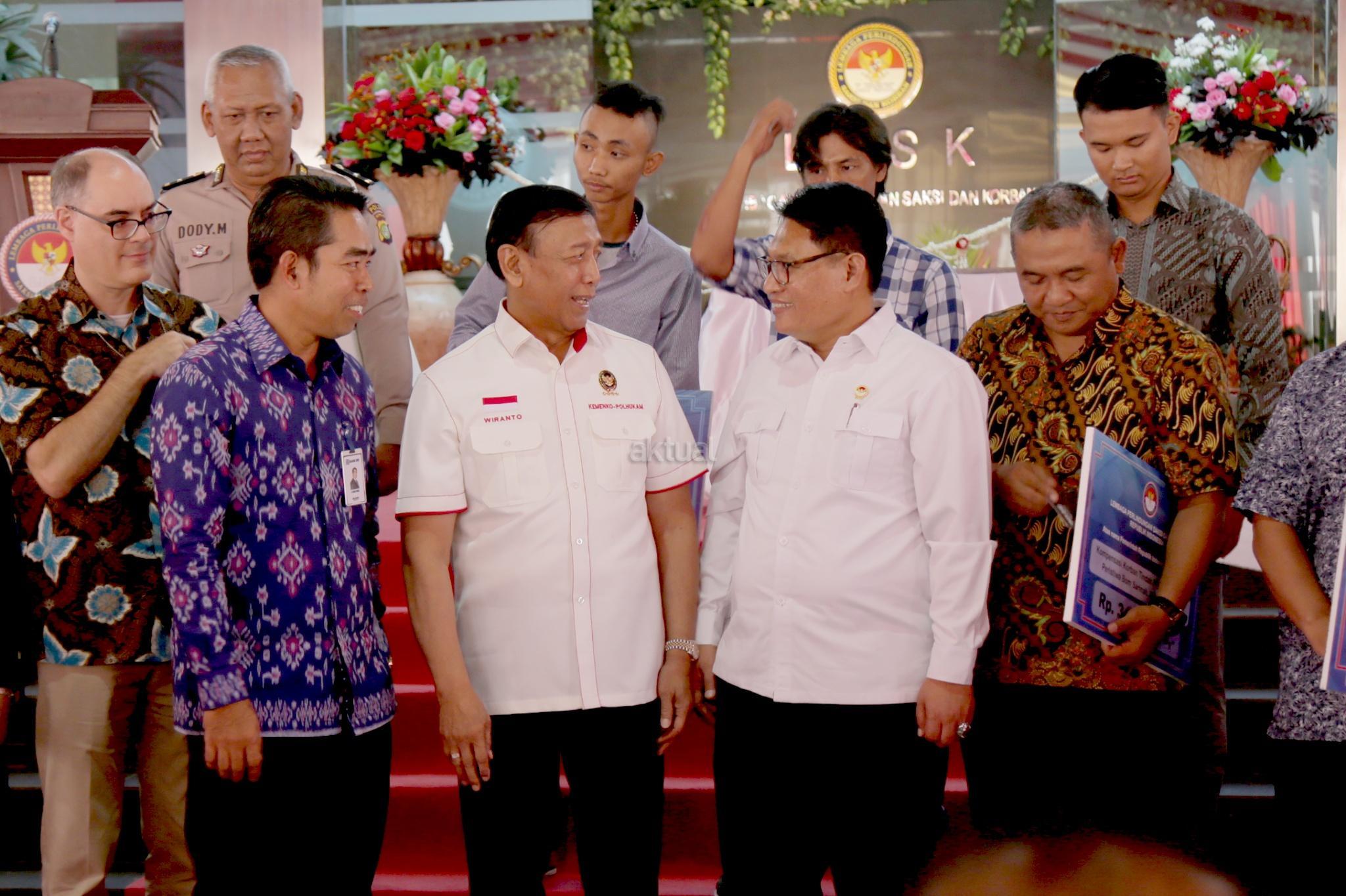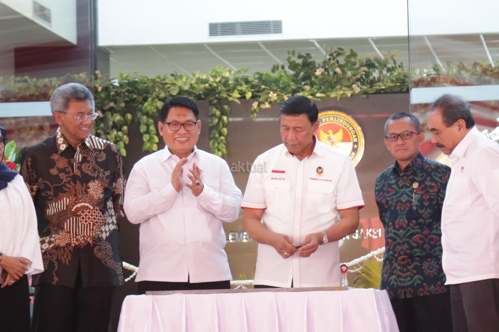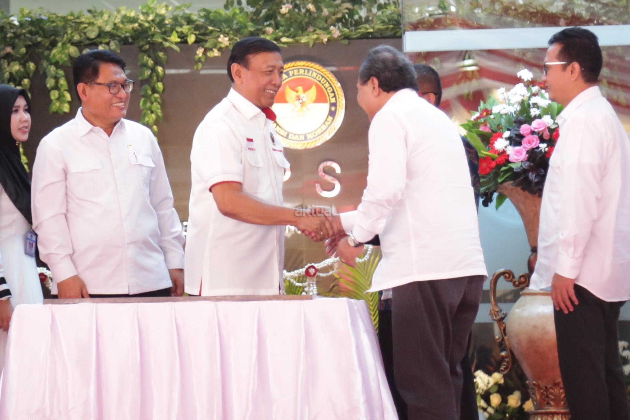 Menkopolhukam Wiranto didampingi Ketua Lembaga Perlindungan Saksi dan Korban Abdul Haris Semendawai saat menghadiri peresnian gedung baru LPSK di Jakarta, Kamis (6/9). Lembaga Perlindungan Saksi dan Korban (LPSK) menyerahkan kompensasi sebesar Rp 1,6 miliar kepada korban tiga peristiwa terorisme yaitu peristiwa Thamrin, Kampung Melayu dan Mapolda Sumut dengan total korban yang menerima kompensasi sebanyak 17 orang. AKTUAL/Tino Oktaviano