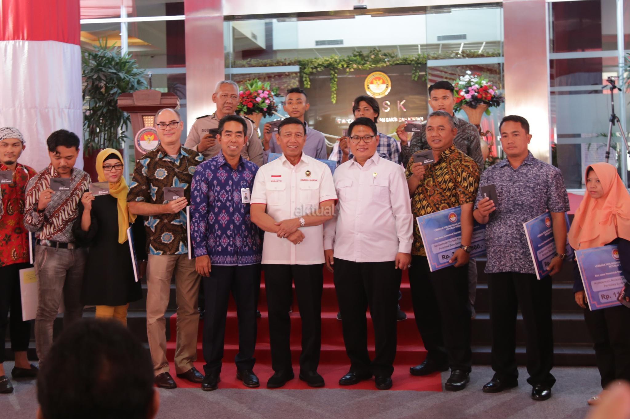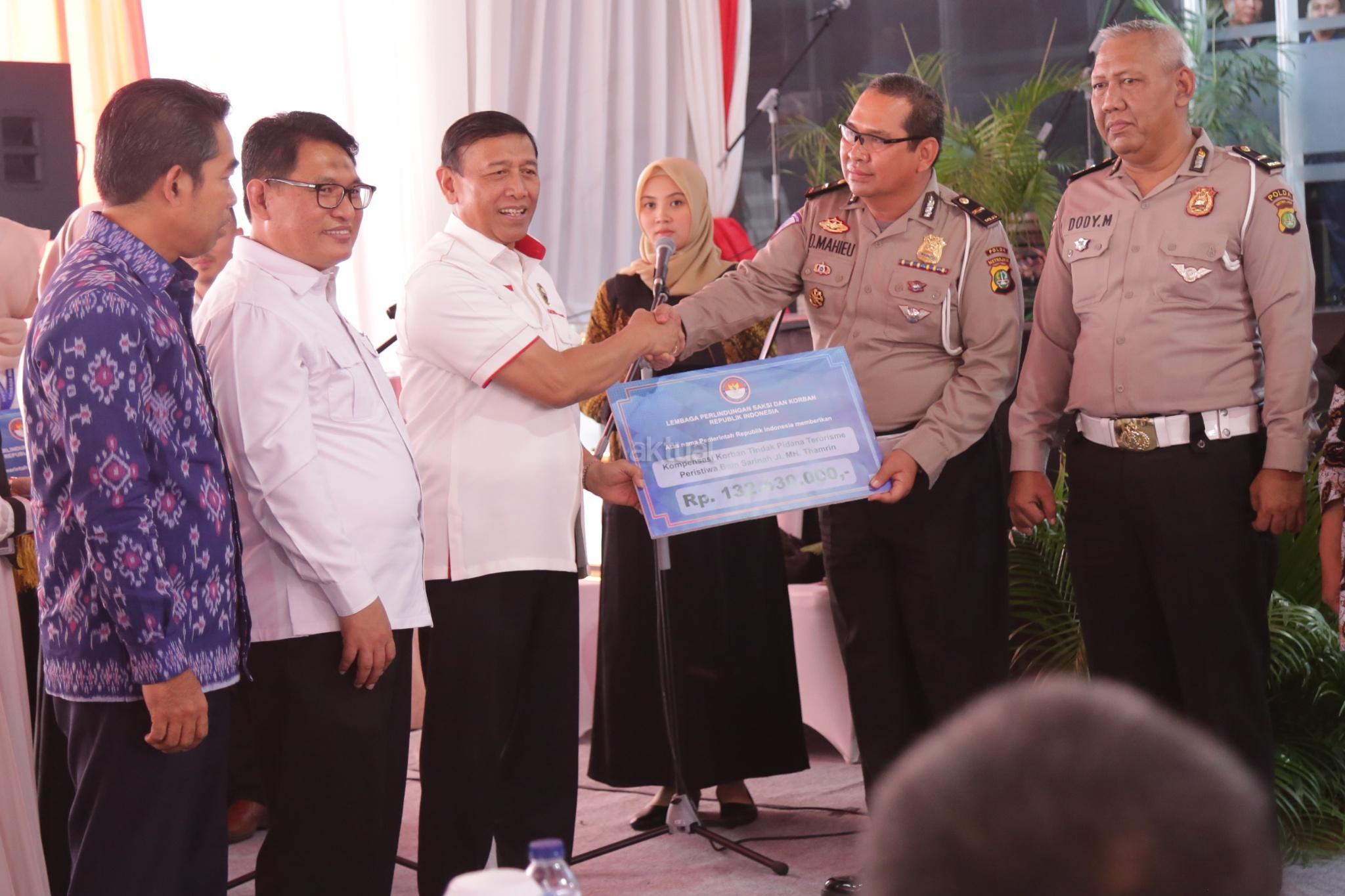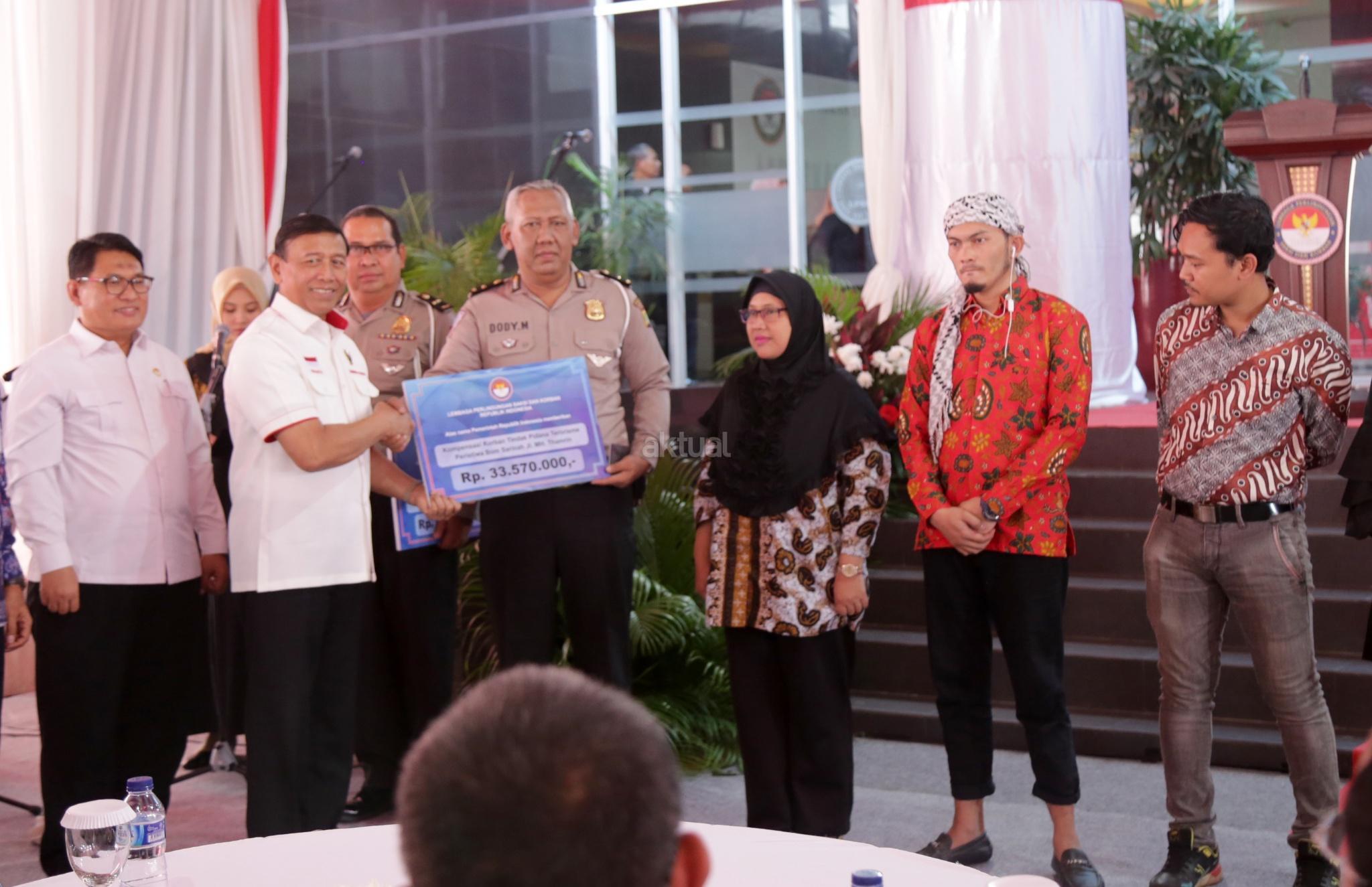 Menkopolhukam Wiranto didampingi Ketua Lembaga Perlindungan Saksi dan Korban Abdul Haris Semendawai menyerahkan kompensasi kepada korban terorisme di Jakarta, Kamis (6/9). Lembaga Perlindungan Saksi dan Korban (LPSK) menyerahkan kompensasi sebesar Rp 1,6 miliar kepada korban tiga peristiwa terorisme yaitu peristiwa Thamrin, Kampung Melayu dan Mapolda Sumut dengan total korban yang menerima kompensasi sebanyak 17 orang. AKTUAL/Tino Oktaviano