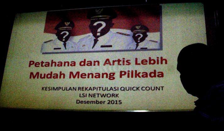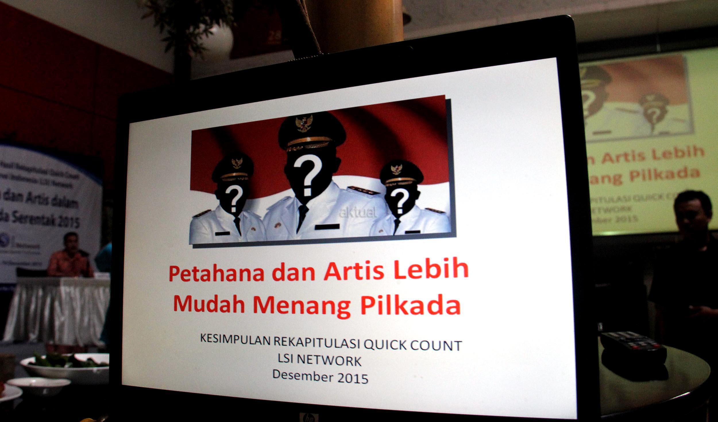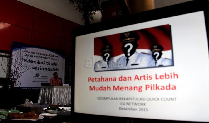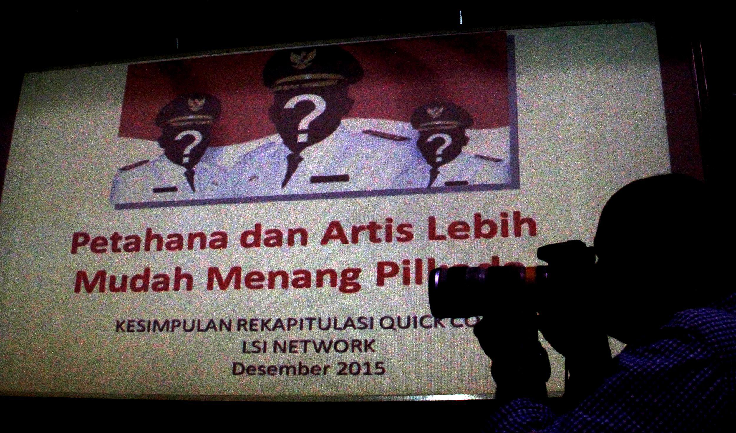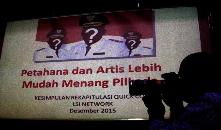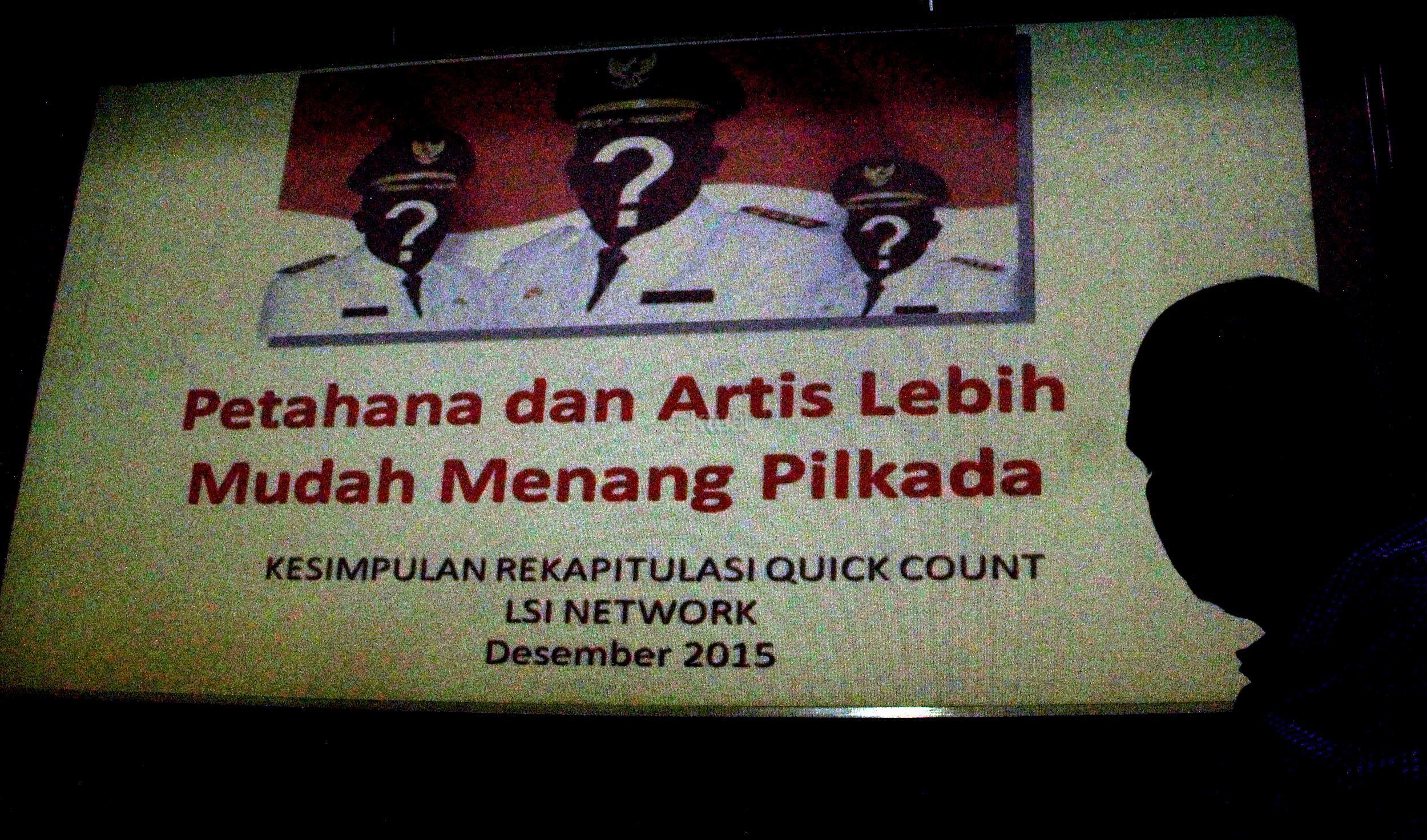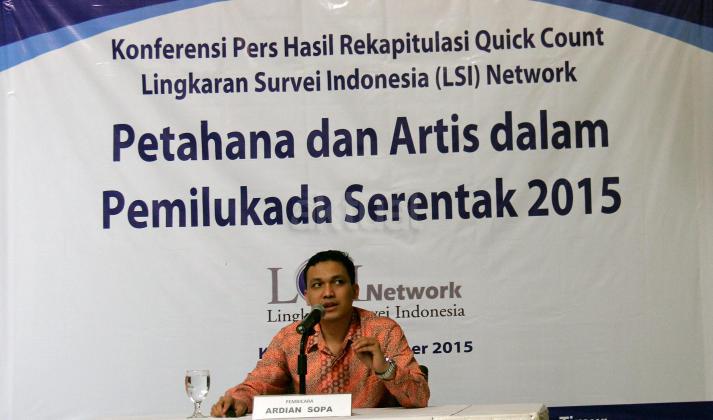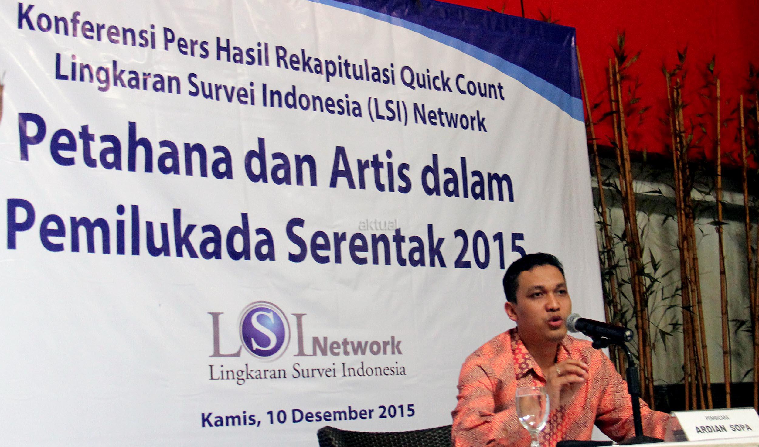 Peneliti LSI Denny JA, Ardian Sopa merilis hasil survei terkini dari LSI Network bertajuk Petahana dan Artis Lebih Mudah Menang Pilkada di kantor LSI, Rawamangun, Jakarta, Kamis (10/12/2015). Berdasarkan sistem hitung cepat yang diselenggarakan Lingkaran Survei Indonsia (LSI) Denny JA, calon kepala daerah dari kalangan artis dan petahana ternyata lebih mudah memenangkan Pilkada karena unggul popularitas. Temuan menarik dari proses hitung cepat yang dilakukan LSI Denny JA di 21 daerah, ternyata sebanyak 15 daerah dimenangkan oleh incumbent (incumbent bupati/gubernur dan wakil gubernur) atau keluarga incumbent, sementara sisanya sebanyak 6 daerah dimenangkan oleh artis atau politisi.