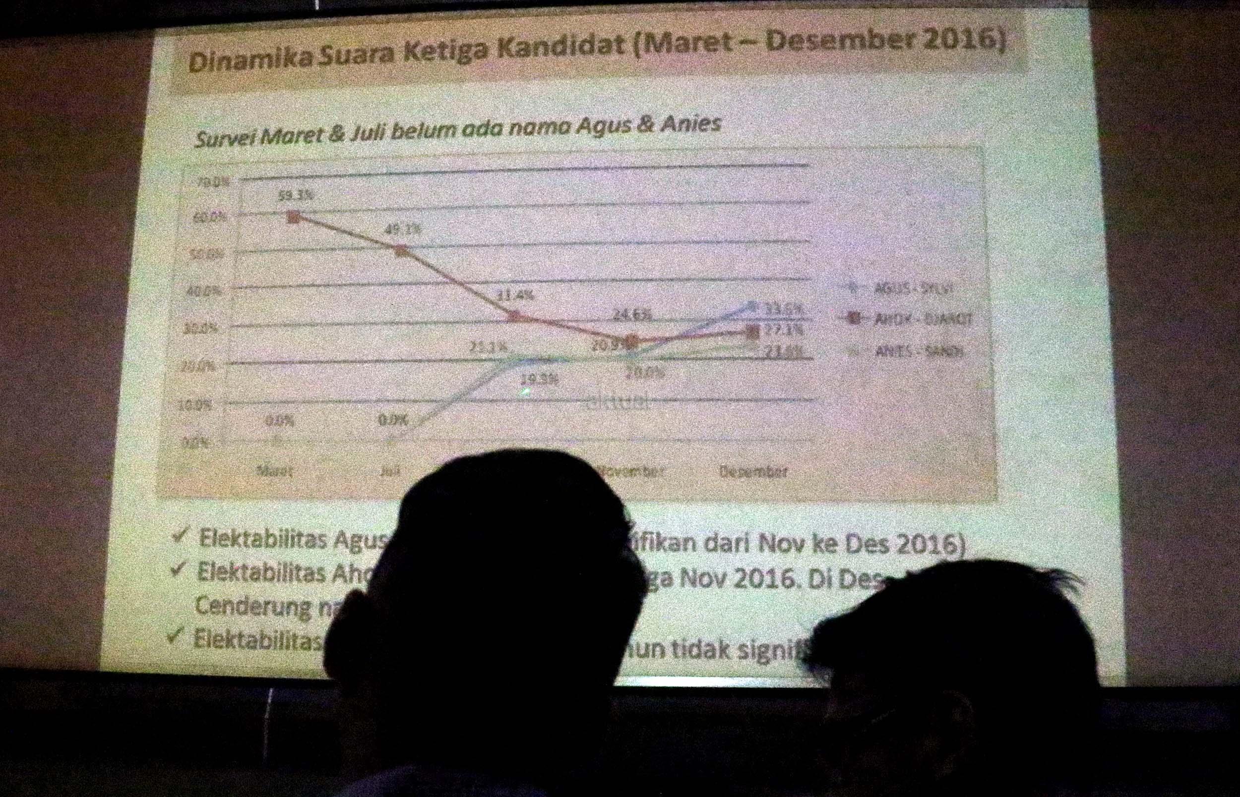 Peneliti LSI Dewi Arum (kiri), Peneliti Senior LSI Adjie Alfaraby (kanan) saat menjelaskan hasil survei terkait posisi terkini tiga kandidat Cagub dan Cawagub Pilkada DKI Jakarta 2017 di Kantor LSI, Rawamangun, Jakarta Timur, Rabu (14/12/2016). LSI merilis mayoritas publik DKI Jakarta menginginkan Gubernur yang baru dengan persentasi sebesar 60,3 persen yang menginginkan gubernur lama sebesar 22,1 persen dan sisanya 17,6 persen tidak menjawab kendati elektabilitas Ahok-Djarot cenderung rebound. AKTUAL/Munzir