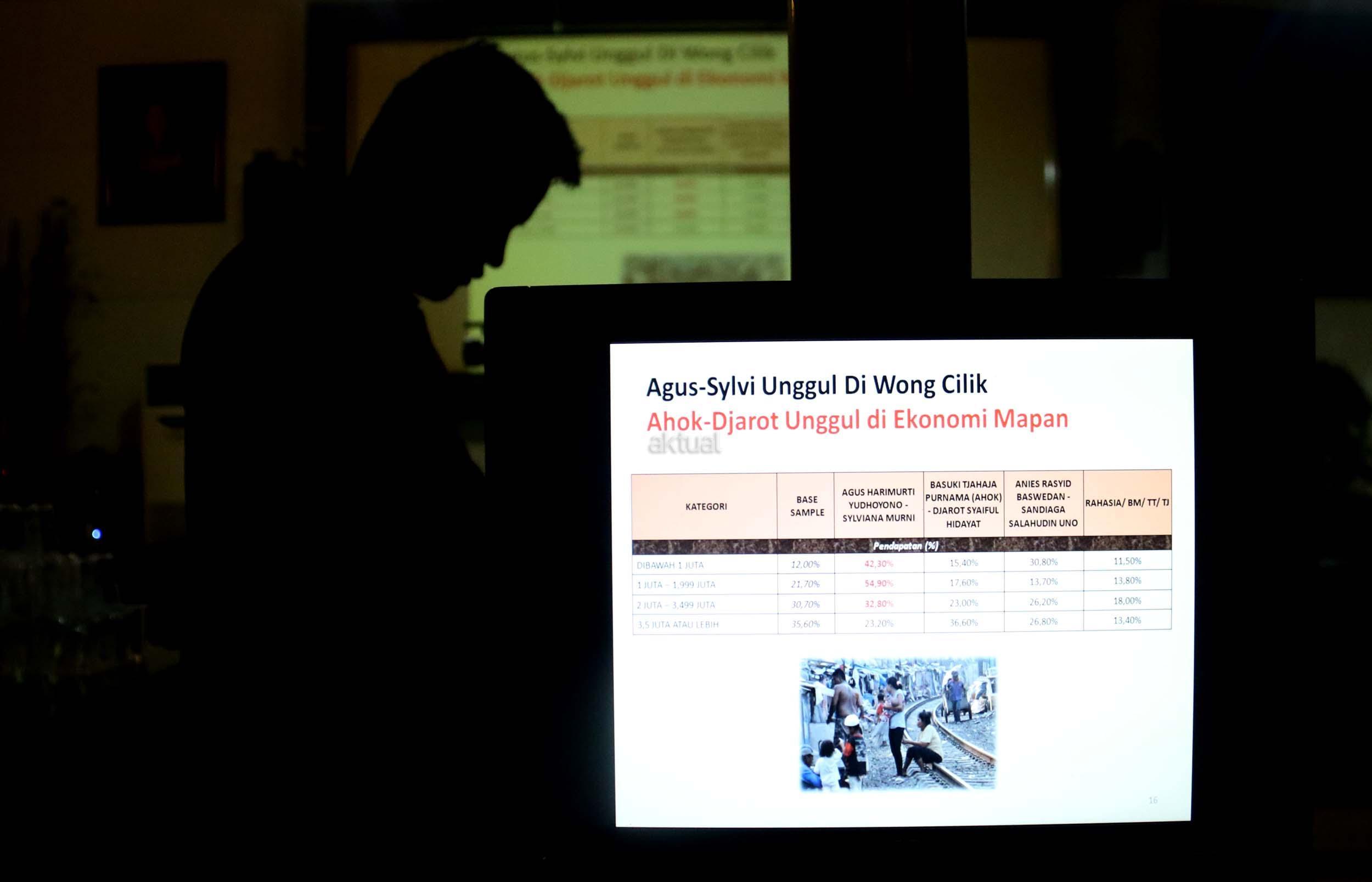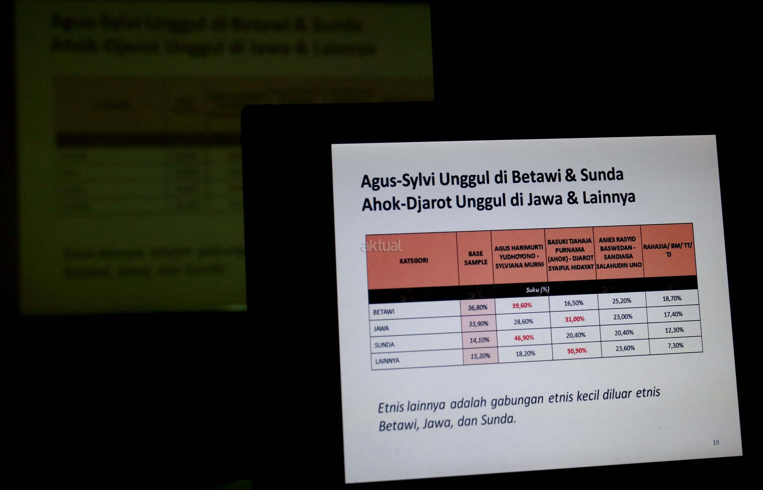 LSI merilis mayoritas publik DKI Jakarta menginginkan Gubernur yang baru dengan persentasi sebesar 60,3 persen yang menginginkan gubernur lama sebesar 22,1 persen dan sisanya 17,6 persen tidak menjawab kendati elektabilitas Ahok-Djarot cenderung rebound. AKTUAL/Munzir