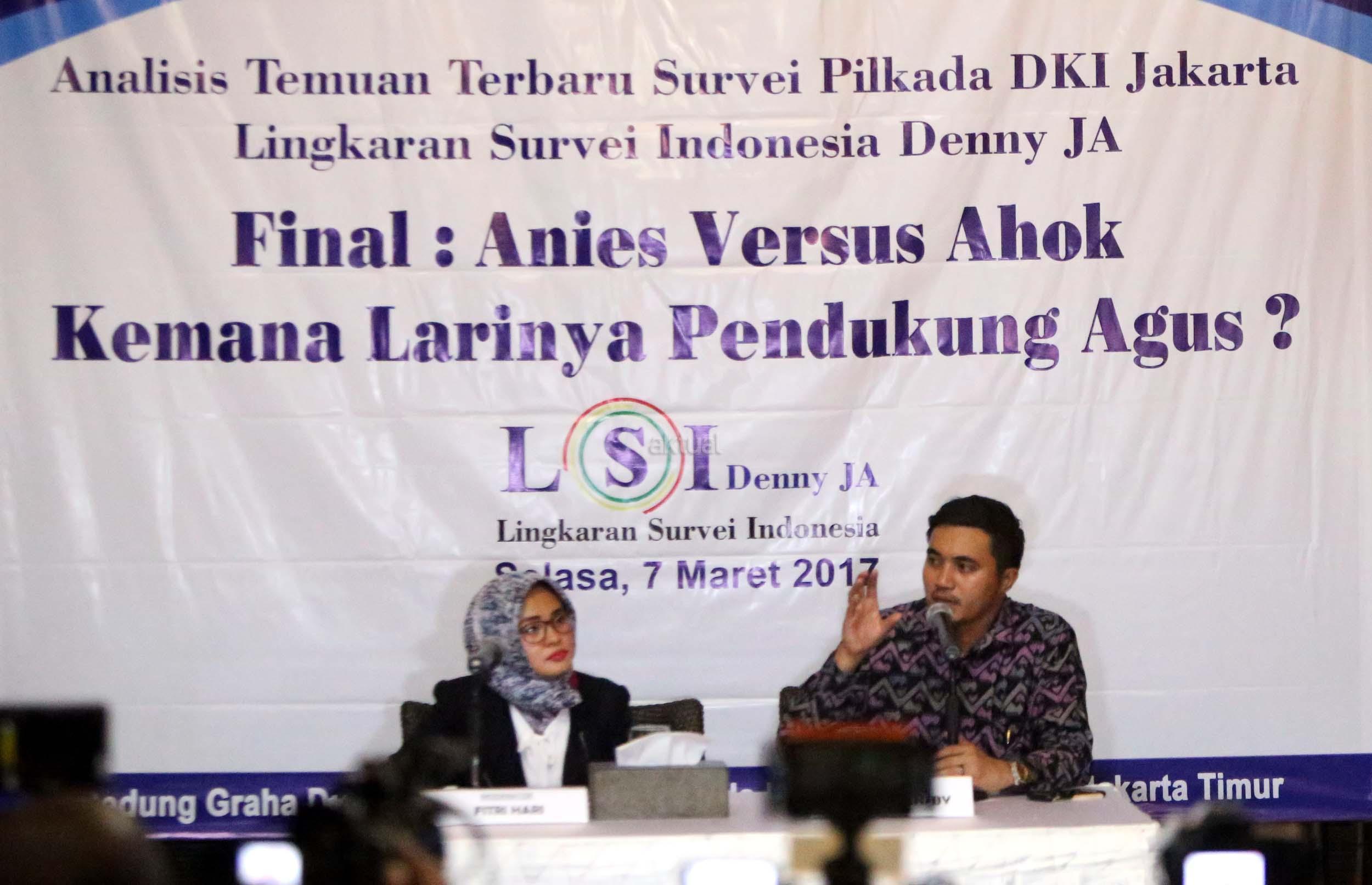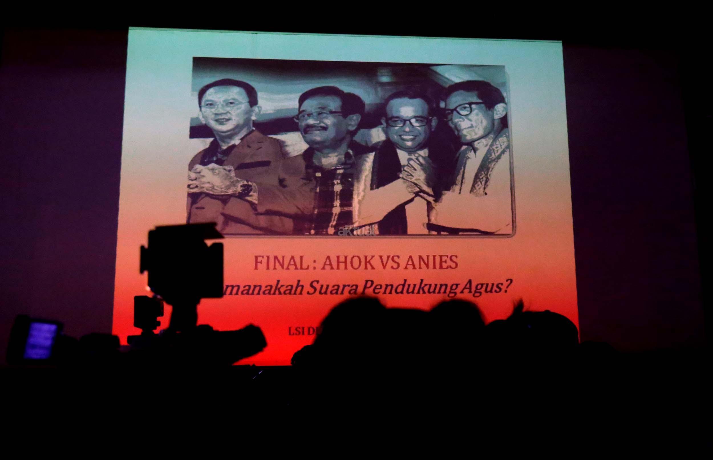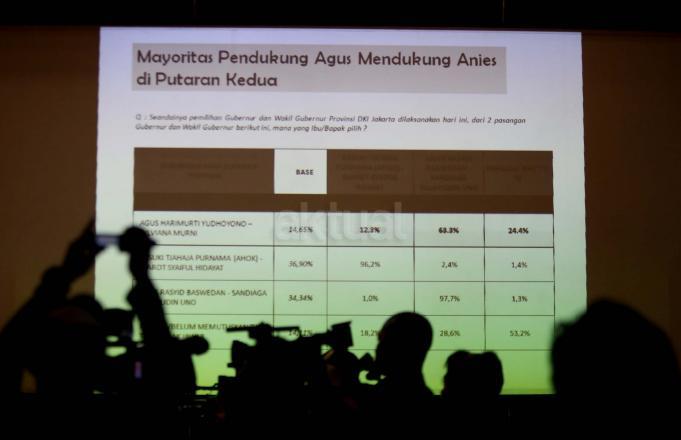 Hasil survei LSI Denny JA menyebutkan, sebanyak 91.80 % pemilih Agus-Sylvi ingin mempunyai Gubernur baru di Jakarta dan beralihnya suara Agus-Sylvi ke pasangan Anies-Sandi karena sebagian besar pemilih Agus-Sylvi menganggap Ahok telah menista agama. AKTUAL/Munzir