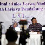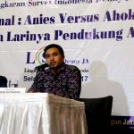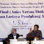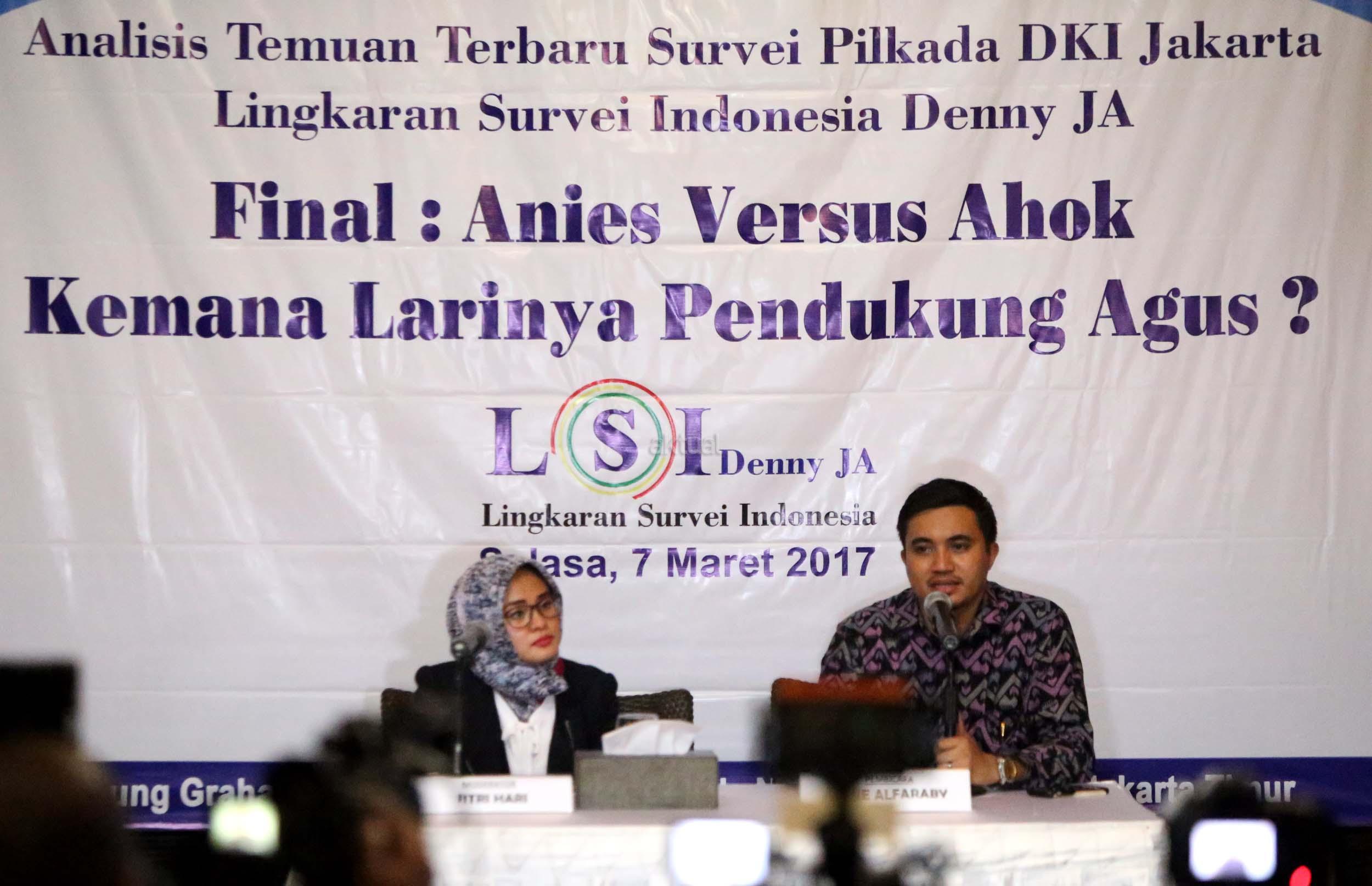 Peneliti LSI Denny JA, Adjie Alfaraby (kanan) memaparkan hasil survei terkait ‘Final : Ahok Vs Anies, Kemanakah Suara Pendukung Agus’ di Jakarta, Selasa (7/3/2017). Hasil survei LSI Denny JA menyebutkan, sebanyak 91.80 % pemilih Agus-Sylvi ingin mempunyai Gubernur baru di Jakarta dan beralihnya suara Agus-Sylvi ke pasangan Anies-Sandi karena sebagian besar pemilih Agus-Sylvi menganggap Ahok telah menista agama. AKTUAL/Munzir