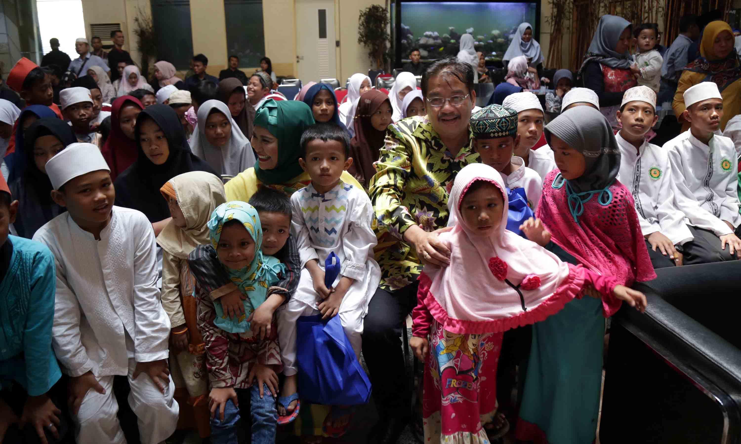 Pendiri LSI Network, Denny JA didampingi Istri saat menyerahkan santunan kepada 100 anak yatim di kantor Lingkaran Survei Indonesia (LSI), Rawamangun, Jakarta, Rabu (9/5/2018). Acara santunan dan do'a bersama anak yatim ini dalam rangka menyambut bulan berkah ramadhan. AKTUAL/Tino Oktaviano
