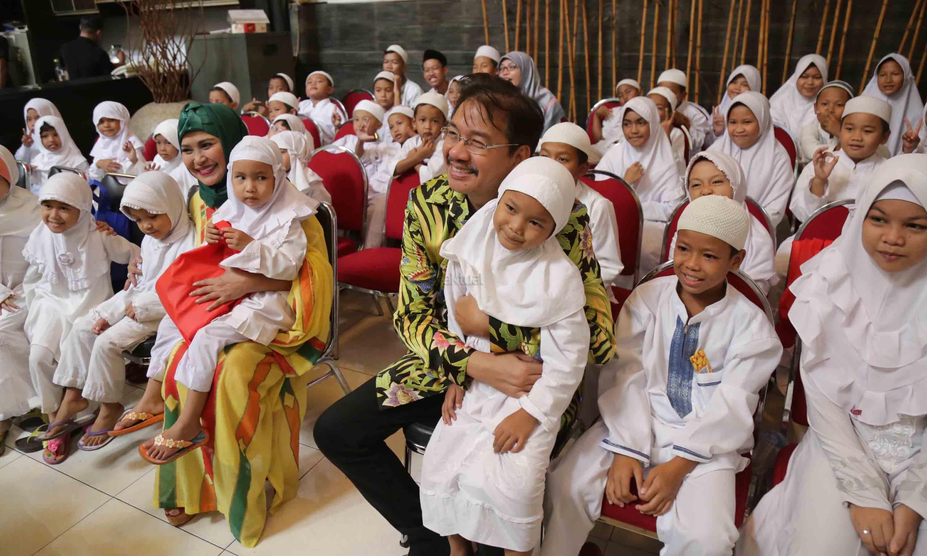 Pendiri LSI Network, Denny JA didampingi Istri saat menyerahkan santunan kepada 100 anak yatim di kantor Lingkaran Survei Indonesia (LSI), Rawamangun, Jakarta, Rabu (9/5/2018). Acara santunan dan do’a bersama anak yatim ini dalam rangka menyambut bulan berkah ramadhan. AKTUAL/Tino Oktaviano