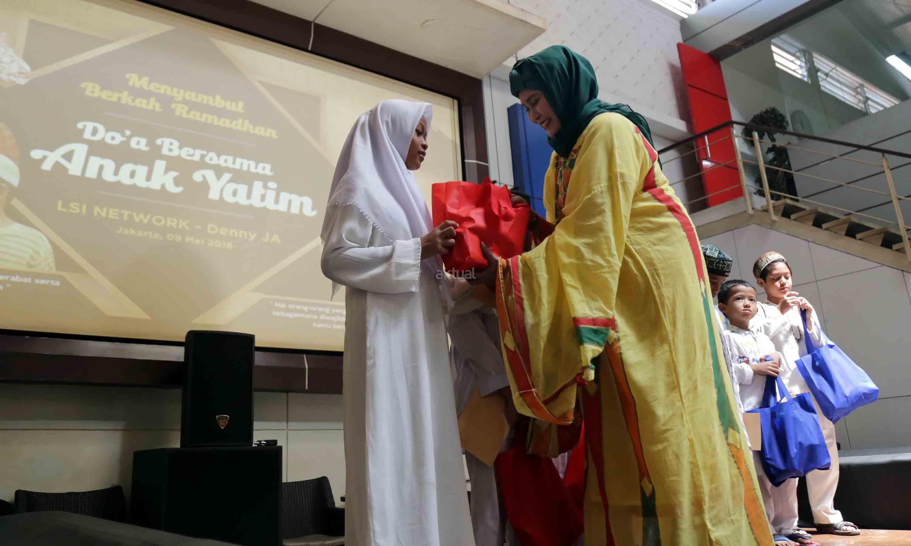 Istri Pendiri LSI Network, Denny JA saat menyerahkan santunan kepada 100 anak yatim di kantor Lingkaran Survei Indonesia (LSI), Rawamangun, Jakarta, Rabu (9/5/2018). Acara santunan dan do’a bersama anak yatim ini dalam rangka menyambut bulan berkah ramadhan. AKTUAL/Tino Oktaviano