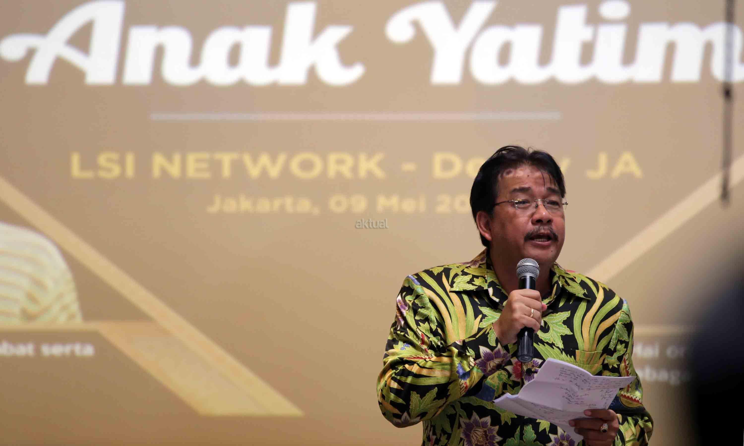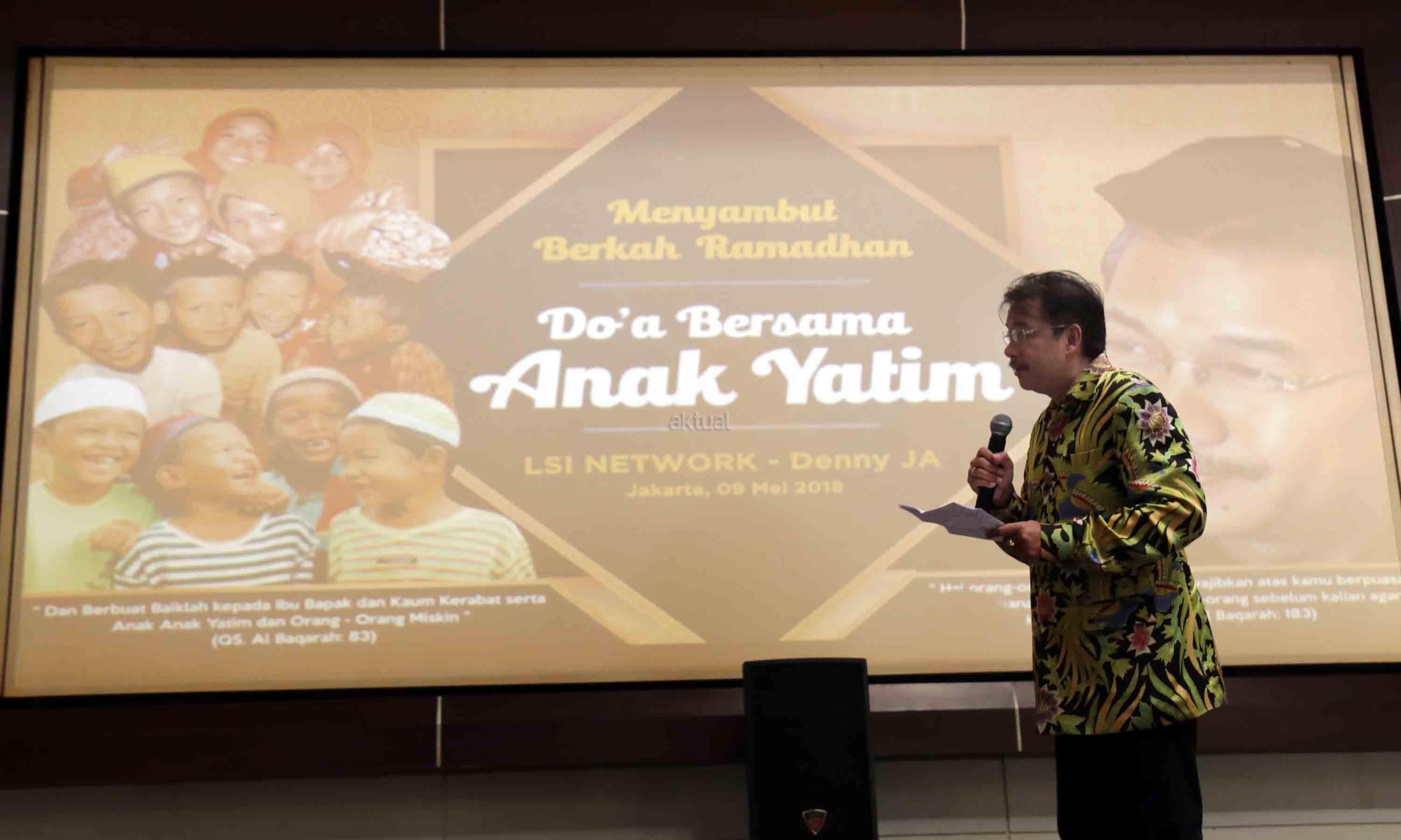Pendiri LSI Network, Denny JA membacakan puisi untuk anak yatim saat acara penyerahan santunan kepada 100 anak yatim di kantor Lingkaran Survei Indonesia (LSI), Rawamangun, Jakarta, Rabu (9/5/2018). Acara santunan dan do’a bersama anak yatim ini dalam rangka menyambut bulan berkah ramadhan. AKTUAL/Tino Oktaviano