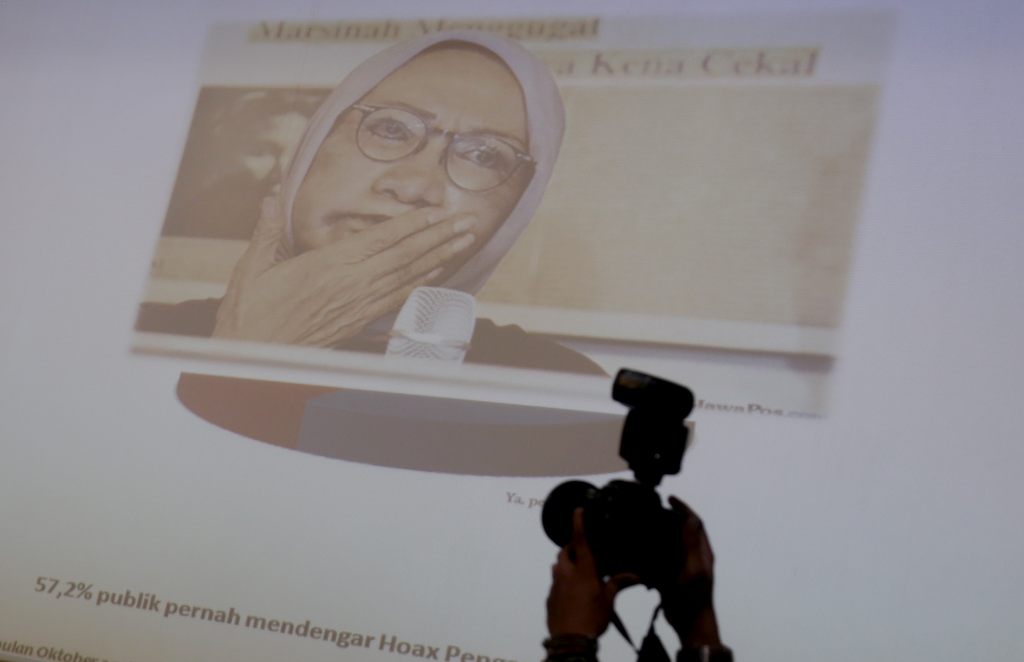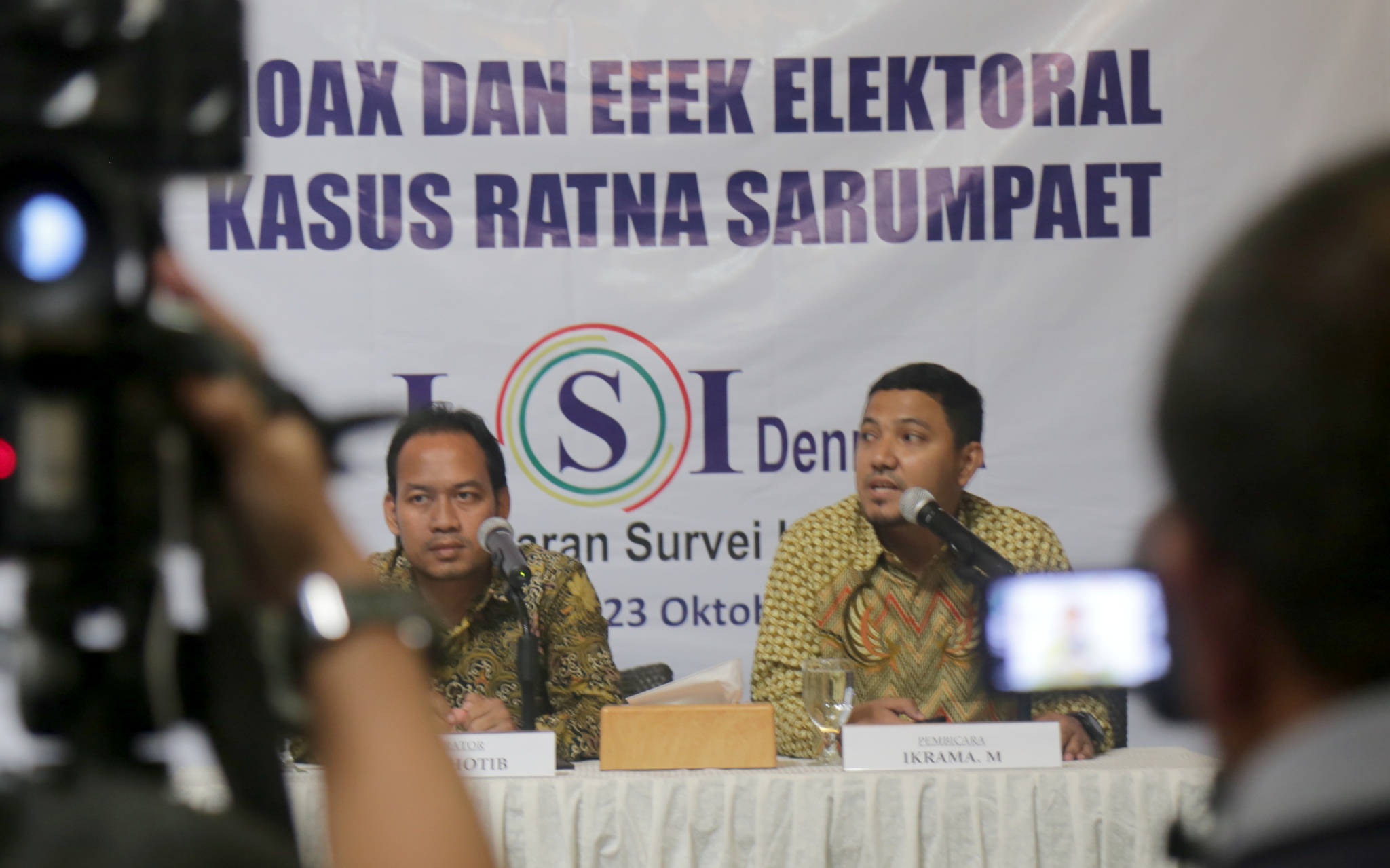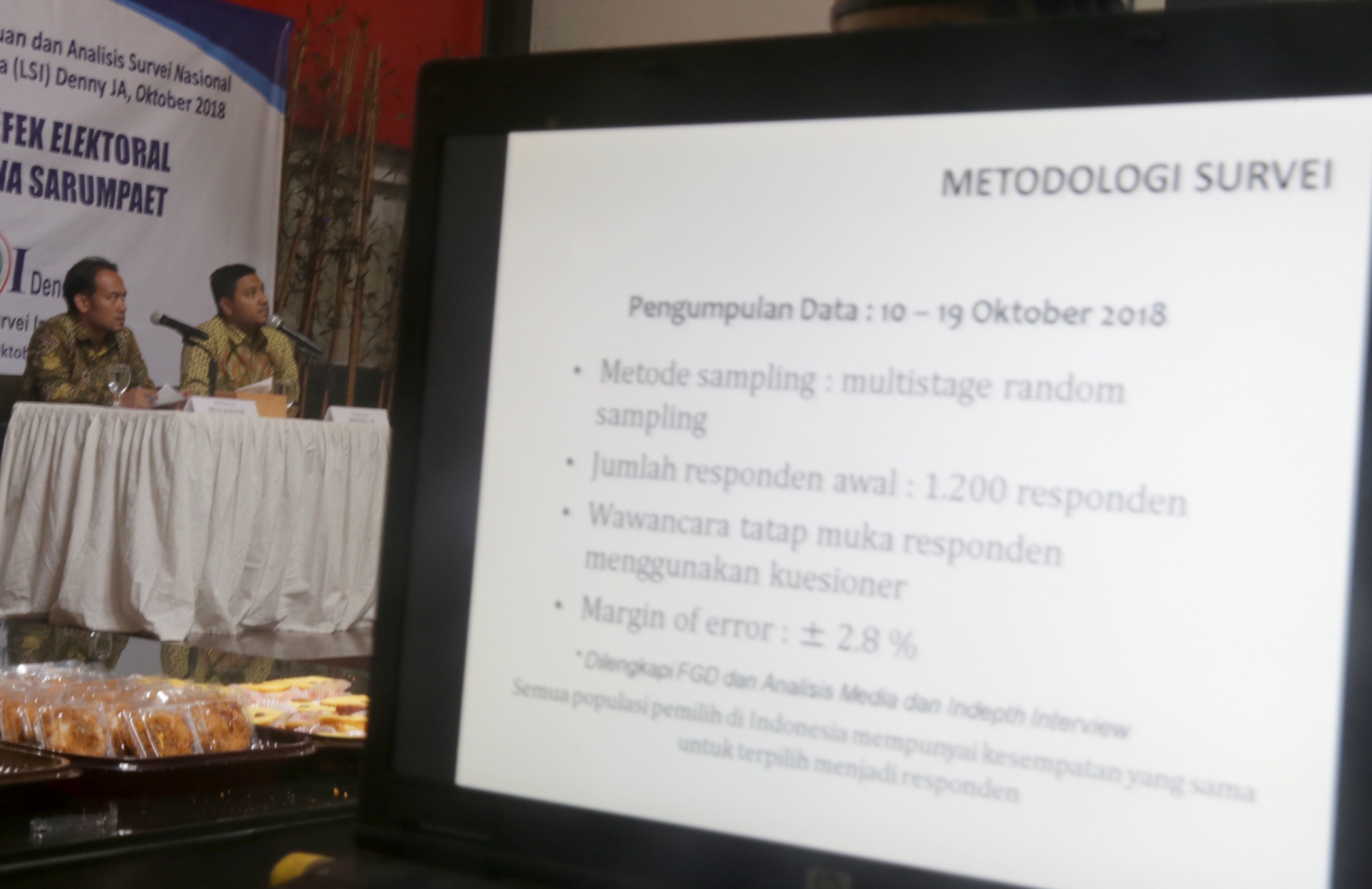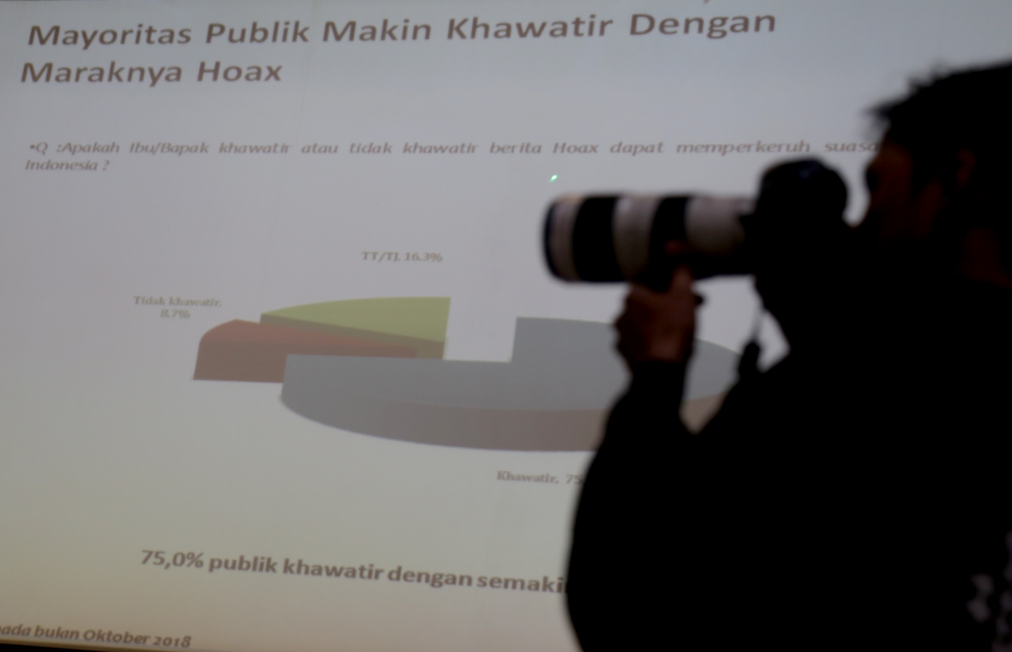 Wartawan saat meliput survei terkait Hoax dan efek Elektoral Kasus Ratna Sarumpaet di Jakarta Selasa (23/10/2018). Salah satu hasil survei LSI menyebutkan, bila Pipres digelar hari ini, pasangan Jokowi-Ma,ruf tampil sebagai pemenang. AKTUAL/Tino Oktaviano