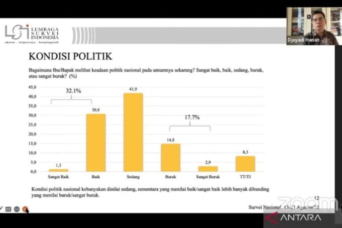 “Kondisi politik kalau kita bandingkan antara yang positif dan negatif, cenderung positif penilaiannya,” kata Direktur Eksekutif LSI Djayadi Hanan saat memaparkan hasil survei bertajuk “Kondisi Ekonomi dan Peta Politik Menjelang 2024”, sebagaimana dipantau melalui kanal YouTube Lembaga Survei Indonesia di Jakarta, Minggu (4/9).