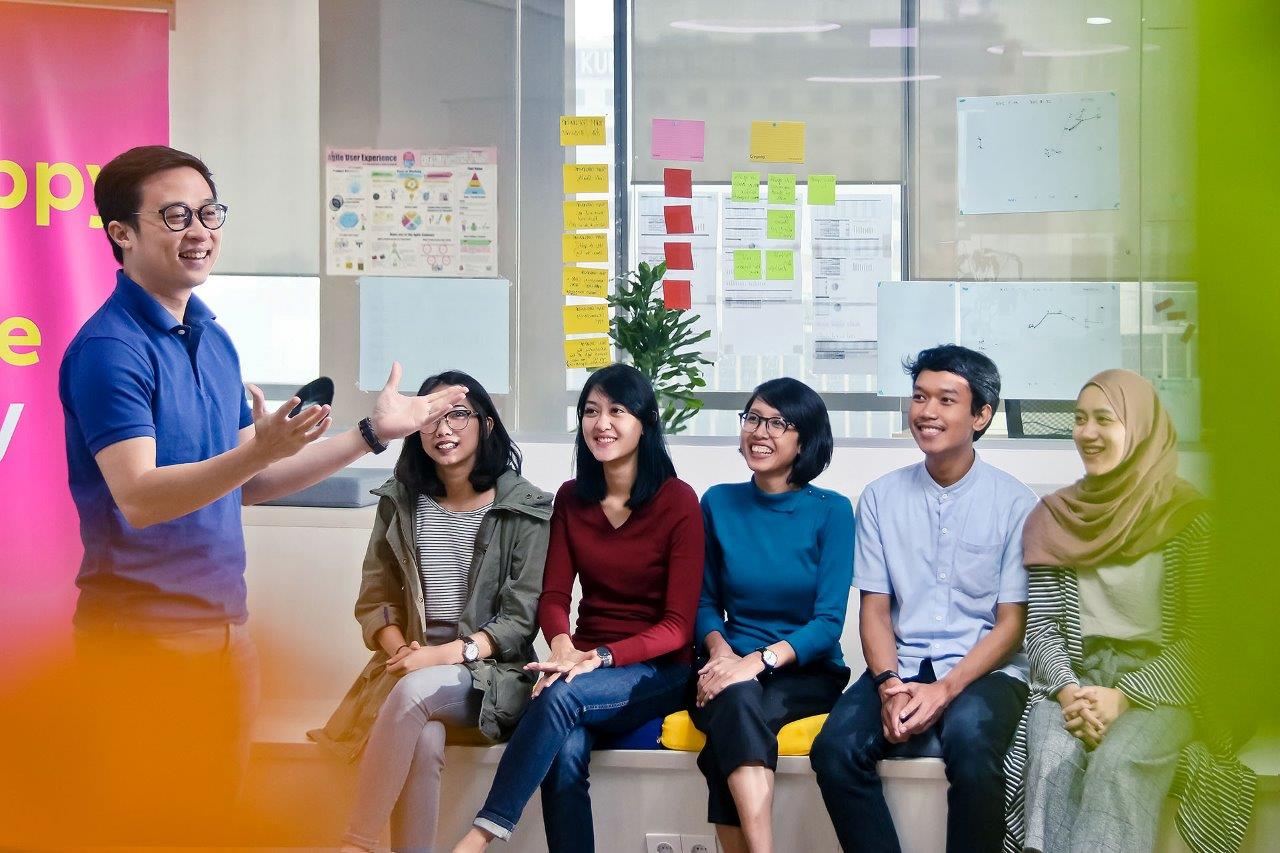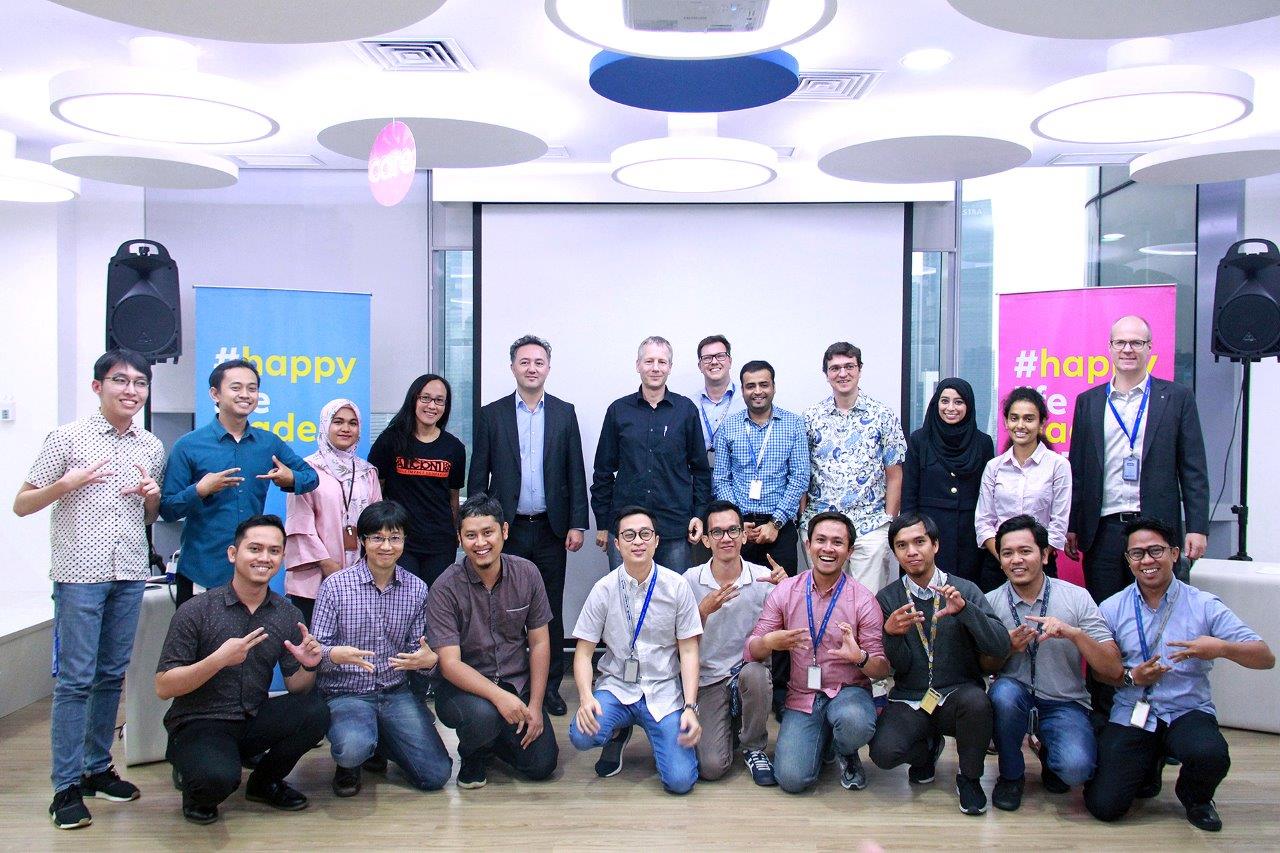 Joos Louwerier, Country Manager & Direktur Utama Allianz Life Indonesia (kanan), foto bersama dengan karyawan dari lintas departemen yang bekerja dan berkolaborasi di Allianz Innovation Lab untuk menciptakan solusi dan inovasi baru bagi para mitra bisnis dan nasabah di Jakarta, Jumat (9/11/2018). Allianz Indonesia telah menerapkan aturan berbusana santai dan jam kerja fleksibel sehingga karyawan dapat memiliki keseimbangan antara pekerjaan dan kehidupan pribadi serta merasakan lingkungan yang lebih kreatif maupun suasana kerja yang lebih menyenangkan. AKTUAL/Dok Allianz