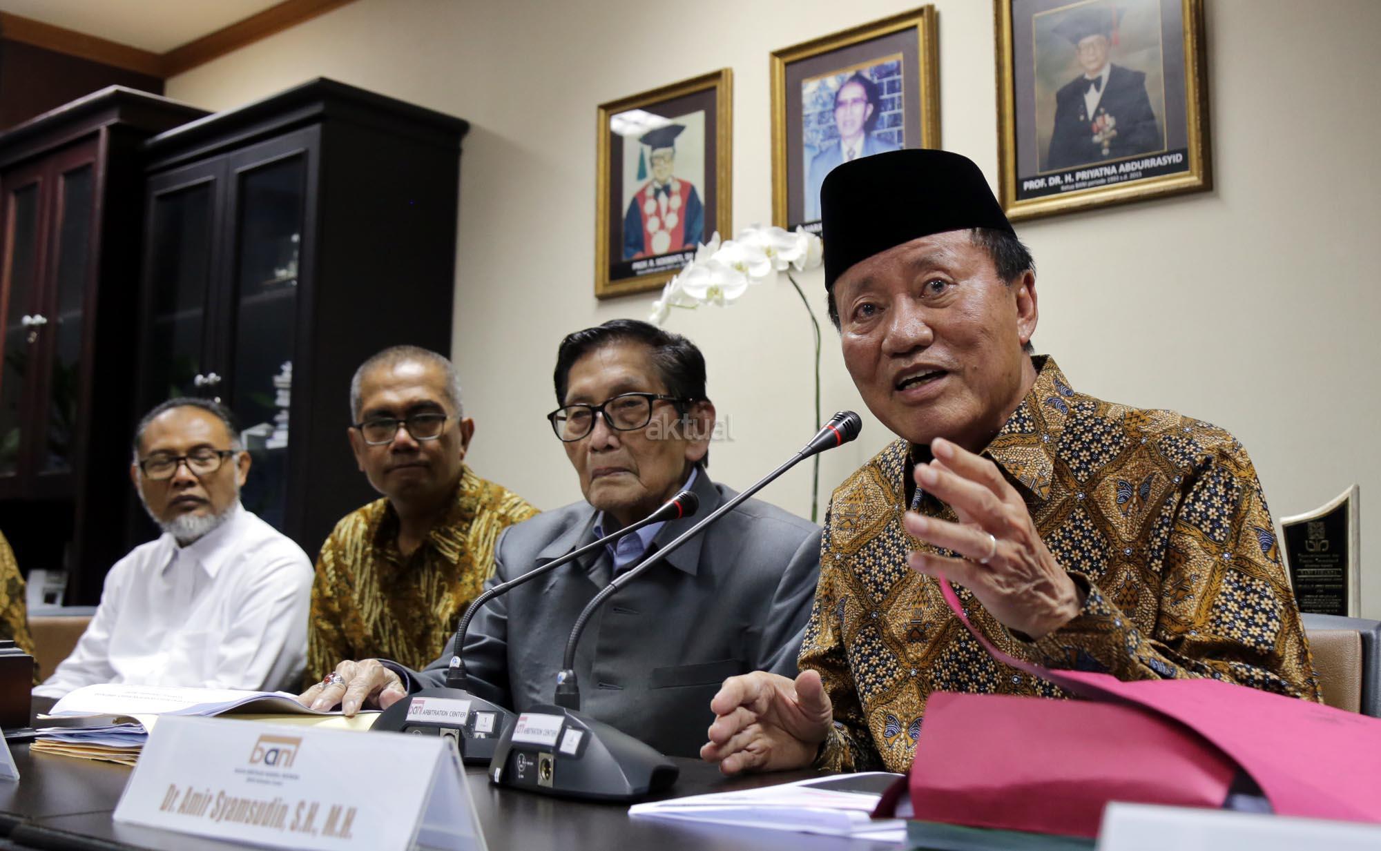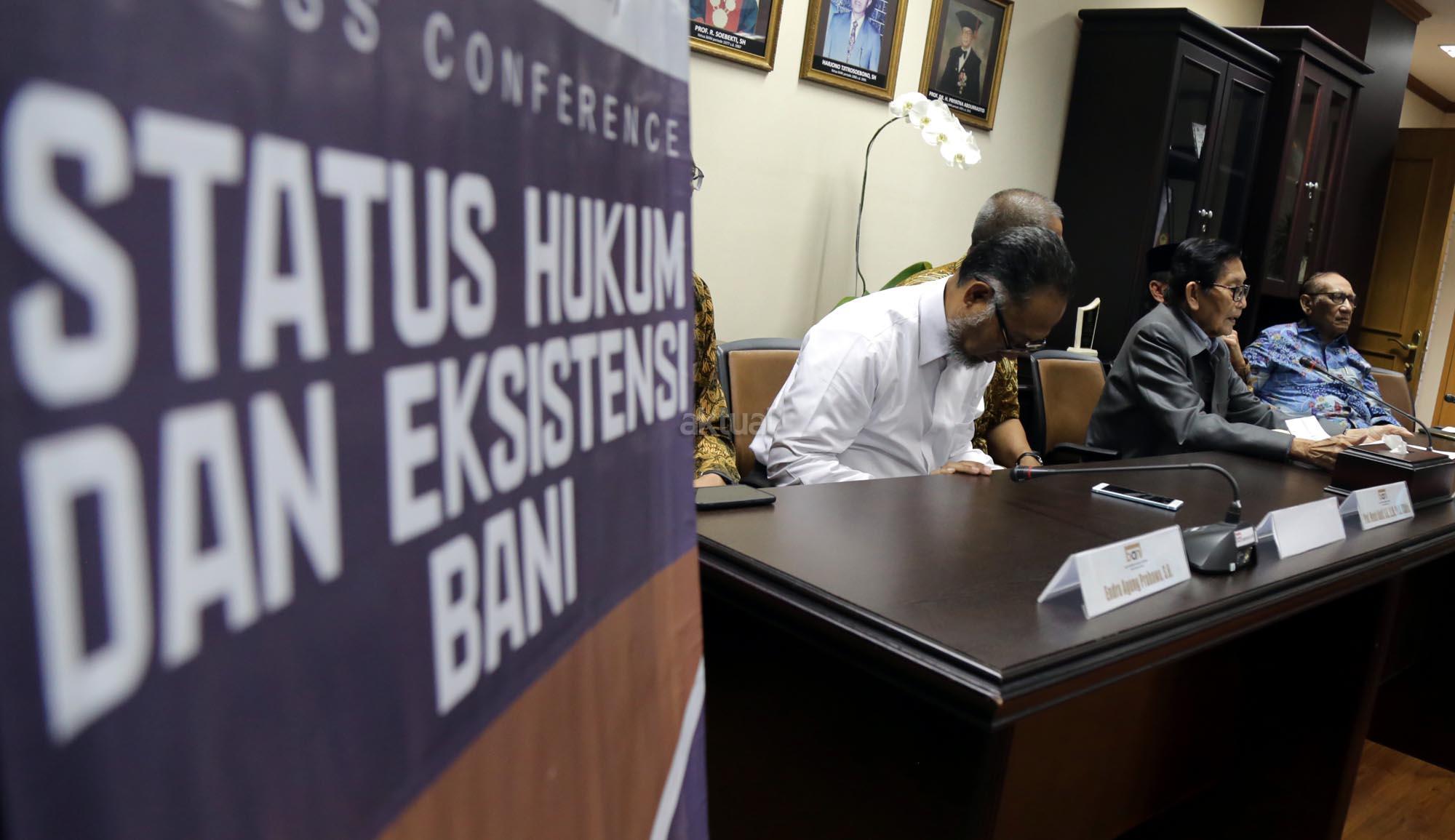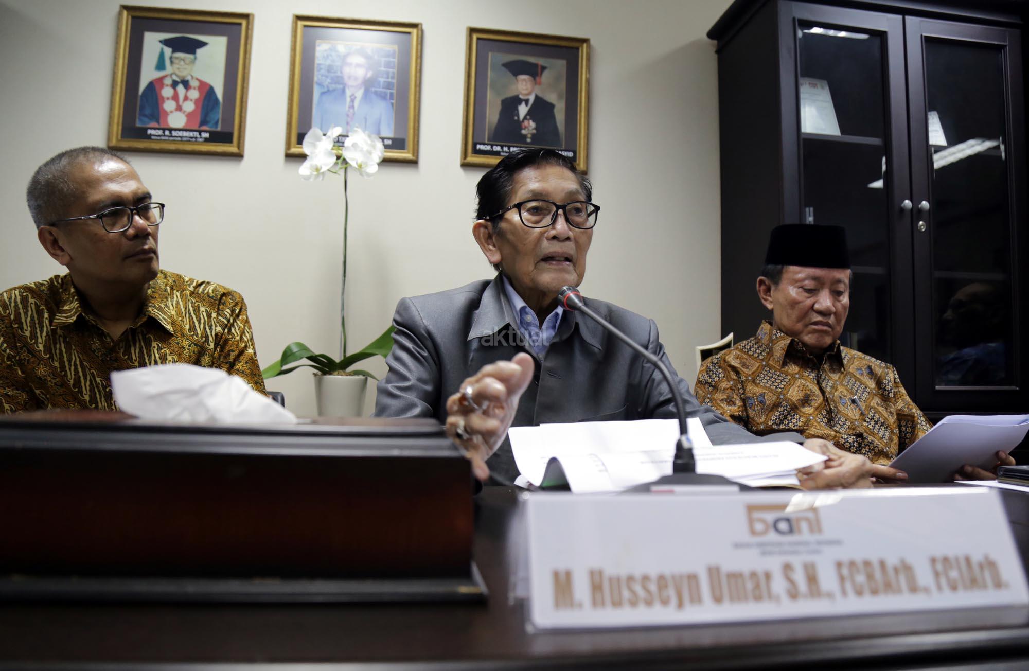 Ketua BANI M. Husseyn Umar (ketiga kiri) didampingi , Kuasa Hukum BANI Dr. Amir Syamsudin, saat konferesi pers di kantor BANI, Jakarta, Kamis (7/6/2018). Badan Arbitrase Nasional Indonesia (BANI) versi Mampang memenangkan gugatan badan hukum terhadap BANI versi Sovereign di tingkat kasasi Mahkamah Agung melalui putusan 233 K/TUN/2018 pada 8 Mei 2018. AKTUAL/Tino Oktaviano