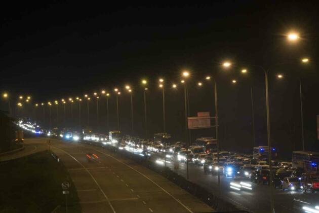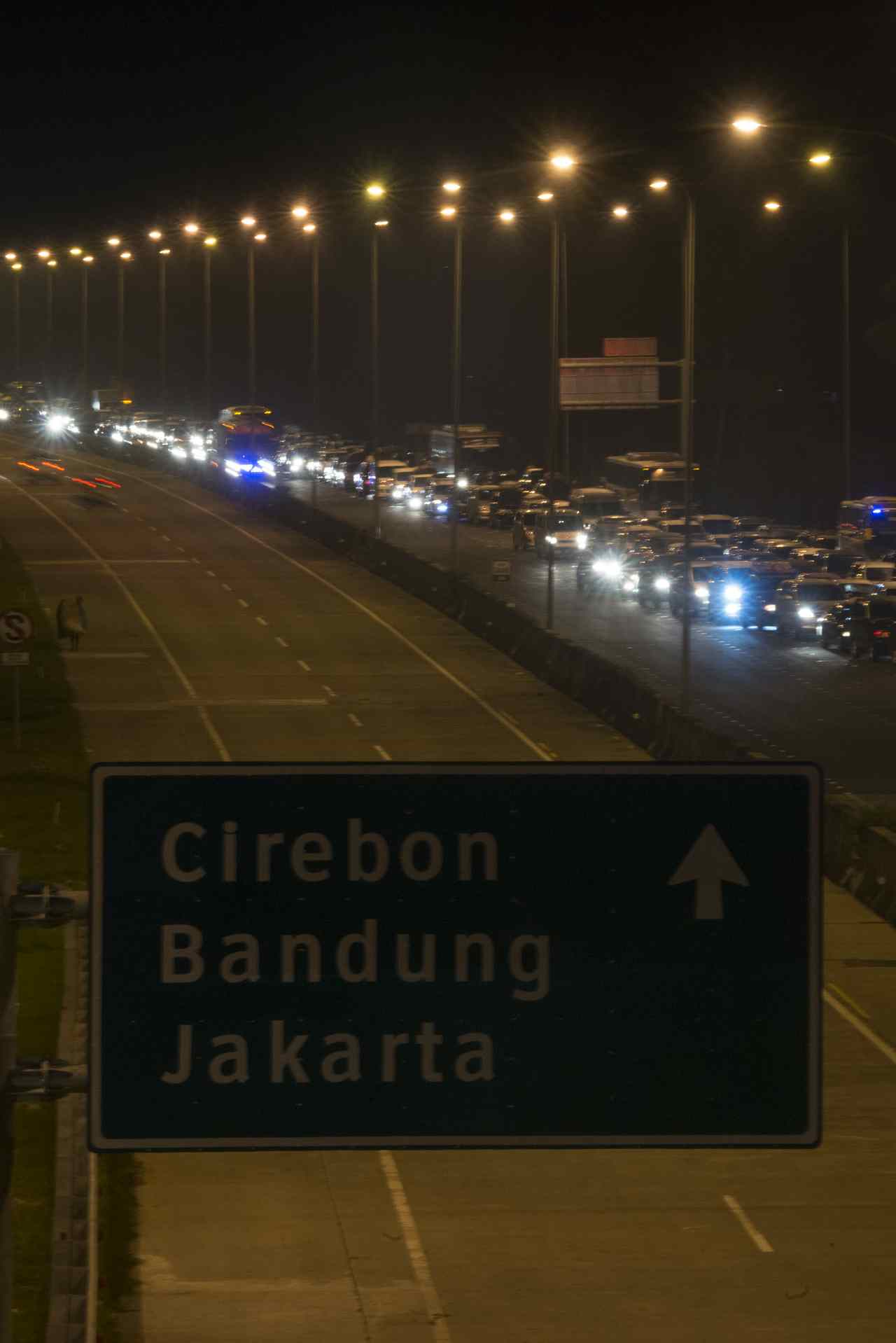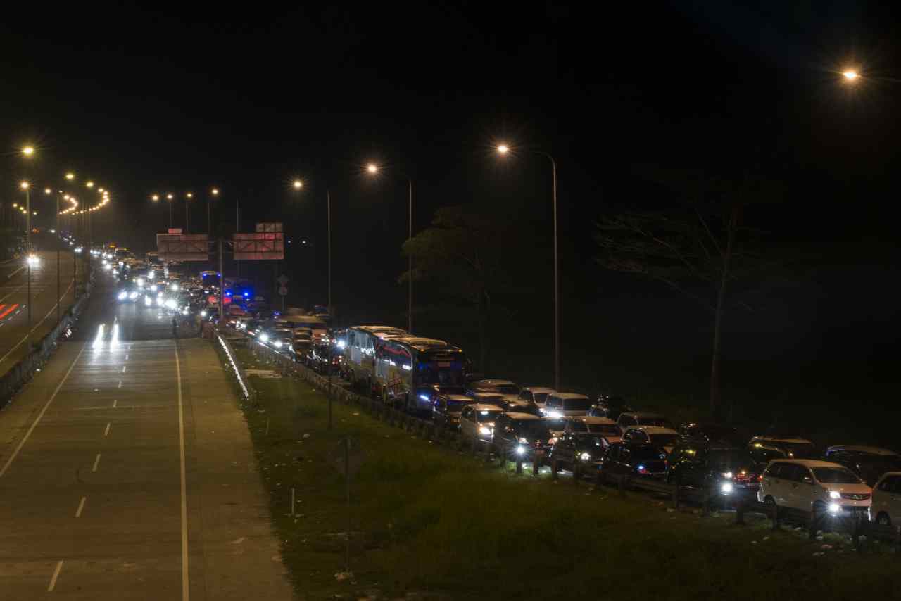 Antrean kendaraan di pintu keluar tol Pejagan, Brebes, Jawa Tengah, Minggu (3/7). Pemudik mengantre berjam-jam pada H-3 Lebaran yang menjadi puncak arus mudik ANTARA FOTO/Rosa Panggabean/nz/16.