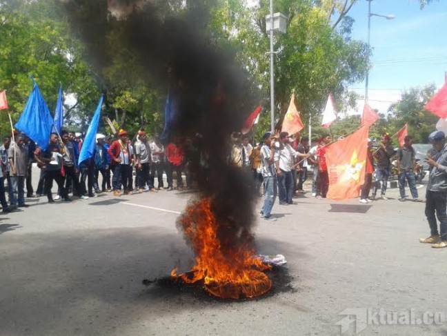 Mereka melampiaskan kekesalannya dengan membakar keranda tiruan serta pocong di depan pintu gerbang. Aksi bakar ini sebagai pertanda matinya keadilan.