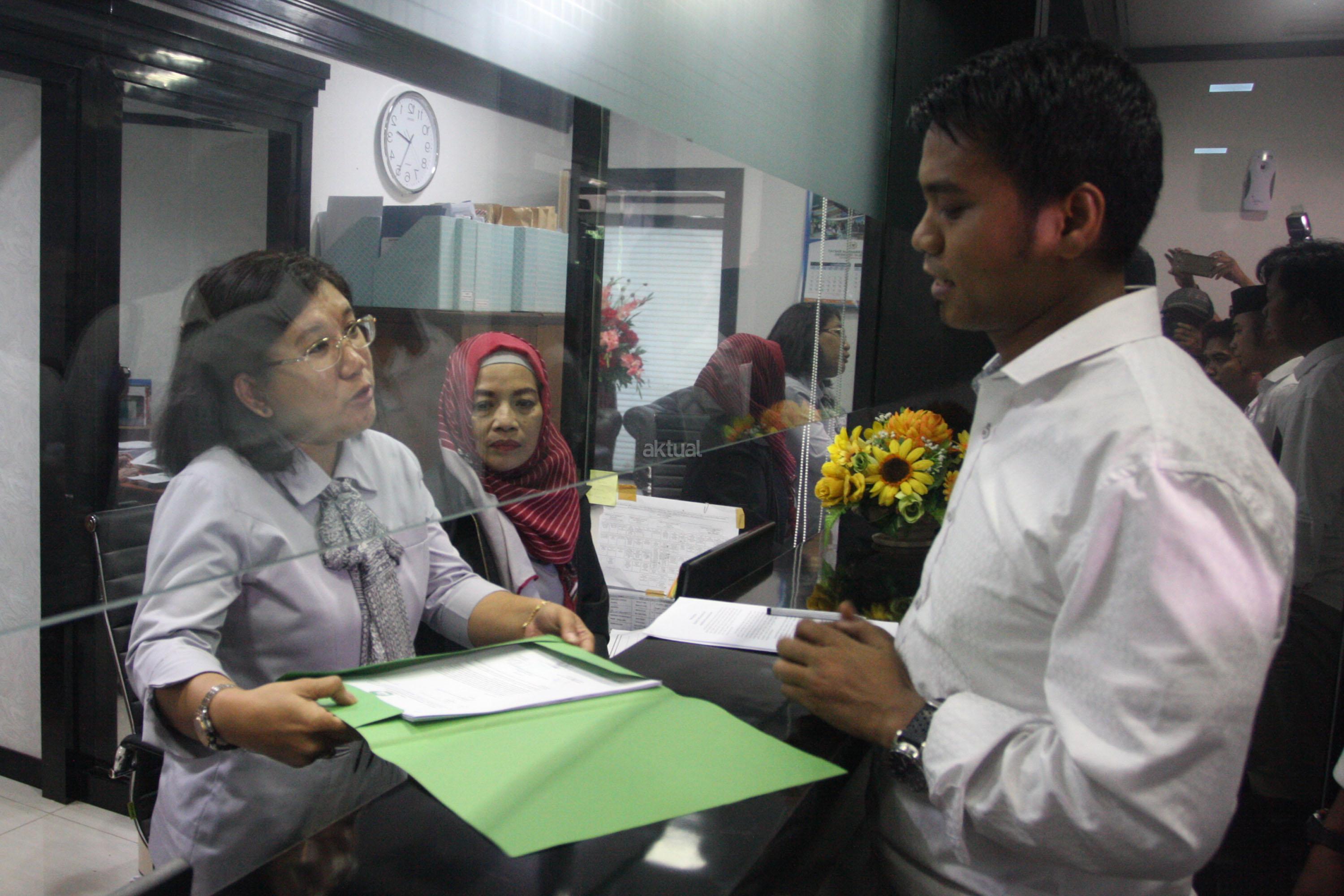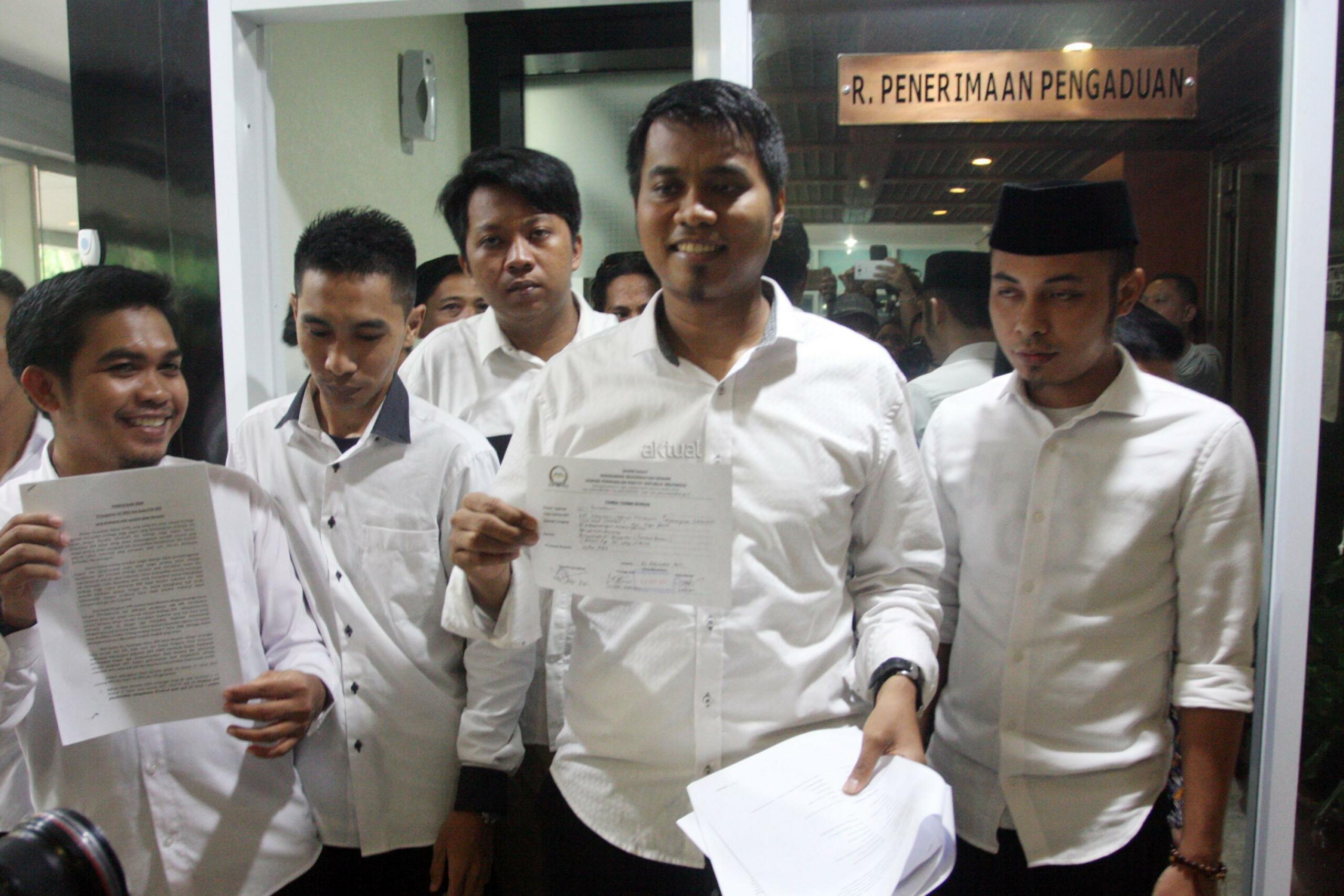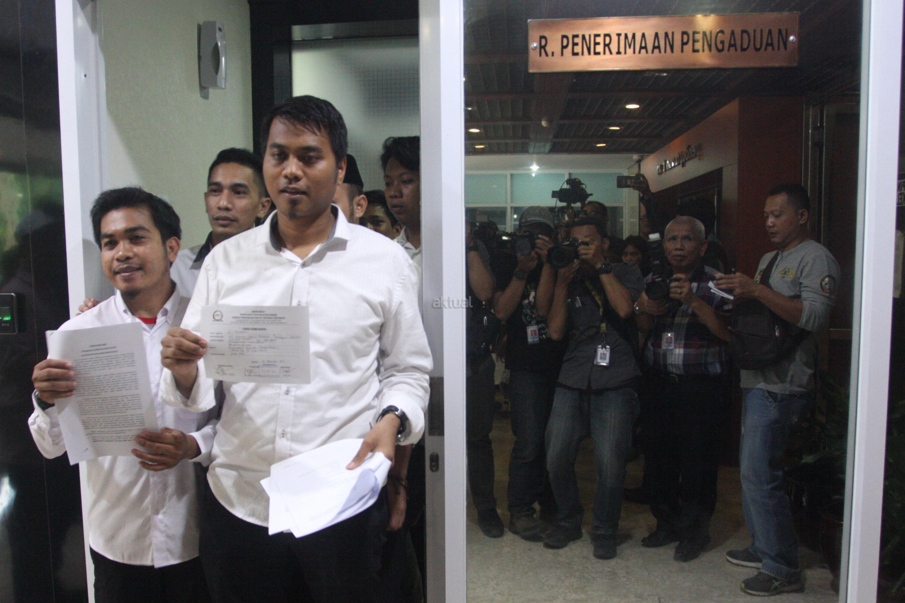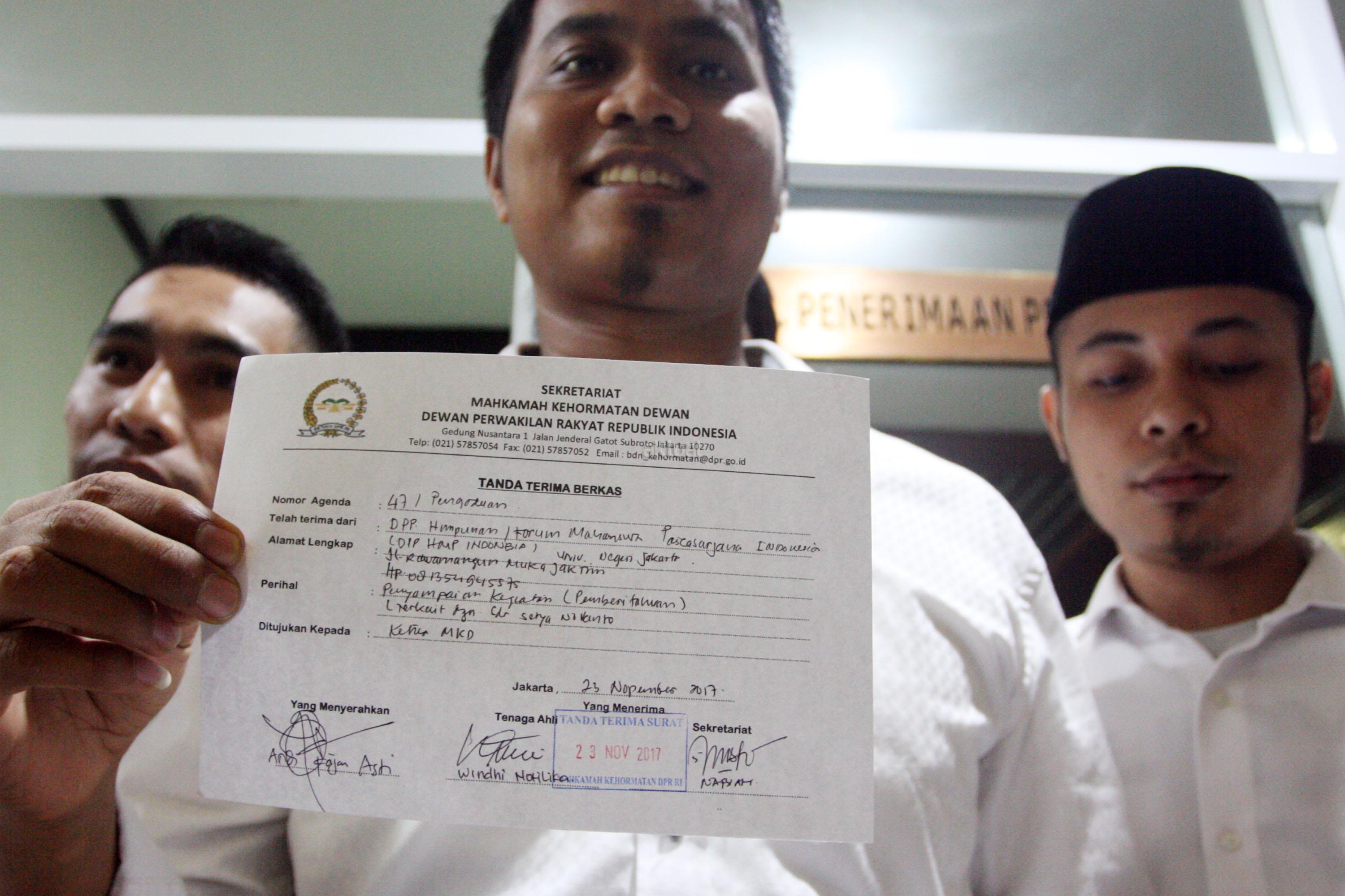 Ketua Umum Dewan Pengurus Pusat Himpunan Mahasiswa Pascasarjana Indonesia (HMPI) Andi Fajar Asti bersama sejumlah Pengurus HMPI menunjukan Tanda Terima Berkas, usai menyampaikan laporan ke Mahkamah Kehormatan Dewan (MKD), di Gedung Nusantara I, Kompleks Parlemen Senayan, Jakarta, Kamis (23/11). HMPI melaporkan dugaan Pelanggaran UU MD3 dan Kode Etik DPR yang dilakukan oleh Ketua DPR RI saudara Setya Novanto terkait kasus Hukum yang kini dihadapinya. AKTUAL/Tino Oktaviano
