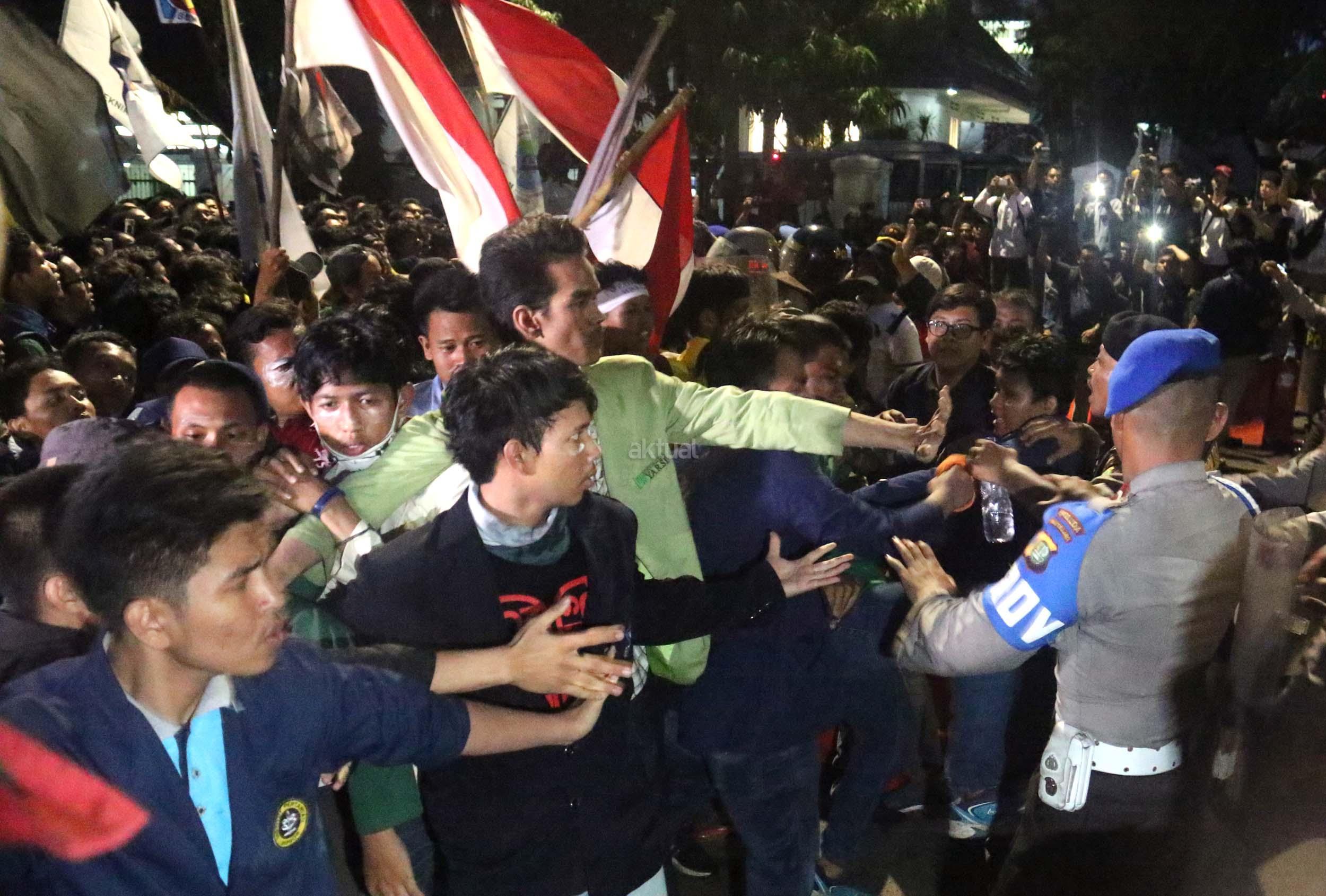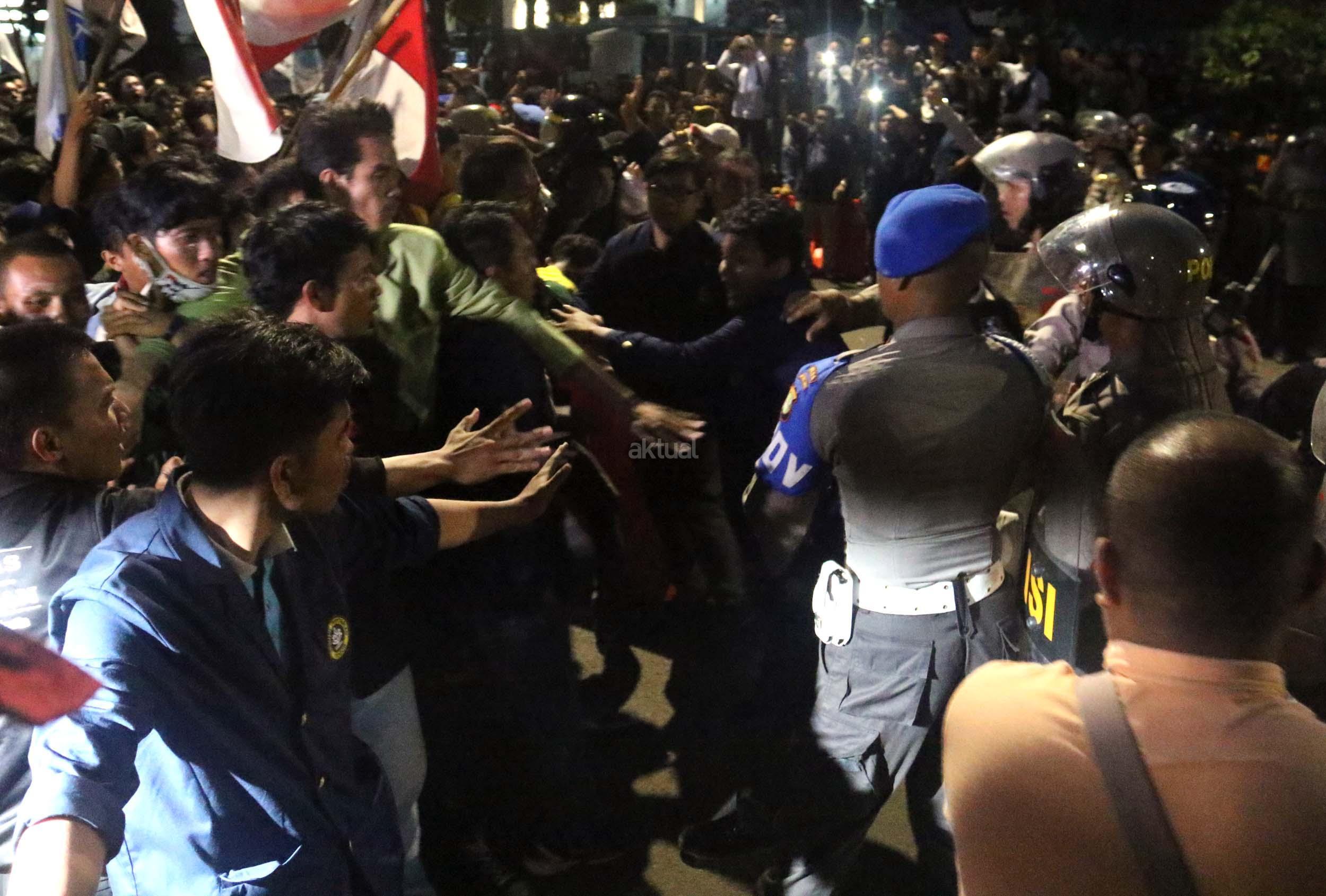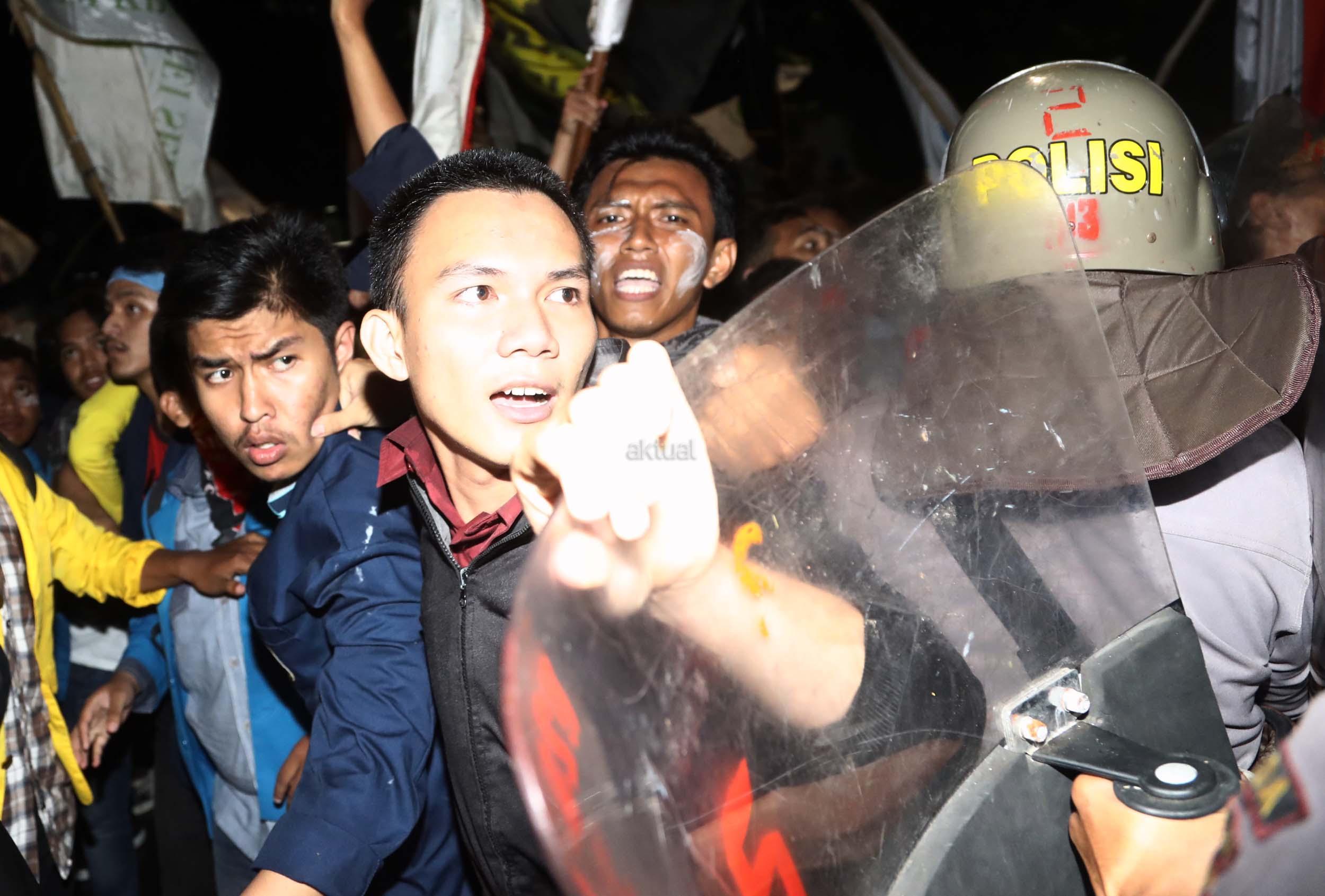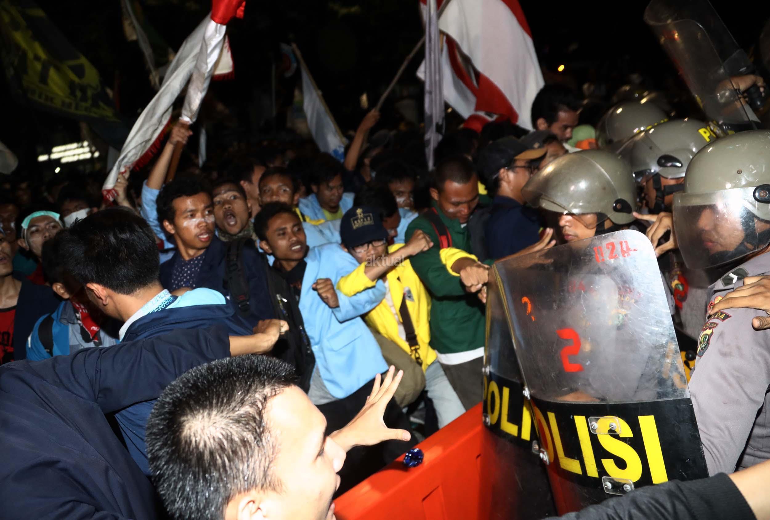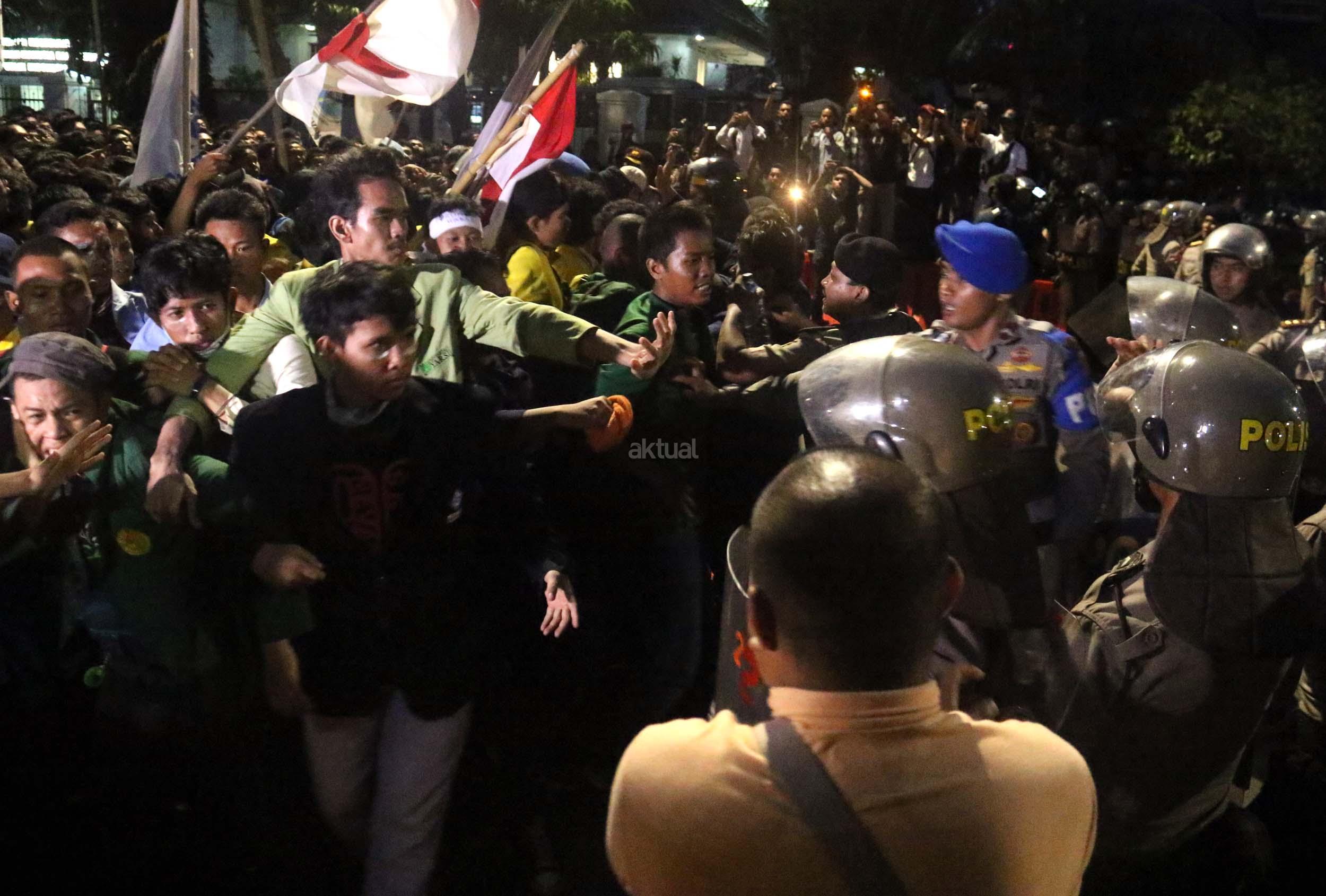 Ratusan mahasiswa dari berbagai Universitas terlibat aksi dorong-dorongan dengan pihak Kepolisian untuk bisa masuk ke Istana Merdeka, Jakarta, Kamis (12/1/2017) malam. Dalam aksinya para mahasiswa kecewa tidak bisa bertemu langsung dengan Presiden Jokowi dan mendapatkan jawaban yang mengecewakan dari pihak pemerintah.