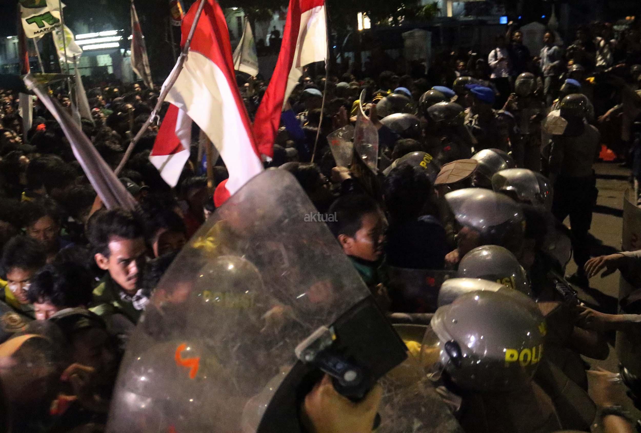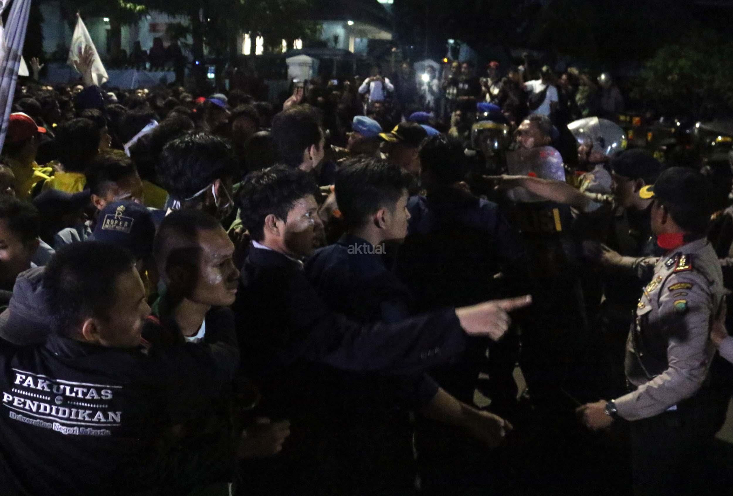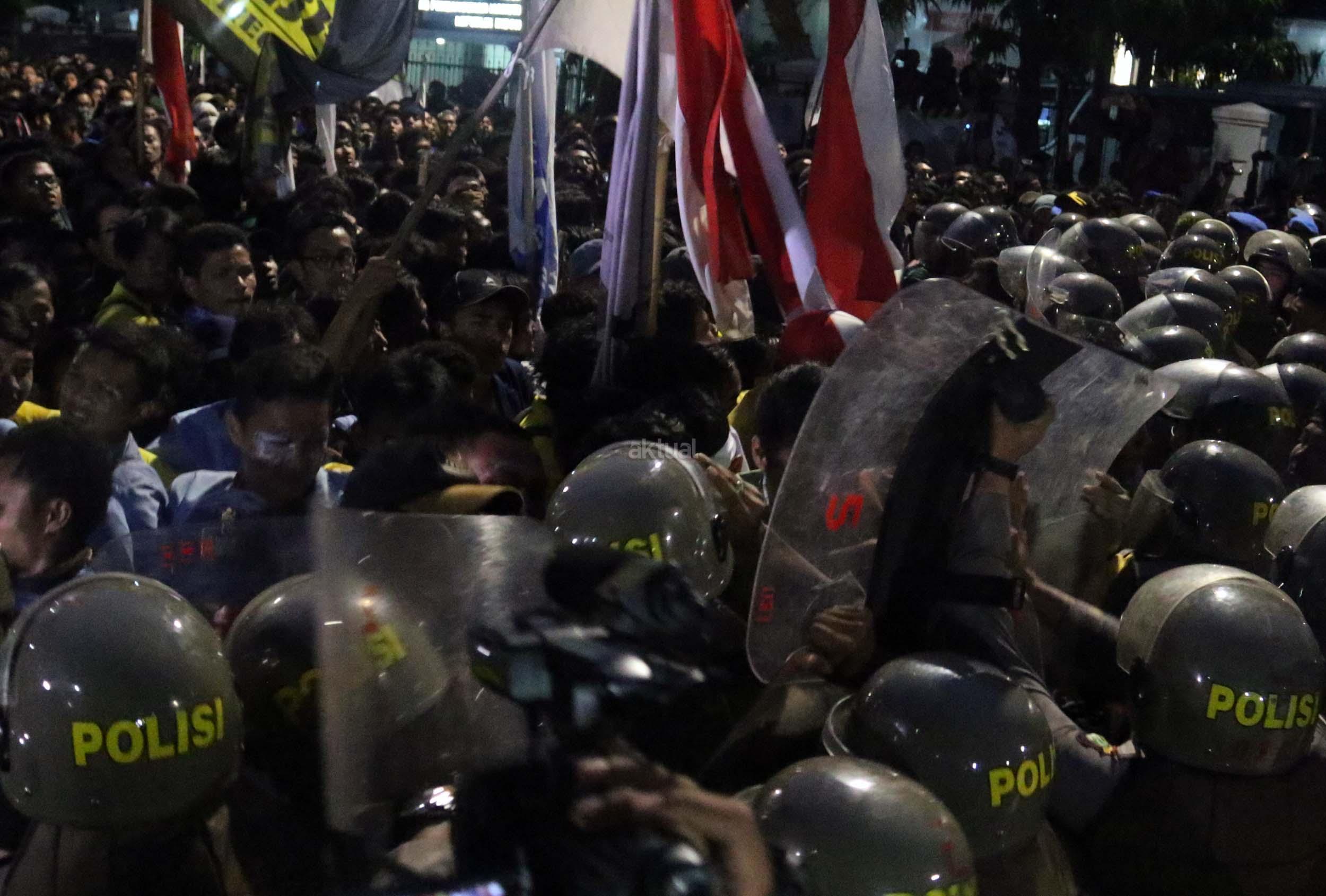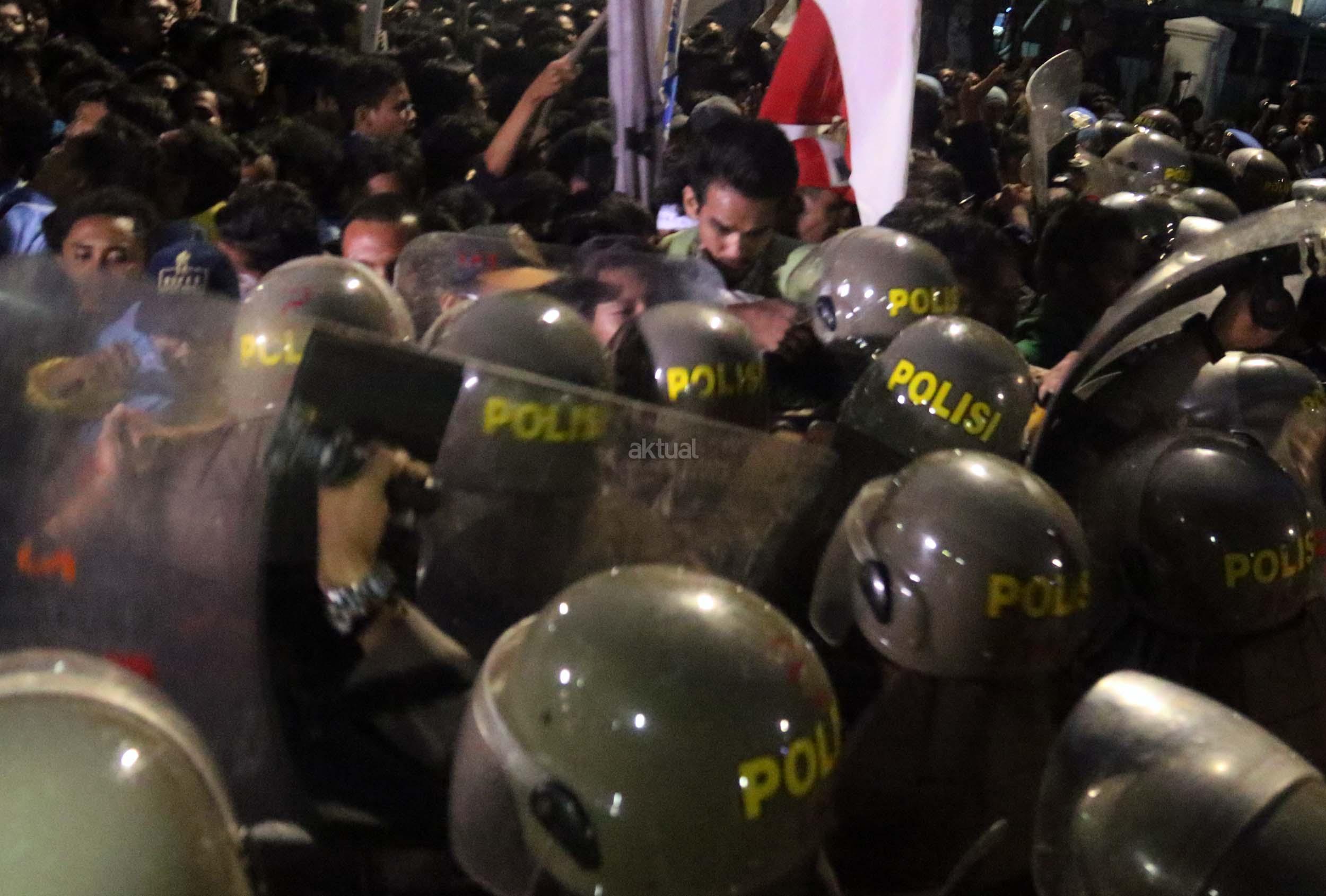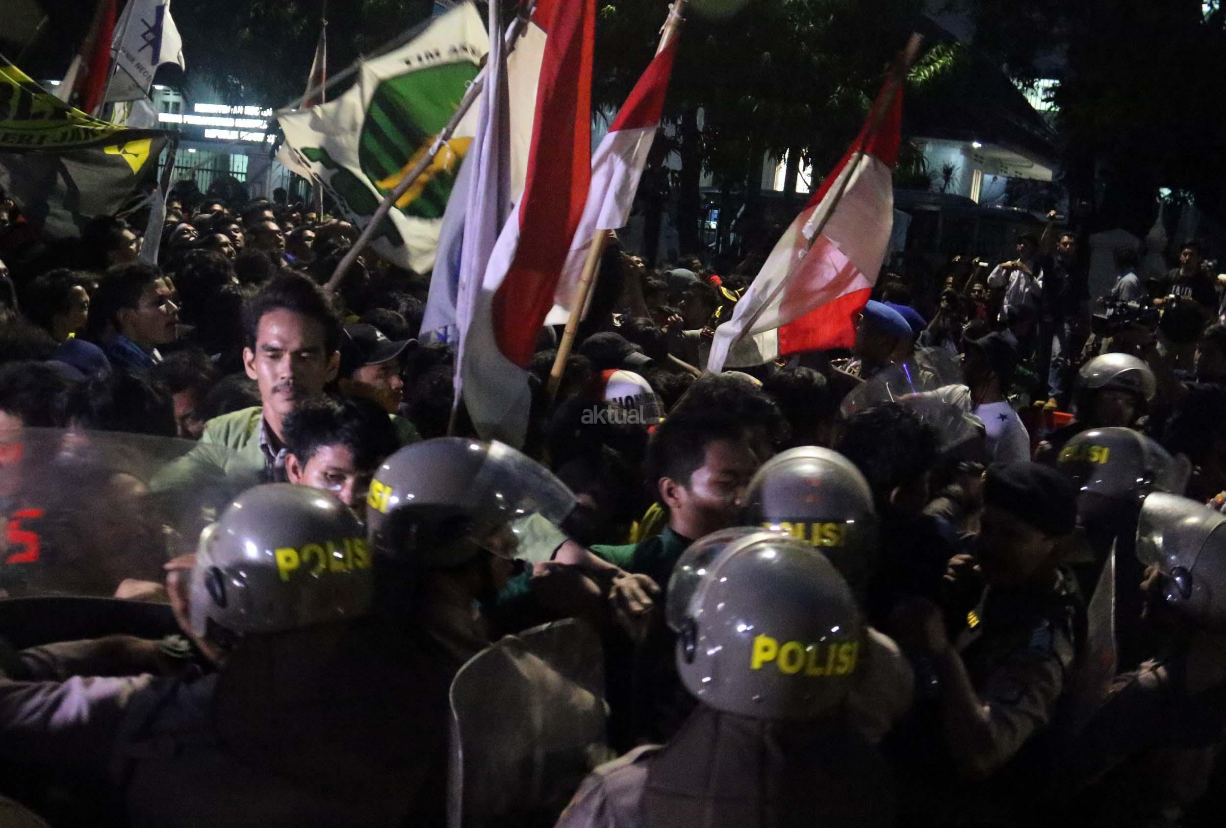 Ratusan mahasiswa dari berbagai Universitas terlibat aksi dorong-dorongan dengan pihak Kepolisian untuk bisa masuk ke Istana Merdeka, Jakarta, Kamis (12/1/2017) malam. Dalam aksinya para mahasiswa kecewa tidak bisa bertemu langsung dengan Presiden Jokowi dan mendapatkan jawaban yang mengecewakan dari pihak pemerintah.