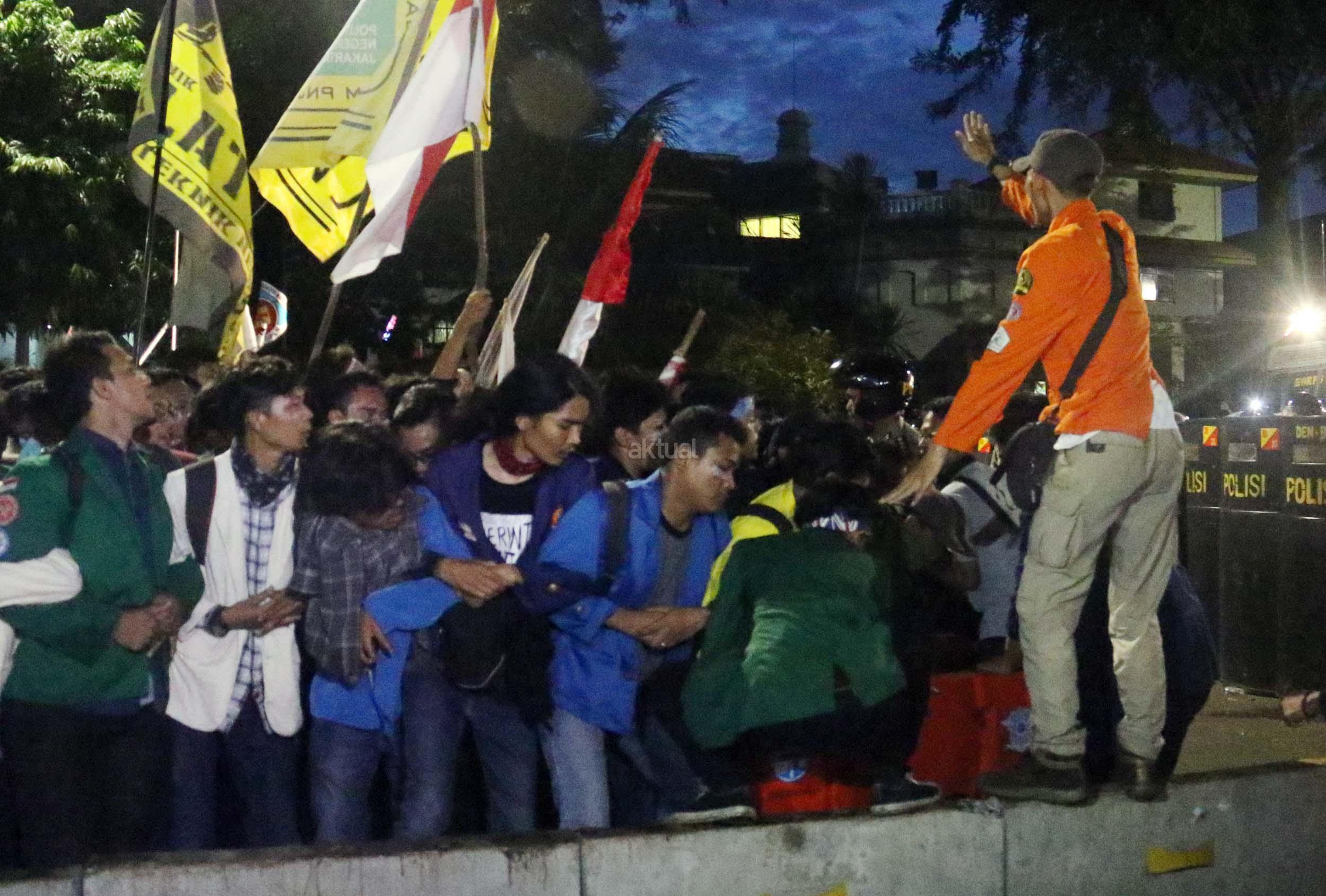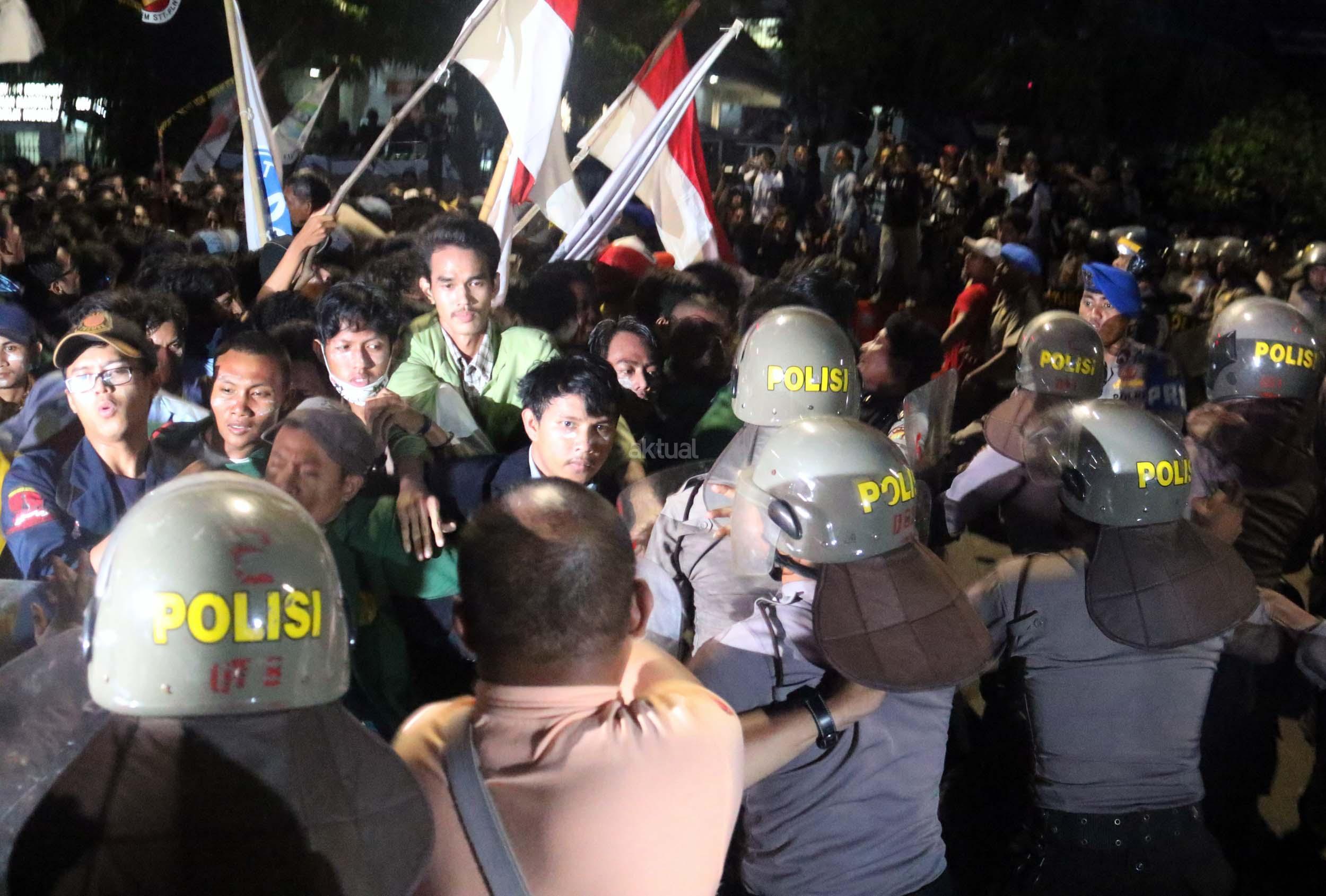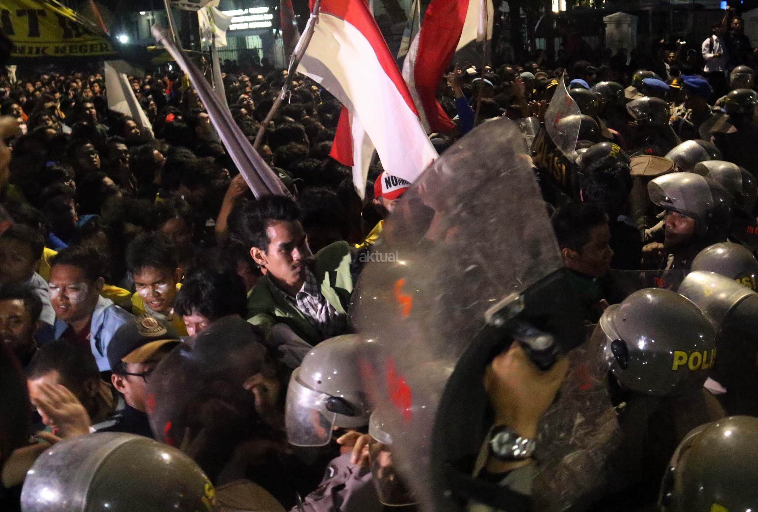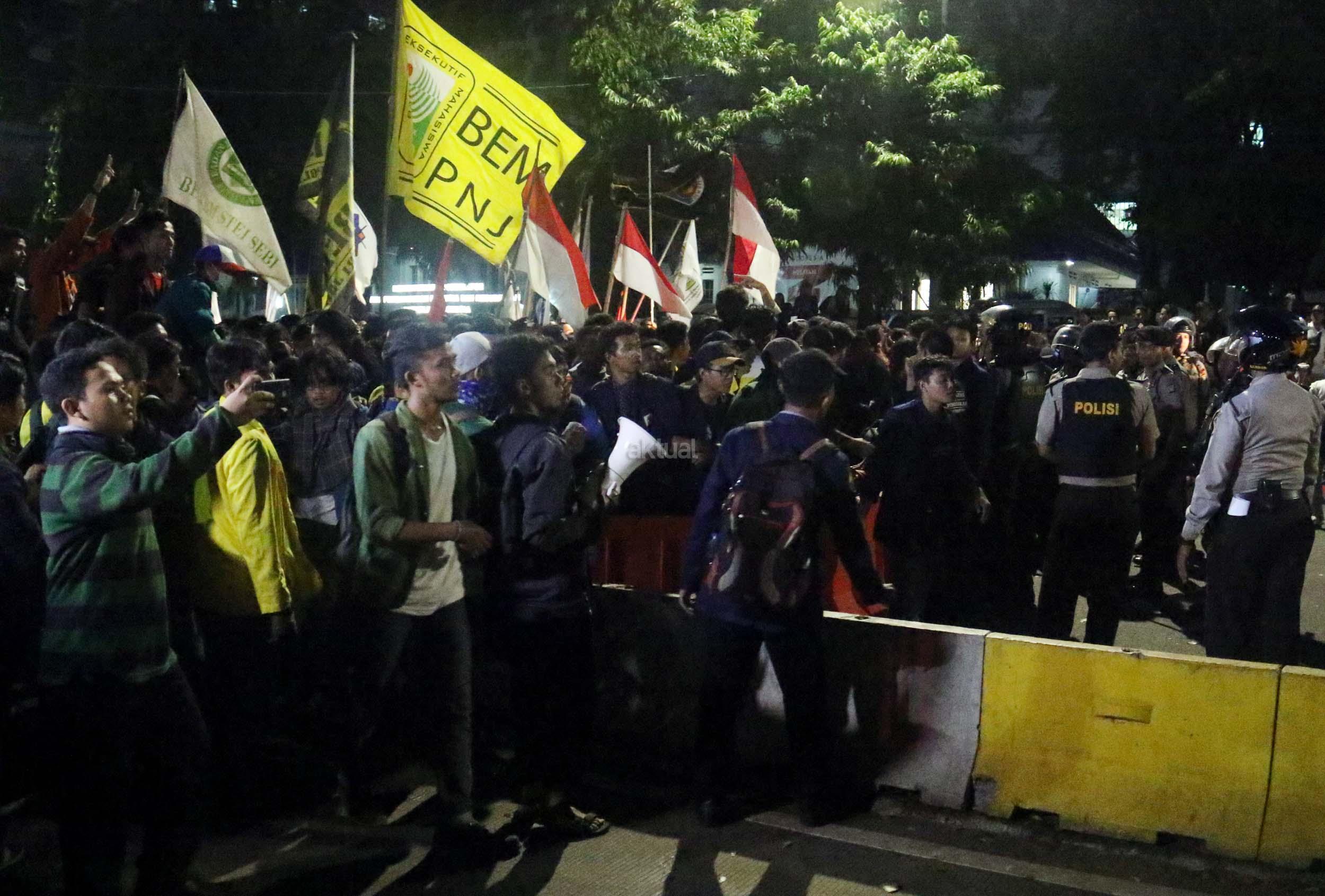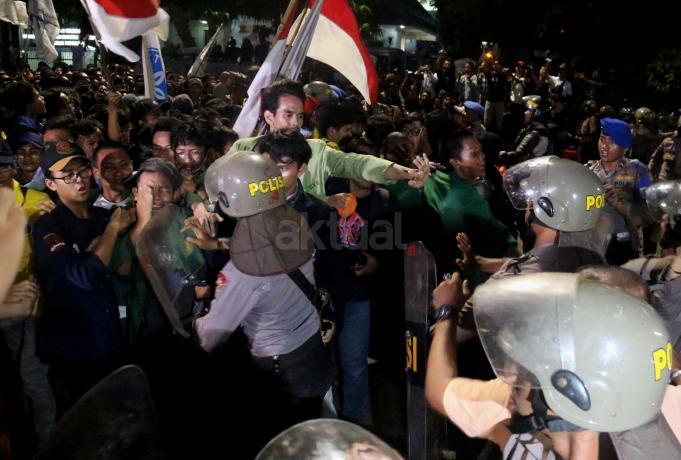 Ratusan mahasiswa dari berbagai Universitas terlibat aksi dorong-dorongan dengan pihak Kepolisian untuk bisa masuk ke Istana Merdeka, Jakarta, Kamis (12/1/2017) malam. Dalam aksinya para mahasiswa kecewa tidak bisa bertemu langsung dengan Presiden Jokowi dan mendapatkan jawaban yang mengecewakan dari pihak pemerintah.
