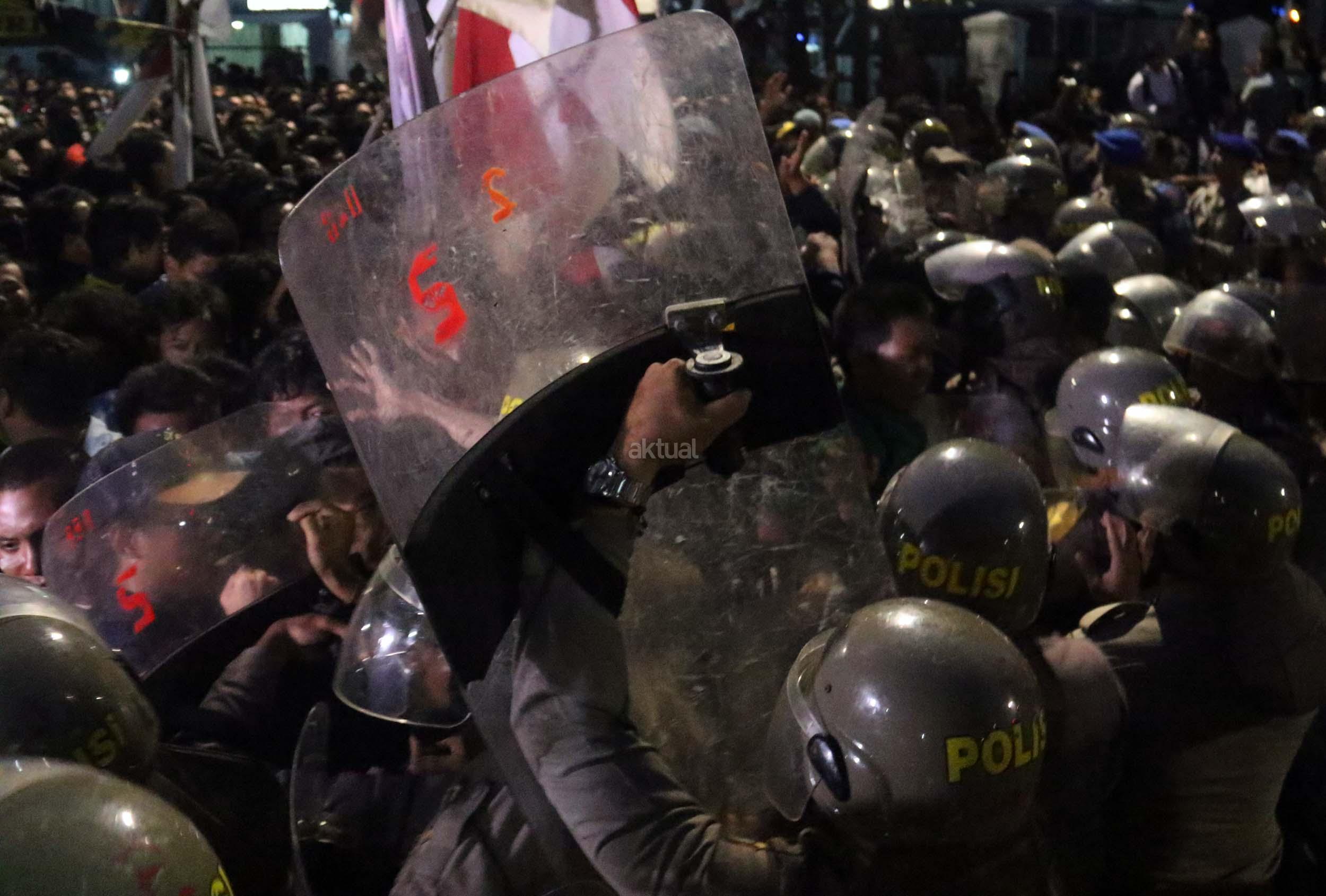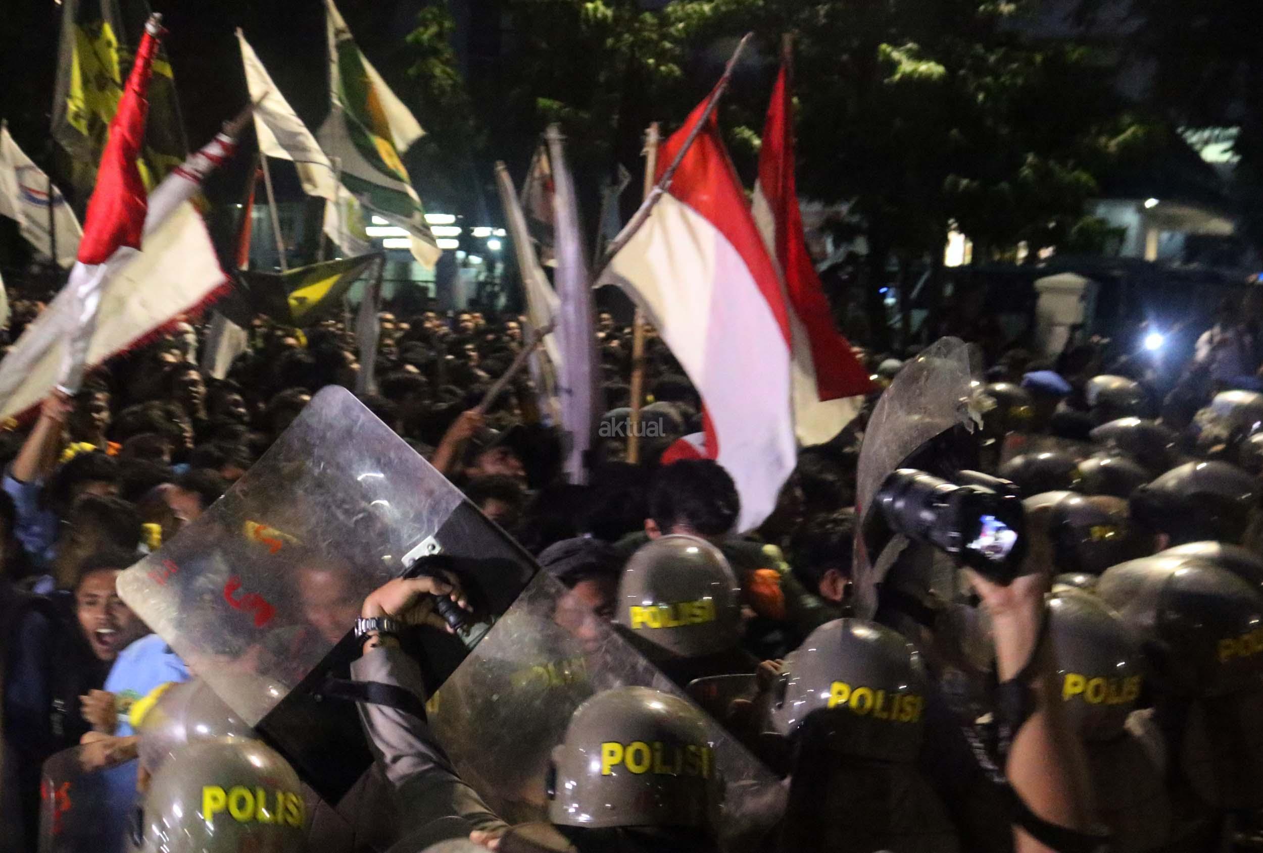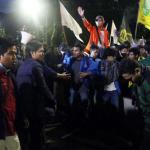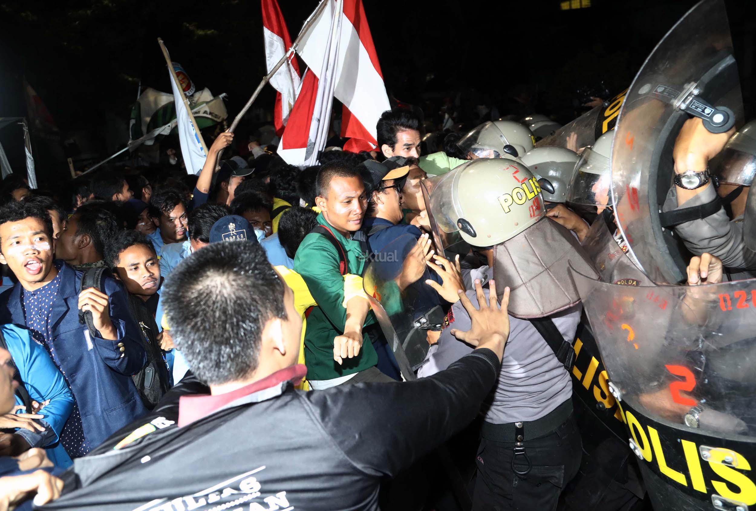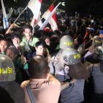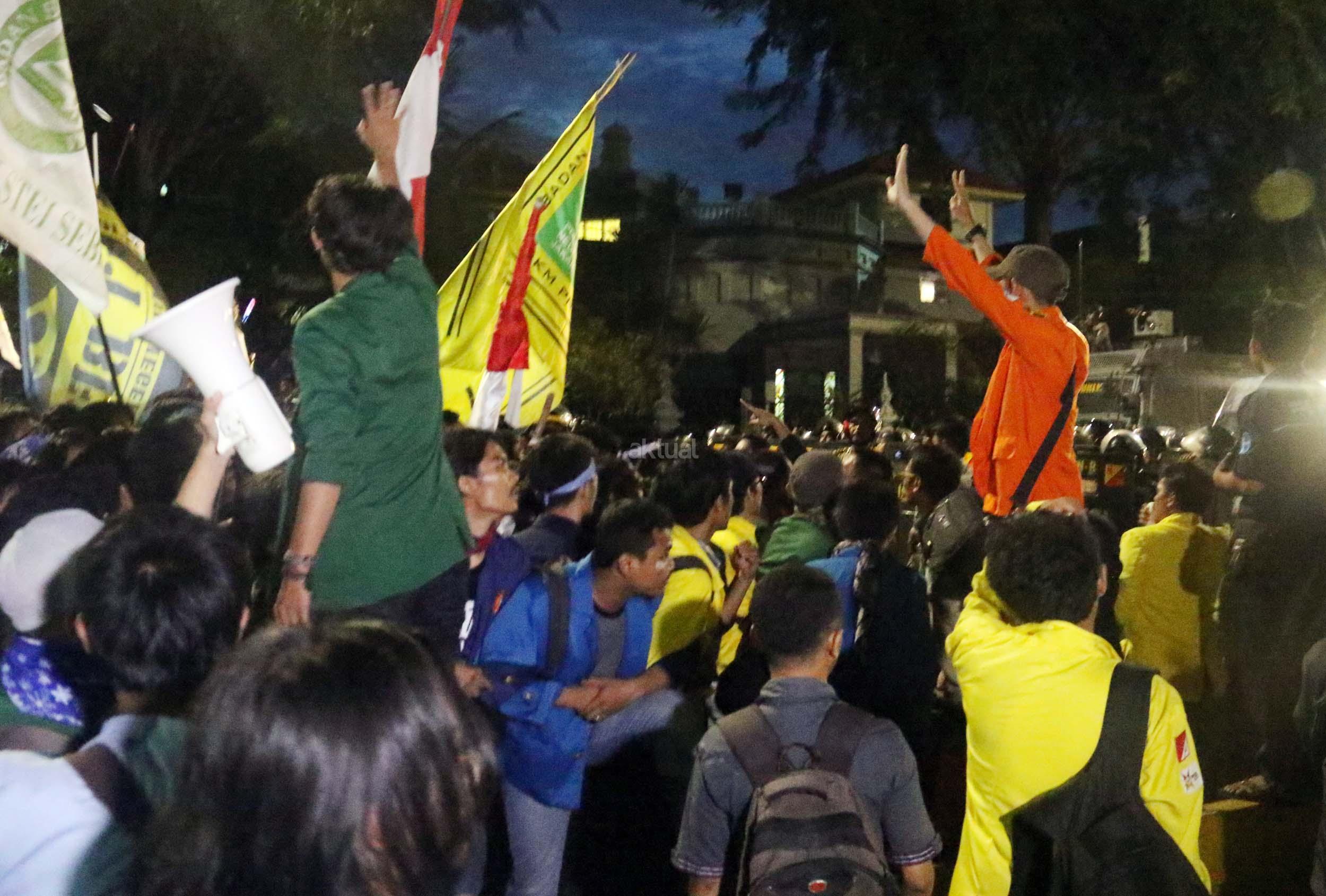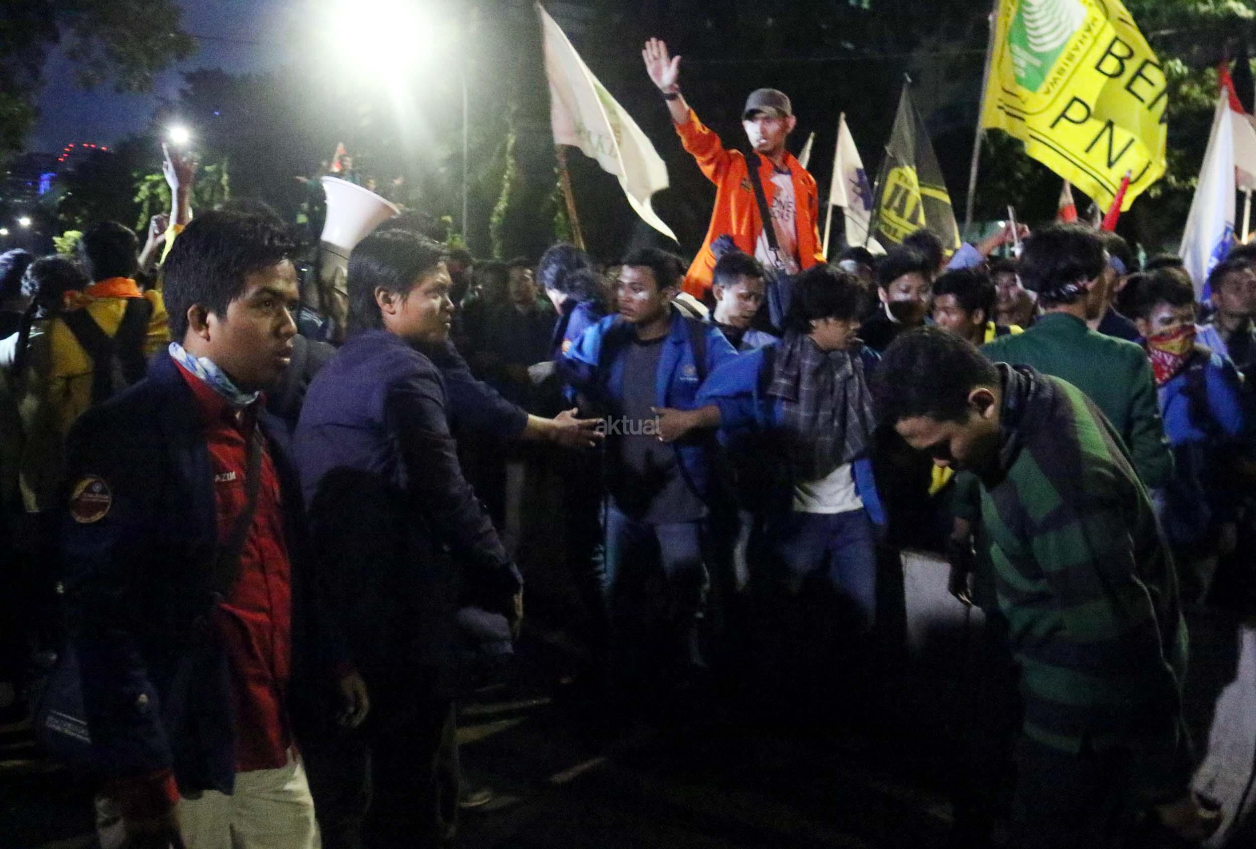 Ratusan mahasiswa dari berbagai Universitas terlibat aksi dorong-dorongan dengan pihak Kepolisian untuk bisa masuk ke Istana Merdeka, Jakarta, Kamis (12/1/2017) malam. Dalam aksinya para mahasiswa kecewa tidak bisa bertemu langsung dengan Presiden Jokowi dan mendapatkan jawaban yang mengecewakan dari pihak pemerintah.