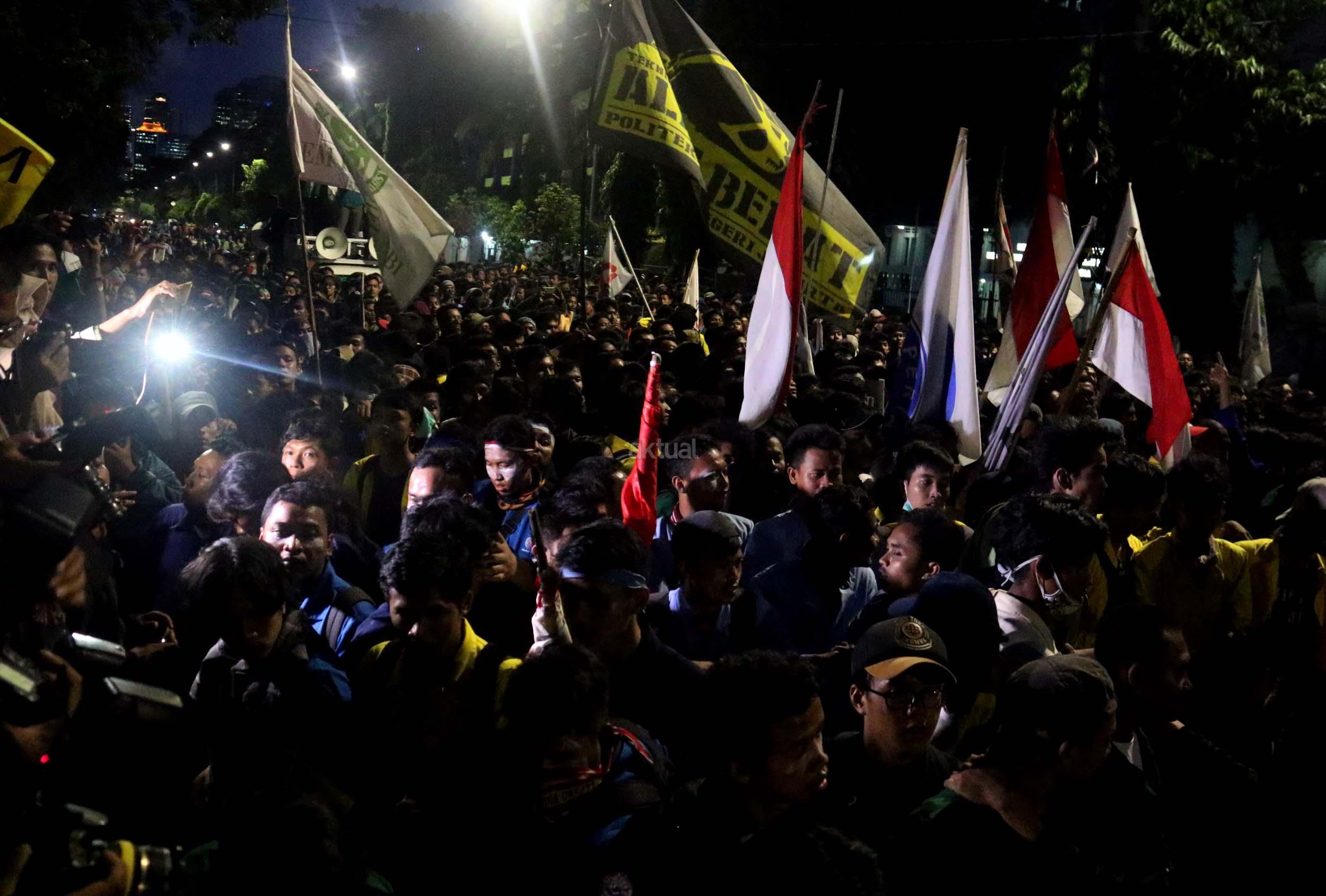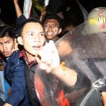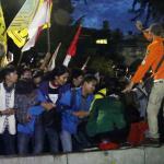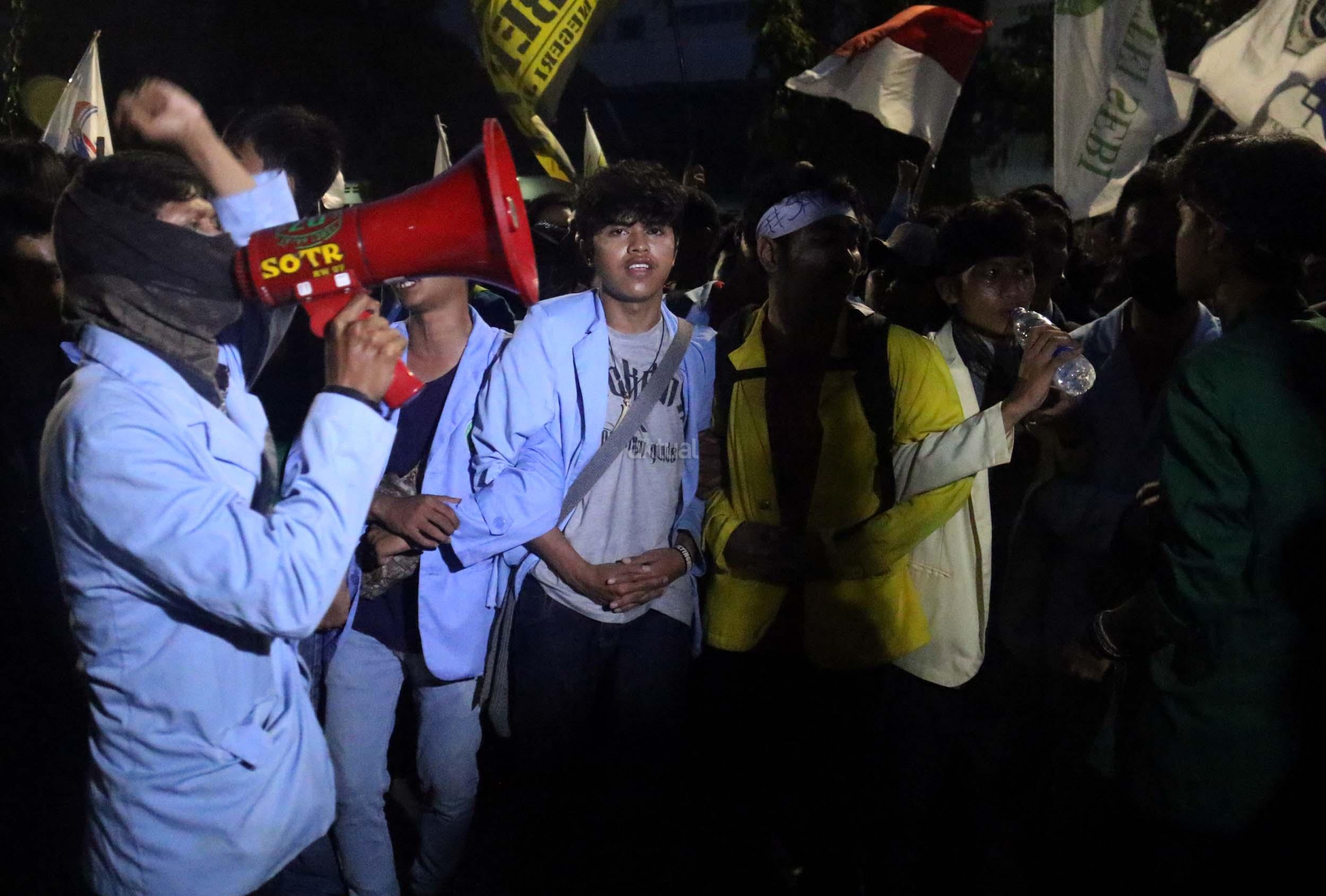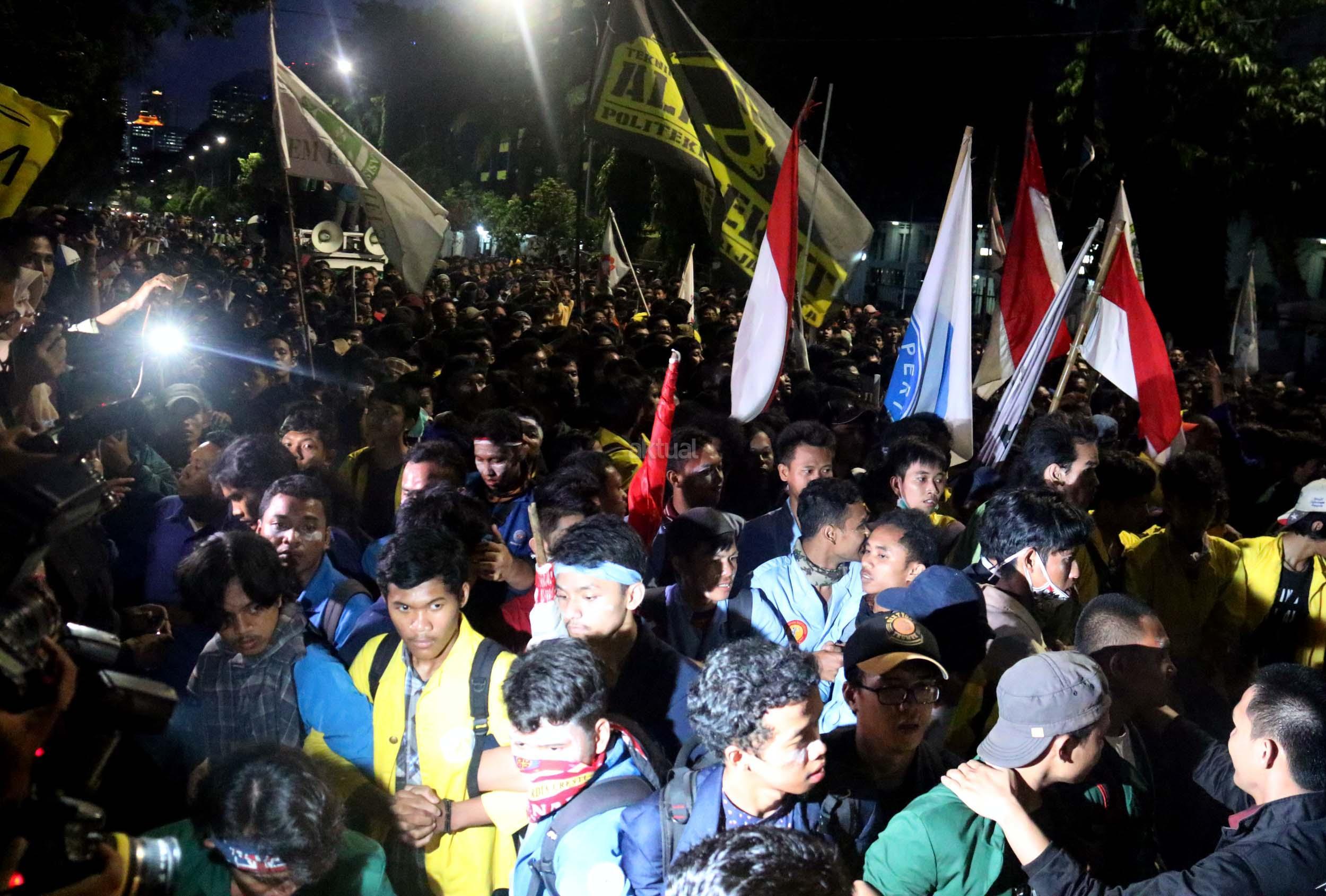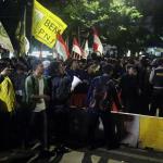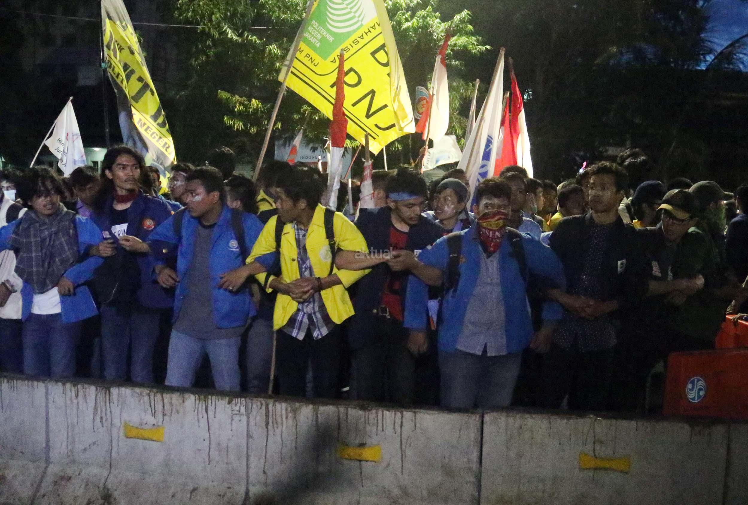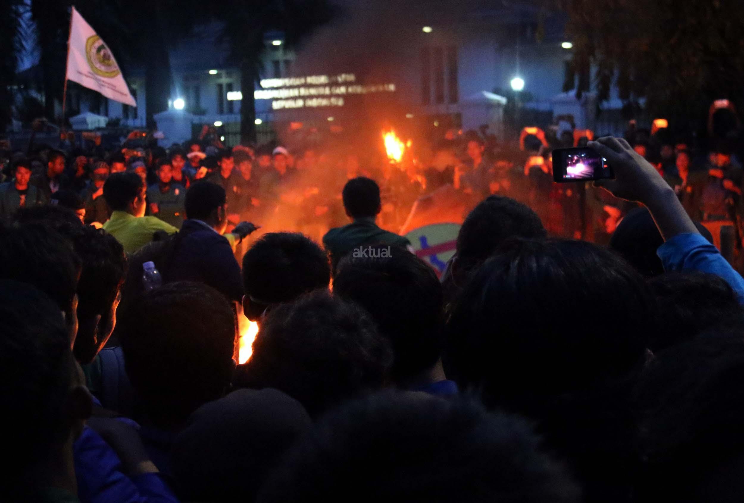 Ratusan mahasiswa dari berbagai Universitas terlibat aksi dorong-dorongan dengan pihak Kepolisian untuk bisa masuk ke Istana Merdeka, Jakarta, Kamis (12/1/2017) malam. Dalam aksinya para mahasiswa kecewa tidak bisa bertemu langsung dengan Presiden Jokowi dan mendapatkan jawaban yang mengecewakan dari pihak pemerintah.