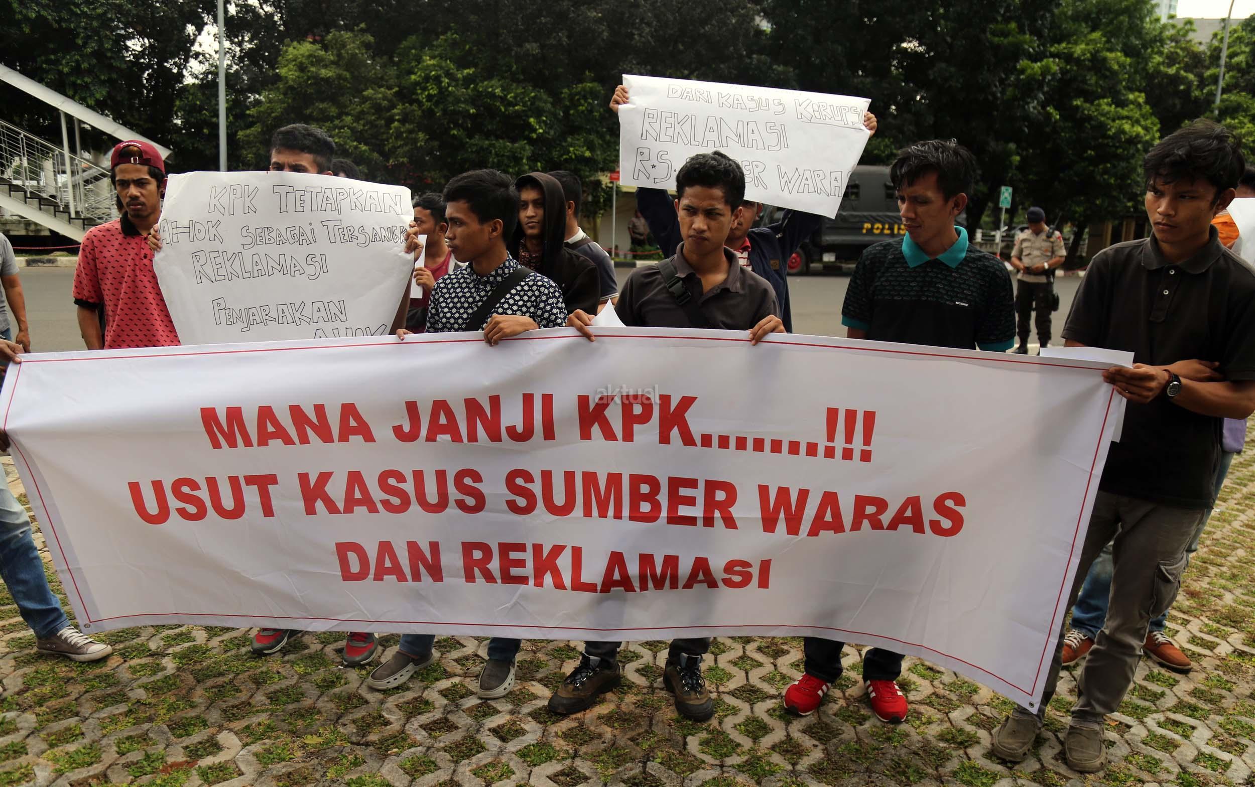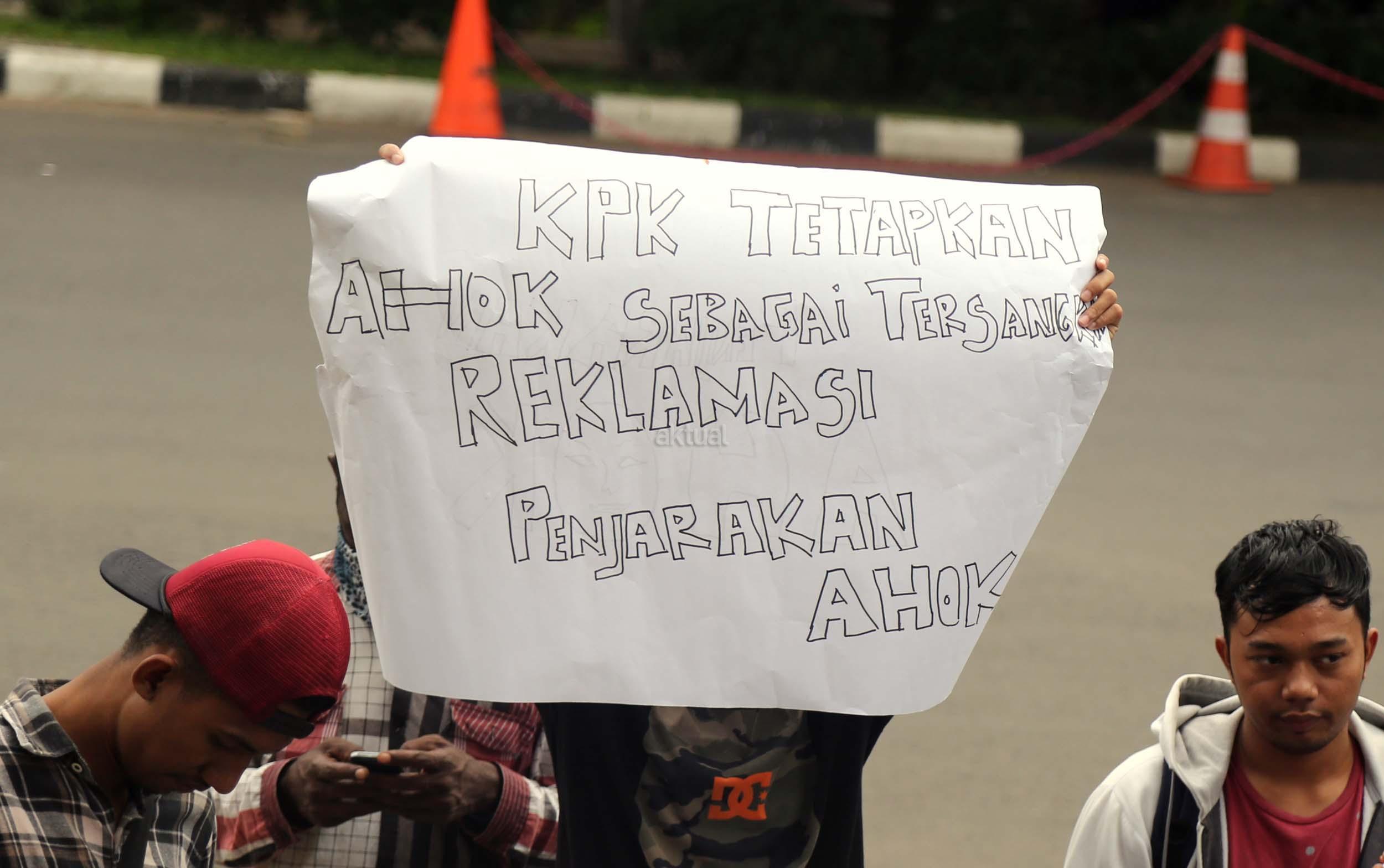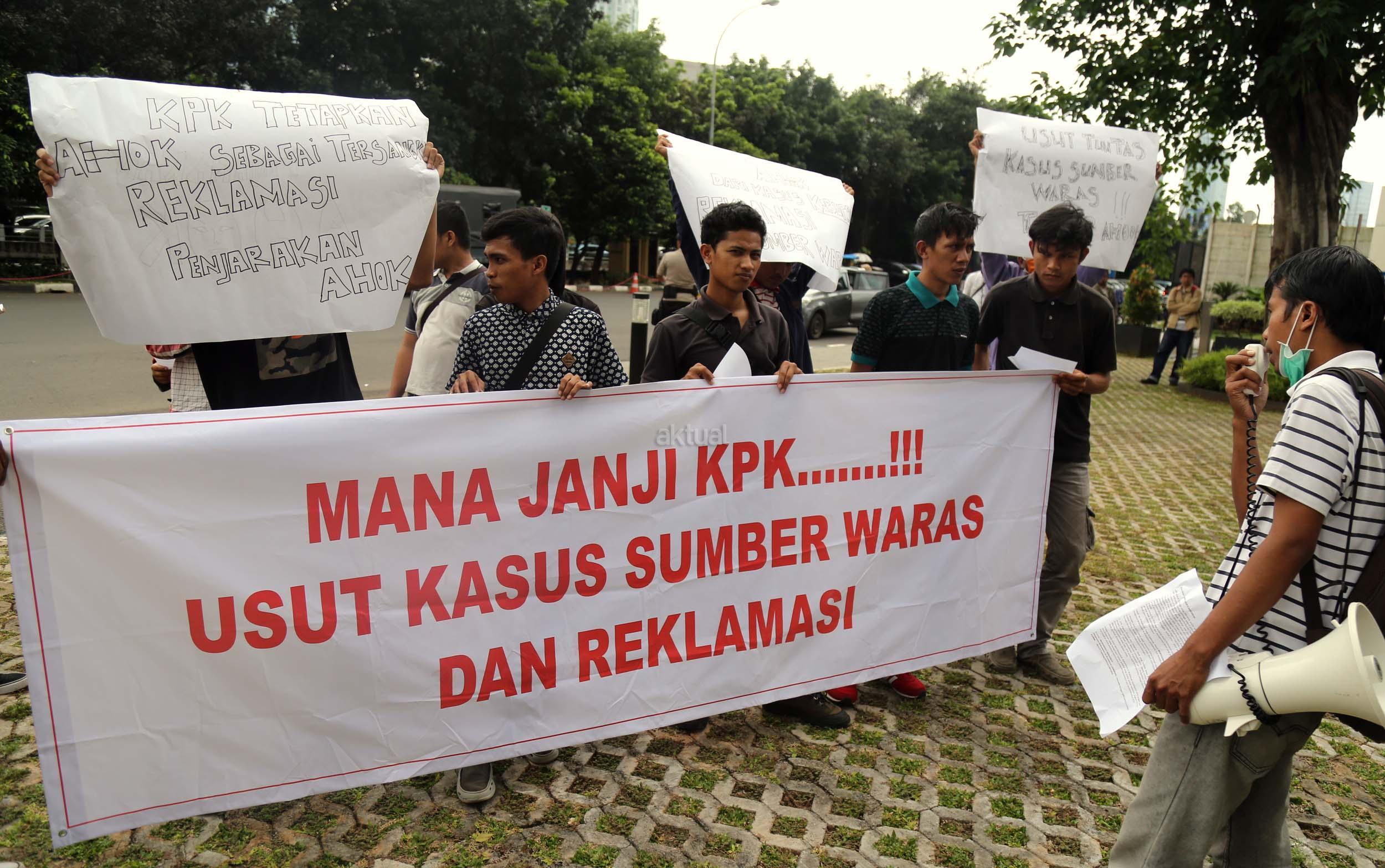 Dalam aksinya para mahasiswa menagih janji pimpinan KPK untuk tidak menutup kasus korupsi Gubernur Penista Agama Basuki Tjahja Purnama (Ahok) dalam pembelian lahan RS Sumber Waras dan kasus Reklamasi Teluk Jakarta dan segera tangkap Gubernur Penista Agama Basuki Tjahja Purnama (Ahok). AKTUAL/Munzir