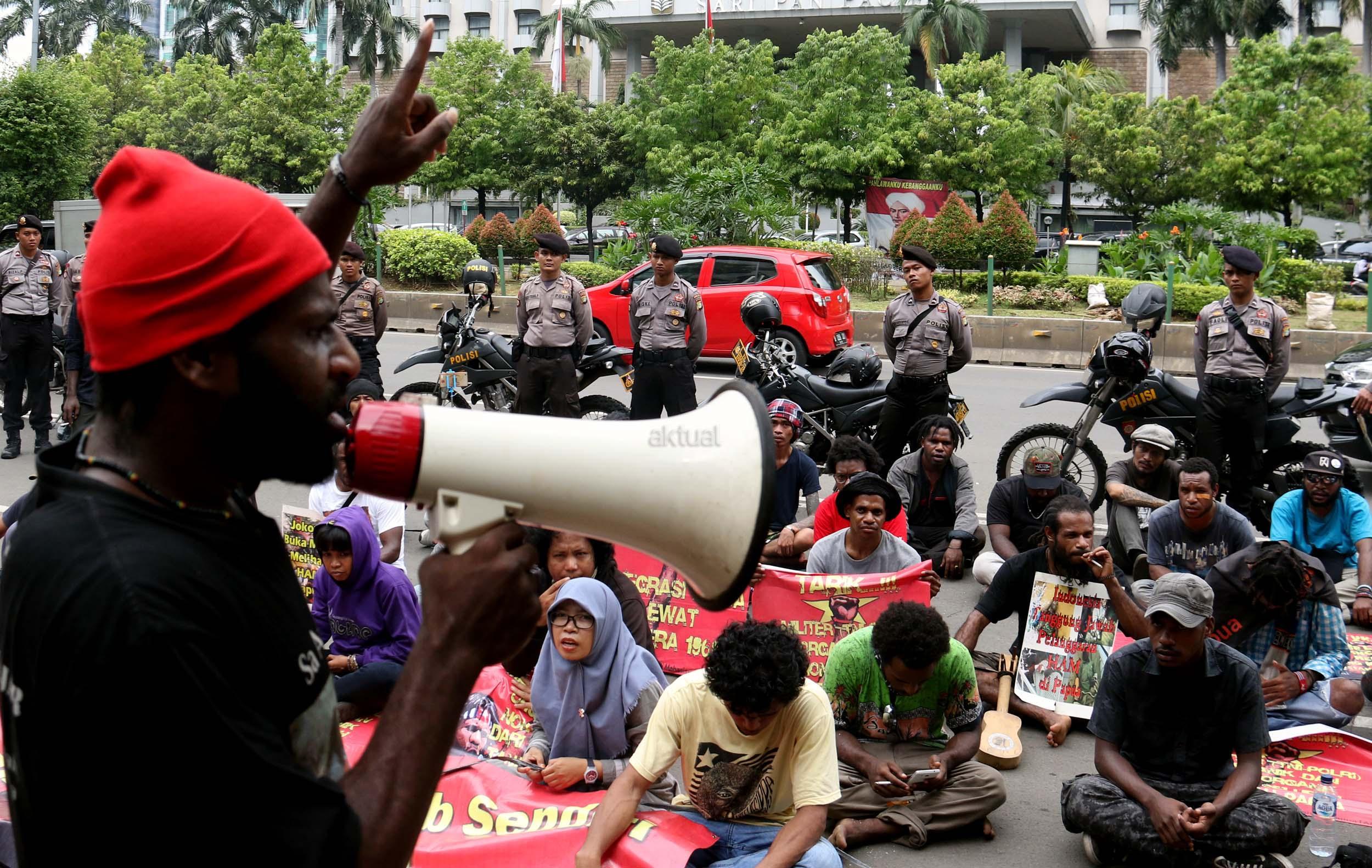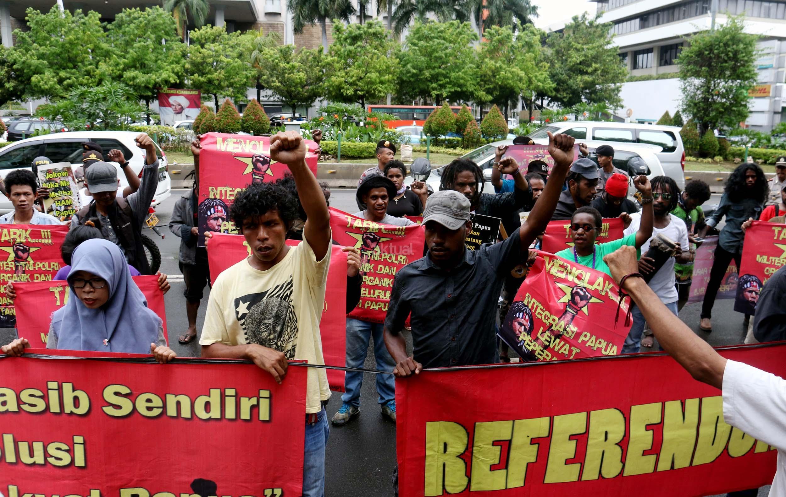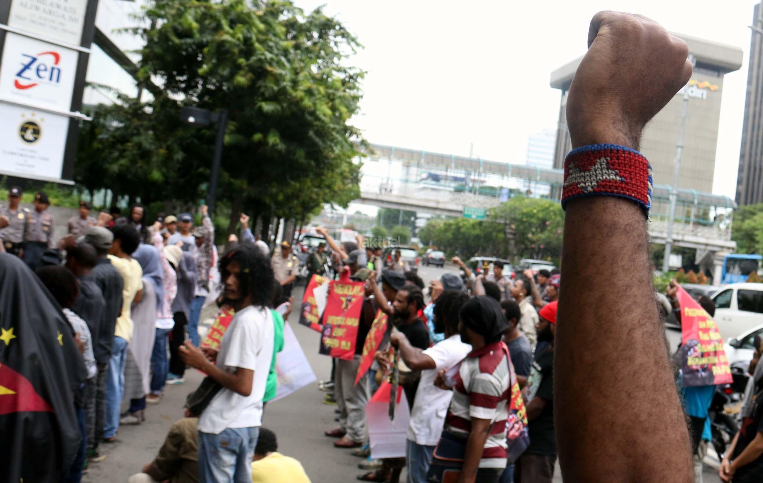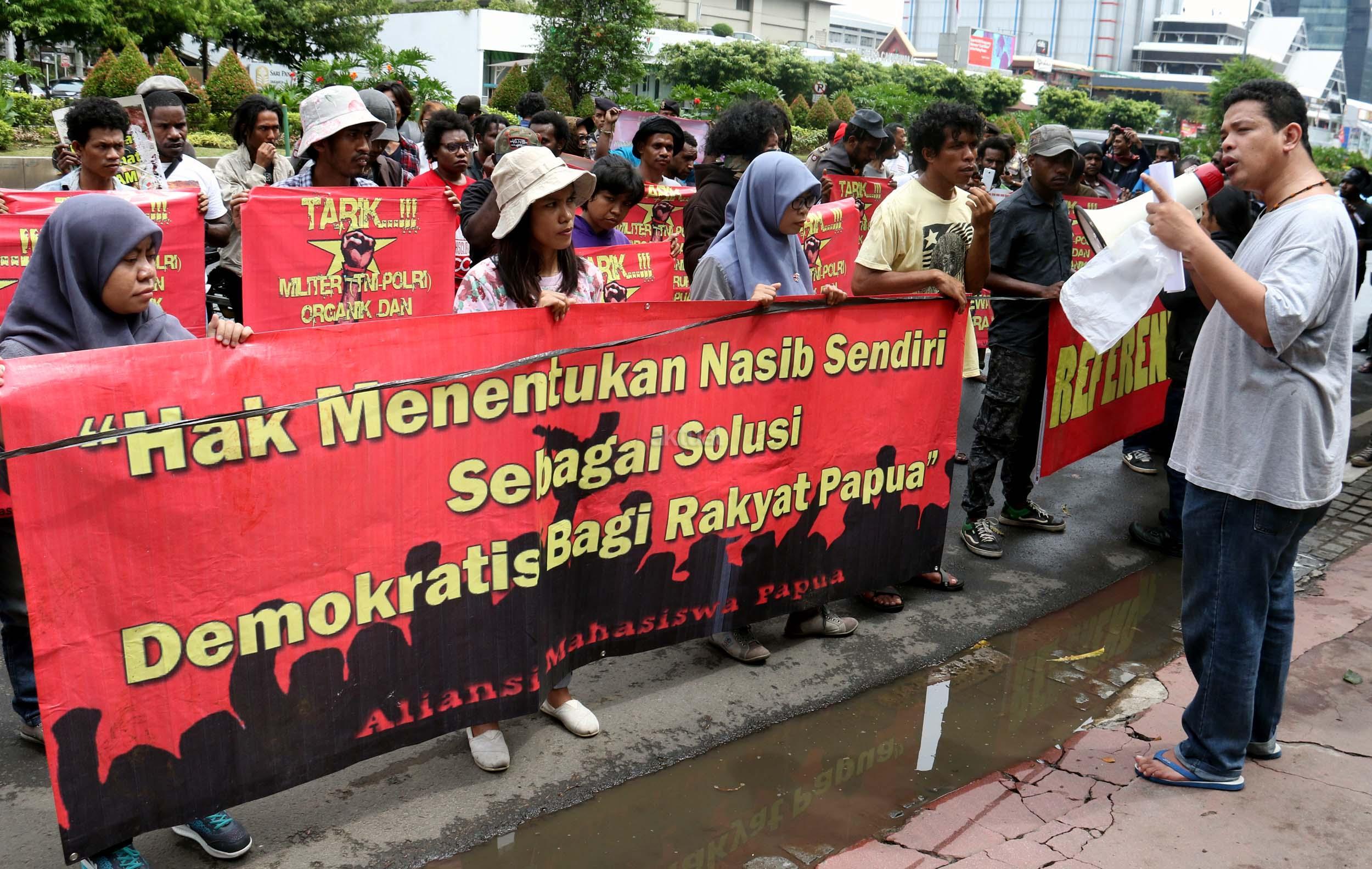 Sejumlah massa yang tergabung dalam FRI-West Papua dan Aliansi Mahasiswa Papua (AMP) melakukan aksi di depan gedung perwakilan PBB Jalan.MH.Thamrin, Jakarta Pusat, Senin (19/12/2016). Dalam aksinya FRI-West Papua dan Aliansi Mahasiswa Papua (AMP) mendesak PBB beserta rezim Jokowi – JK untuk segera menuntaskan pelanggaran HAM yang terjadi di Papua dan memberikan kebebesan, Hak menentukan nasib sendiri rakyat Papua.