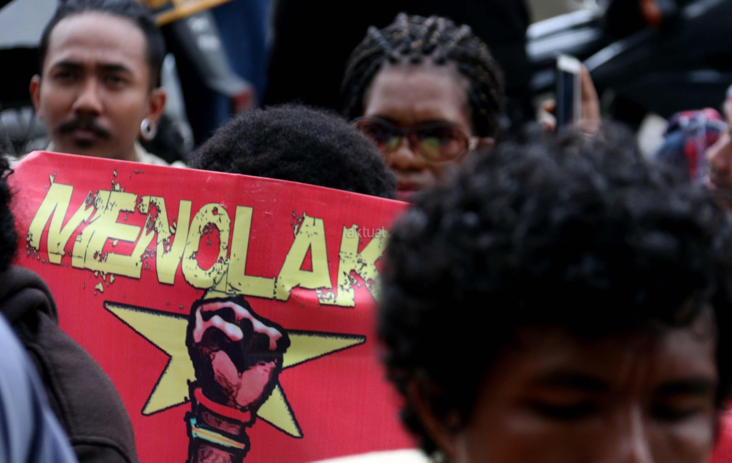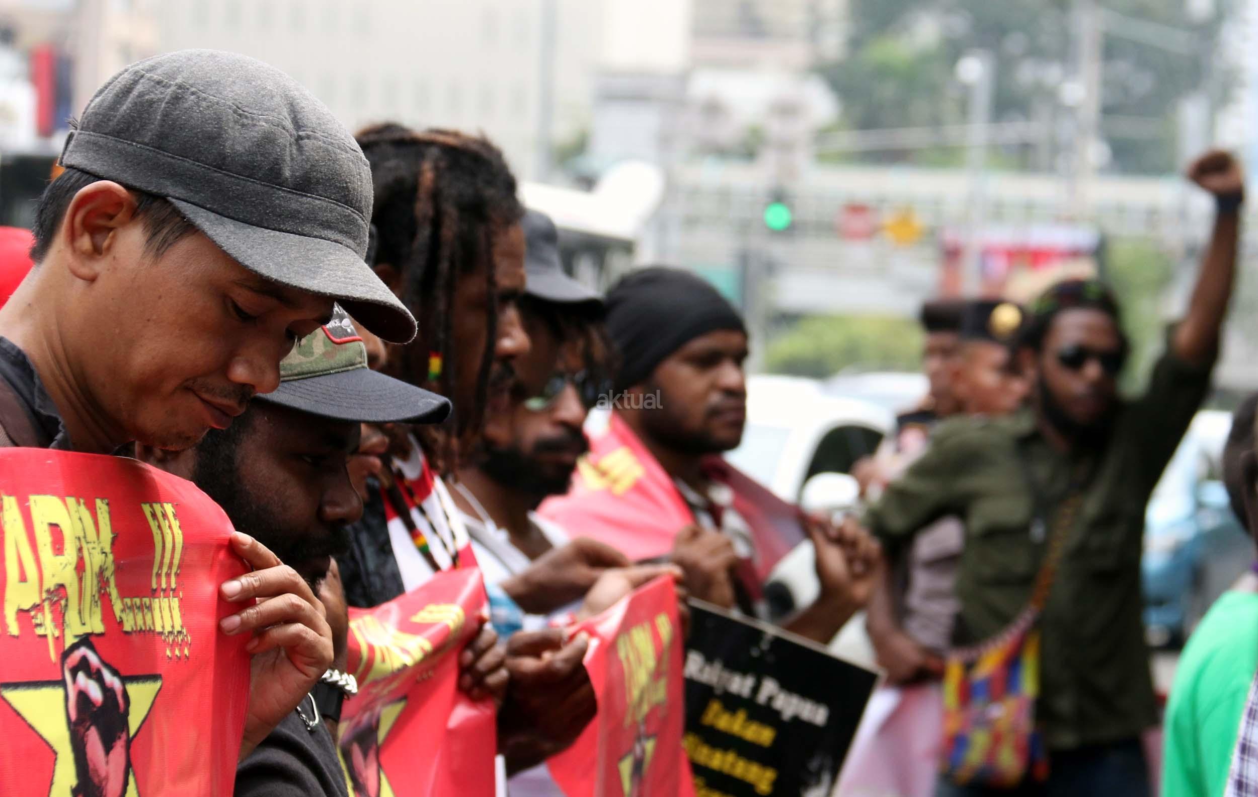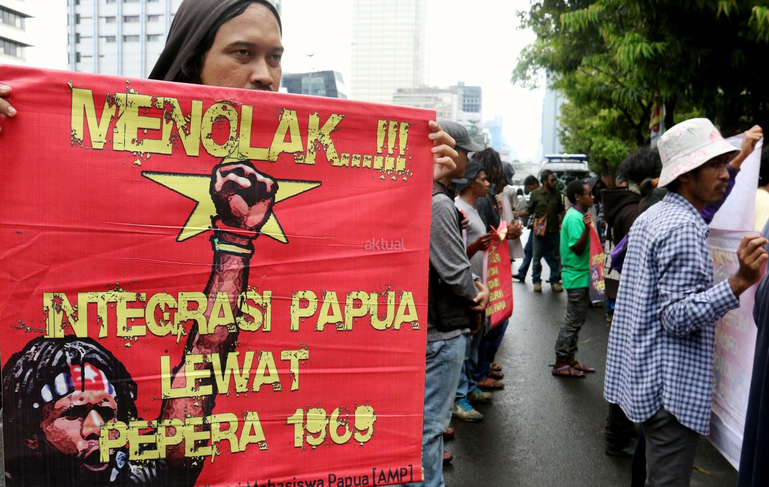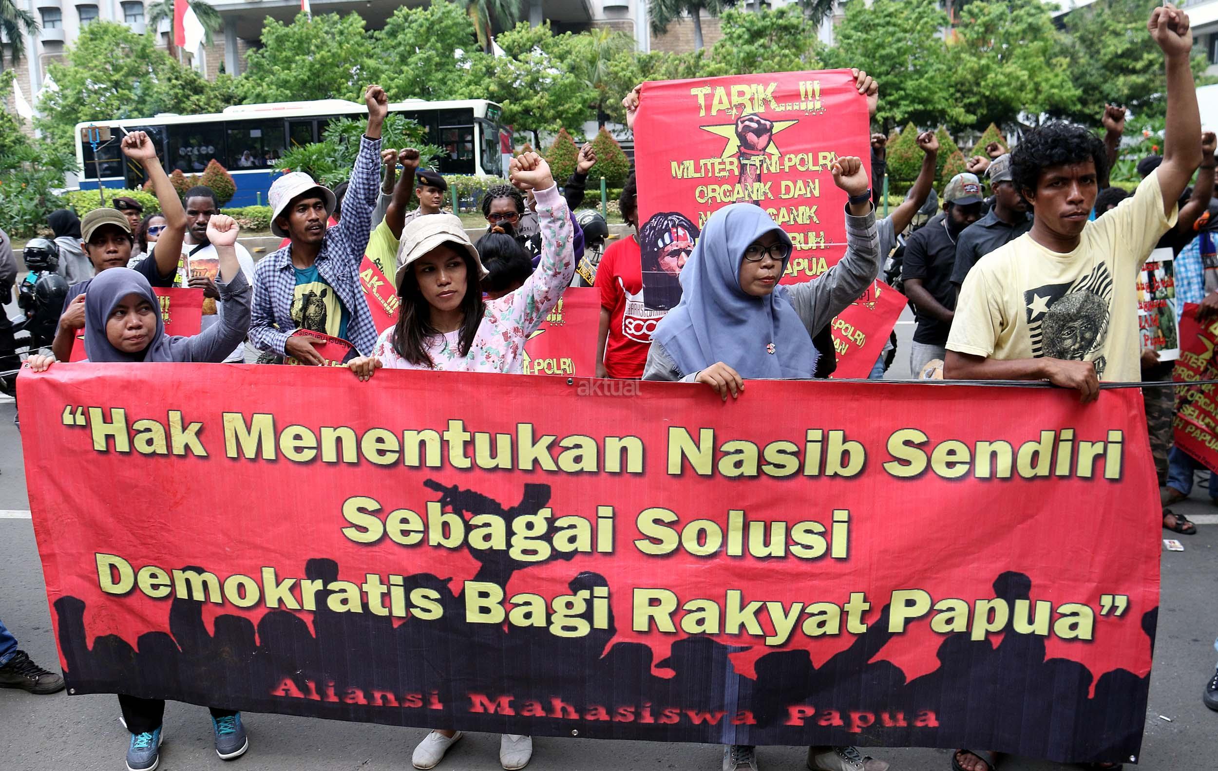 Sejumlah massa yang tergabung dalam FRI-West Papua dan Aliansi Mahasiswa Papua (AMP) melakukan aksi di depan gedung perwakilan PBB Jalan.MH.Thamrin, Jakarta Pusat, Senin (19/12/2016). Dalam aksinya FRI-West Papua dan Aliansi Mahasiswa Papua (AMP) mendesak PBB beserta rezim Jokowi – JK untuk segera menuntaskan pelanggaran HAM yang terjadi di Papua dan memberikan kebebesan, Hak menentukan nasib sendiri rakyat Papua.