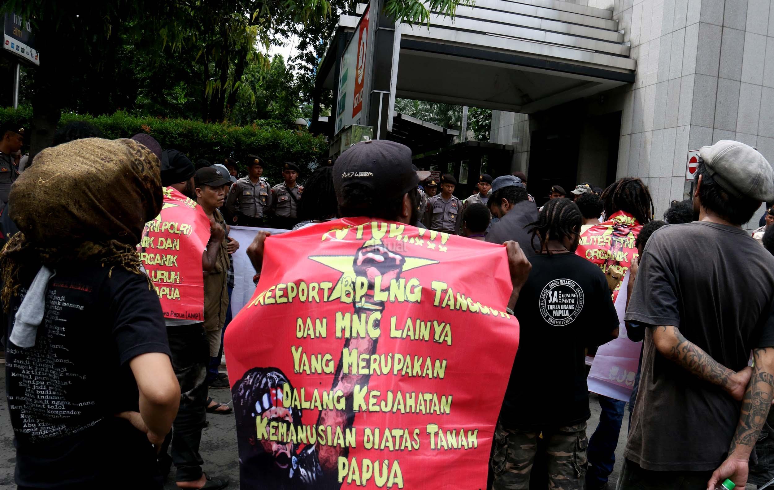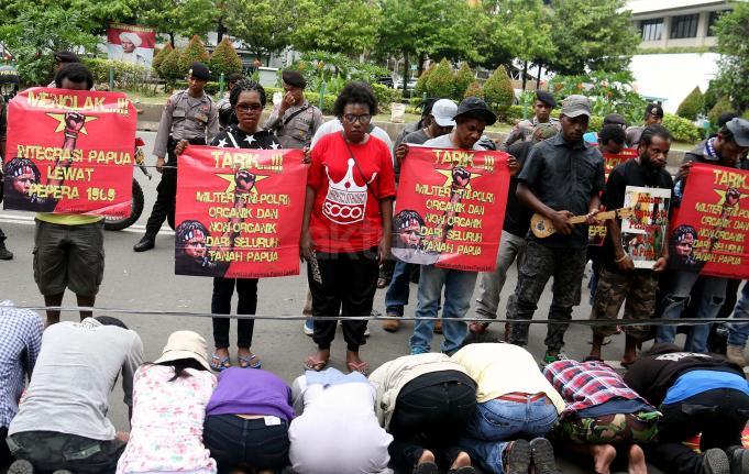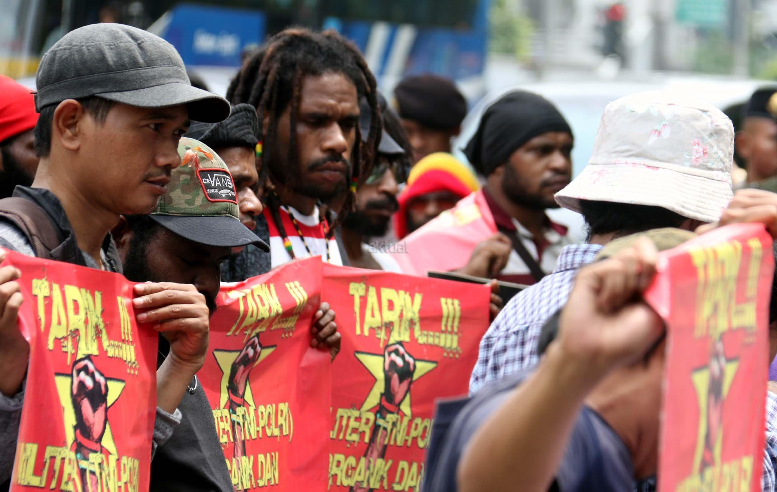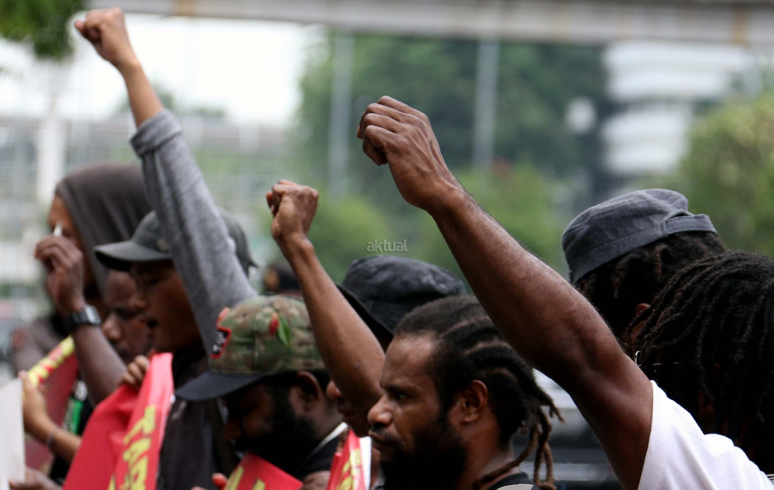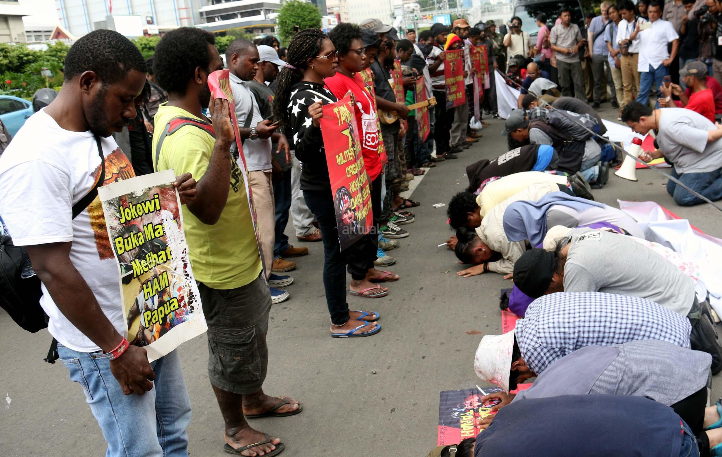 Sejumlah massa yang tergabung dalam FRI-West Papua dan Aliansi Mahasiswa Papua (AMP) melakukan aksi di depan gedung perwakilan PBB Jalan.MH.Thamrin, Jakarta Pusat, Senin (19/12/2016). Dalam aksinya FRI-West Papua dan Aliansi Mahasiswa Papua (AMP) mendesak PBB beserta rezim Jokowi – JK untuk segera menuntaskan pelanggaran HAM yang terjadi di Papua dan memberikan kebebesan, Hak menentukan nasib sendiri rakyat Papua.