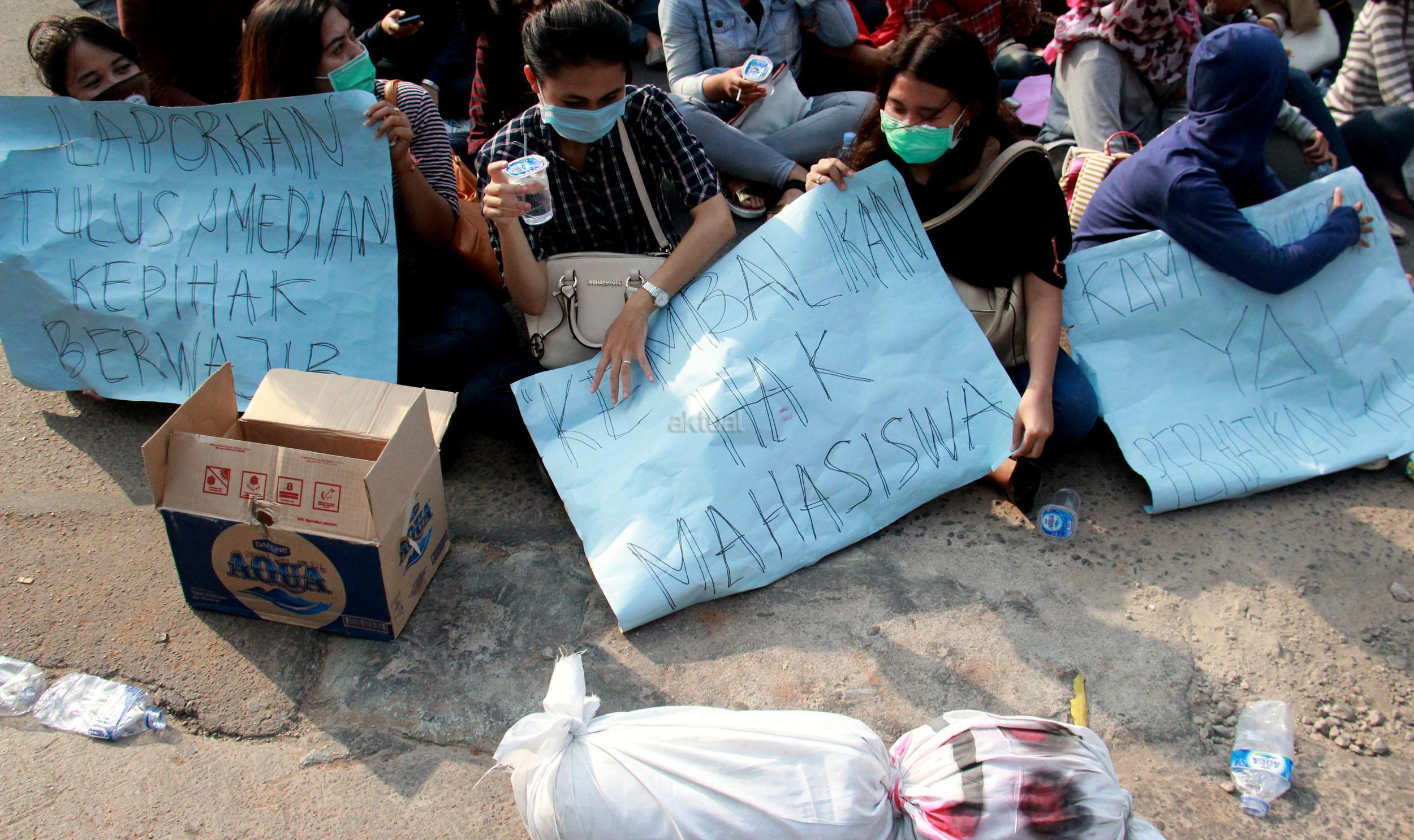 Ratusan mahasiswa yang tergabung dalam Forum Mahasiswa (Forma) LPT YAI gelar aksi unjuk rasa di depan kampusnya di Jalan Diponegoro, Jakarta Pusat, Selasa (27/10/2015). Aksi unjuk rasa tersebut dipicu terkait kasus kasus slip pembayaran bodong yang berdampak tertipunya 1.080 mahasiswa dengan total kerugian hingga Rp7 miliar.