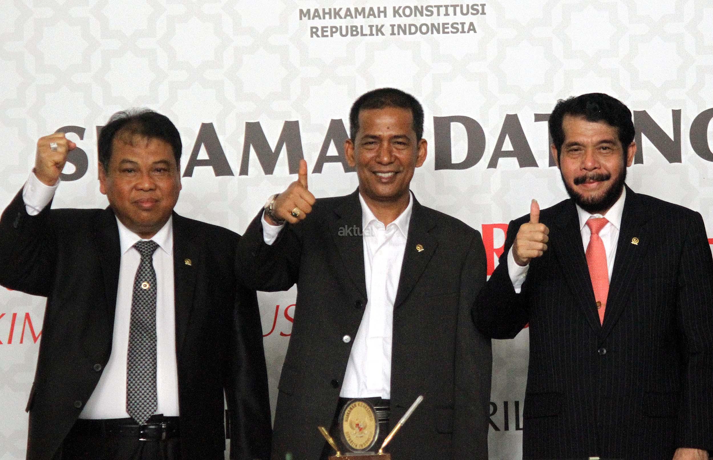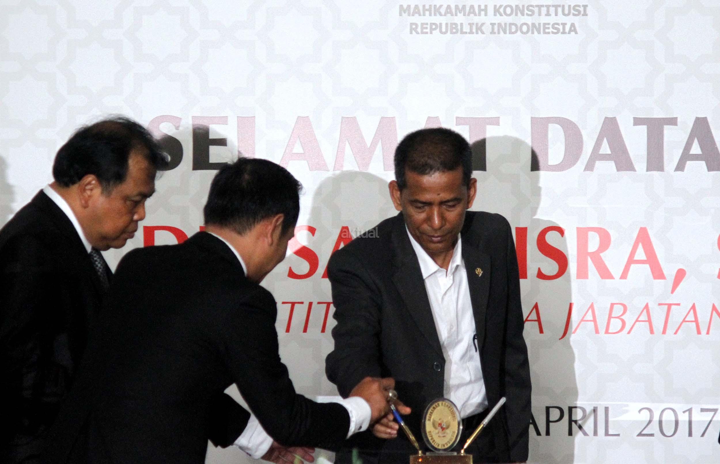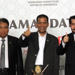 Ketua Mahkamah Konstitusi, Arief Hidayat (kiri) bersama Wakil Ketua Mahkamah Konstitusi, Anwar Usman (kanan), Saldi Isra (tengah) saat acara penyambutan Saldi Isra sebagai Ketua MK di Gedung MK, Jakarta, Selasa (11/4/2017). Saldi resmi menggantikan Patrialis Akbar yang dicopot karena menerima suap terkait uji materi. AKTUAL/Munzir