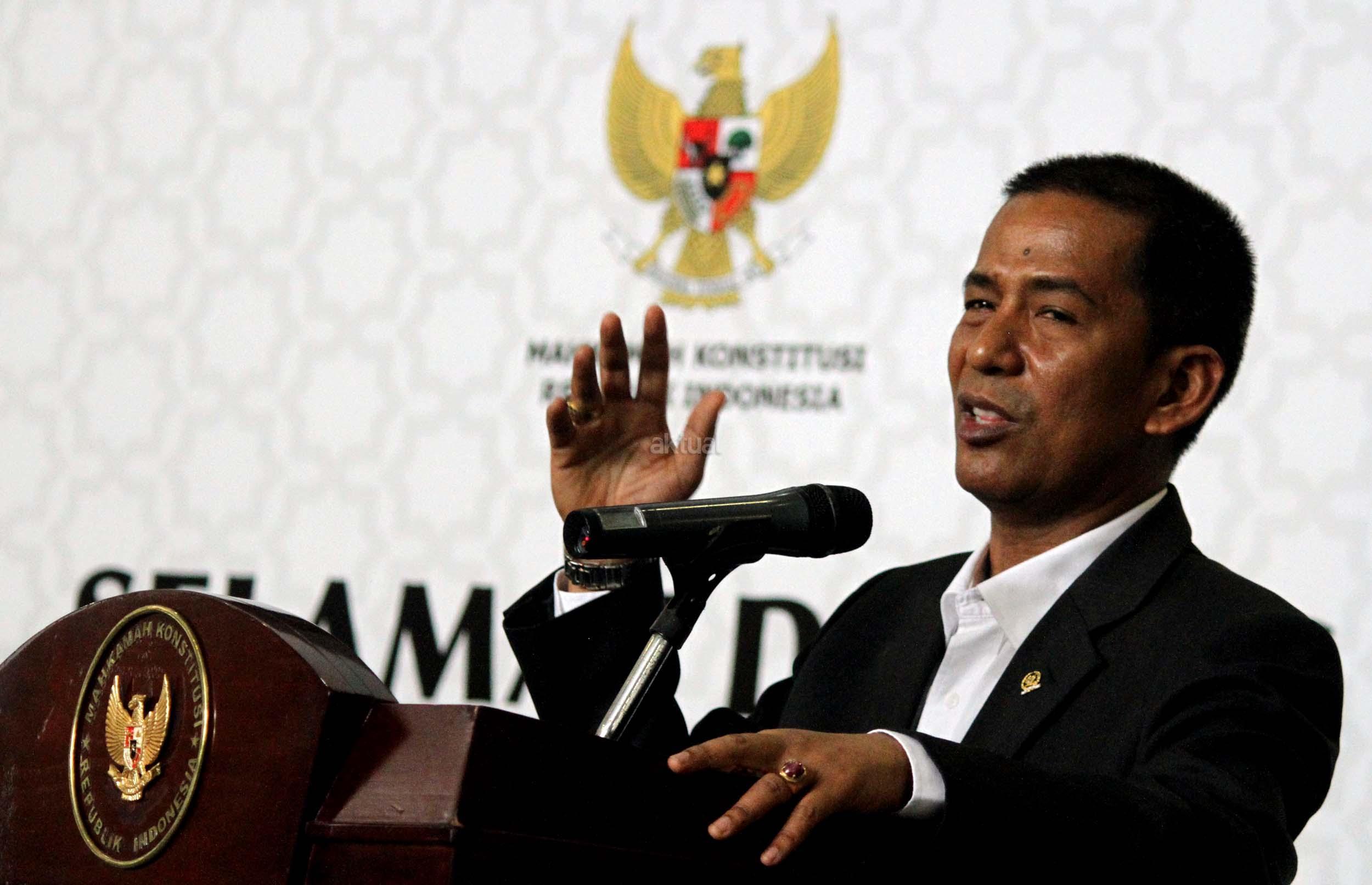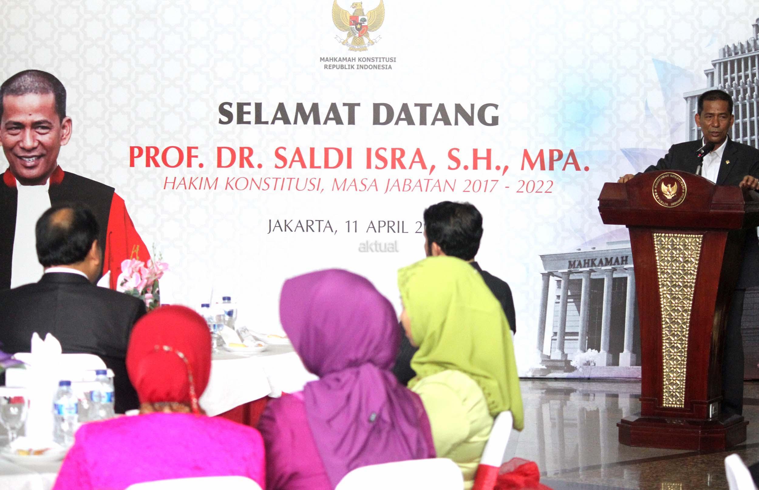Saldi Isra, berbicara saat acara penyambutan Saldi Isra sebagai Ketua MK di Gedung MK, Jakarta, Selasa (11/4/2017). Saldi resmi menggantikan Patrialis Akbar yang dicopot karena menerima suap terkait uji materi. AKTUAL/Munzir