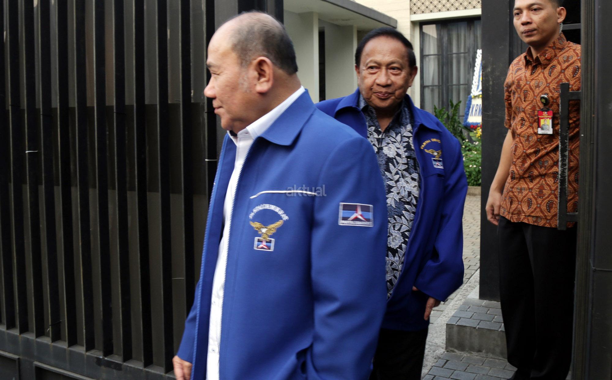 Ketua DPD Partai Demokrat DKI Jakarta Nachrowi Ramli bersama anggota Majelis Tinggi Partai Demokrat EE Mangindaan usai melakukan rapat pimpinan majelis tinggi Partai Demokrat di Kediaman Ketua Umum DPP Susilo Bambang Yudhoyono, di Mega Kuningan, Jakarta, Senin (9/7/2018). Pertemuan tersebut membahas tiga agenda, pertama bahas DPR RI, kedua gubernur wakil gubernur dan ketiga capres dan cawapres. AKTUAL/Tino Oktaviano