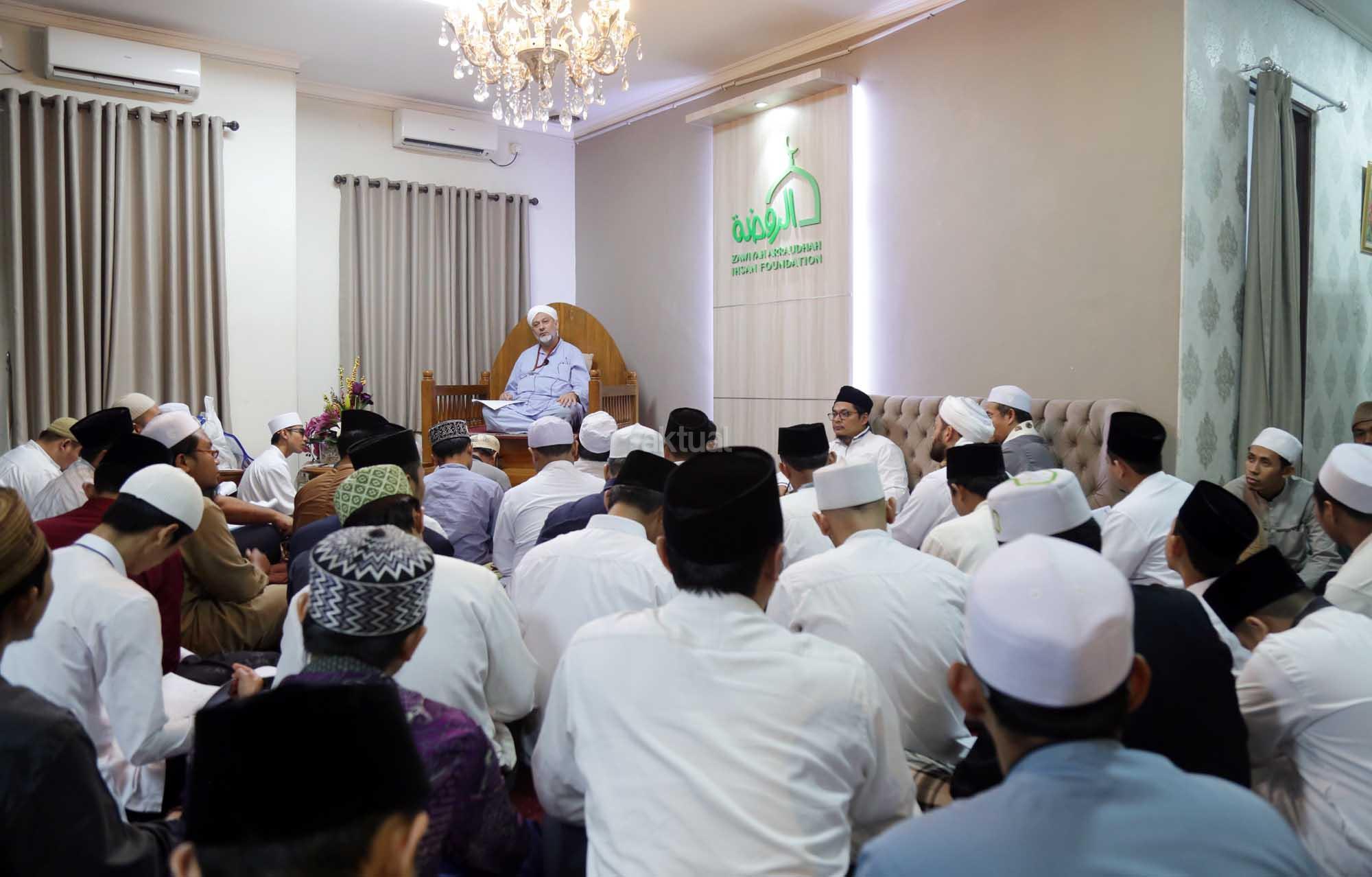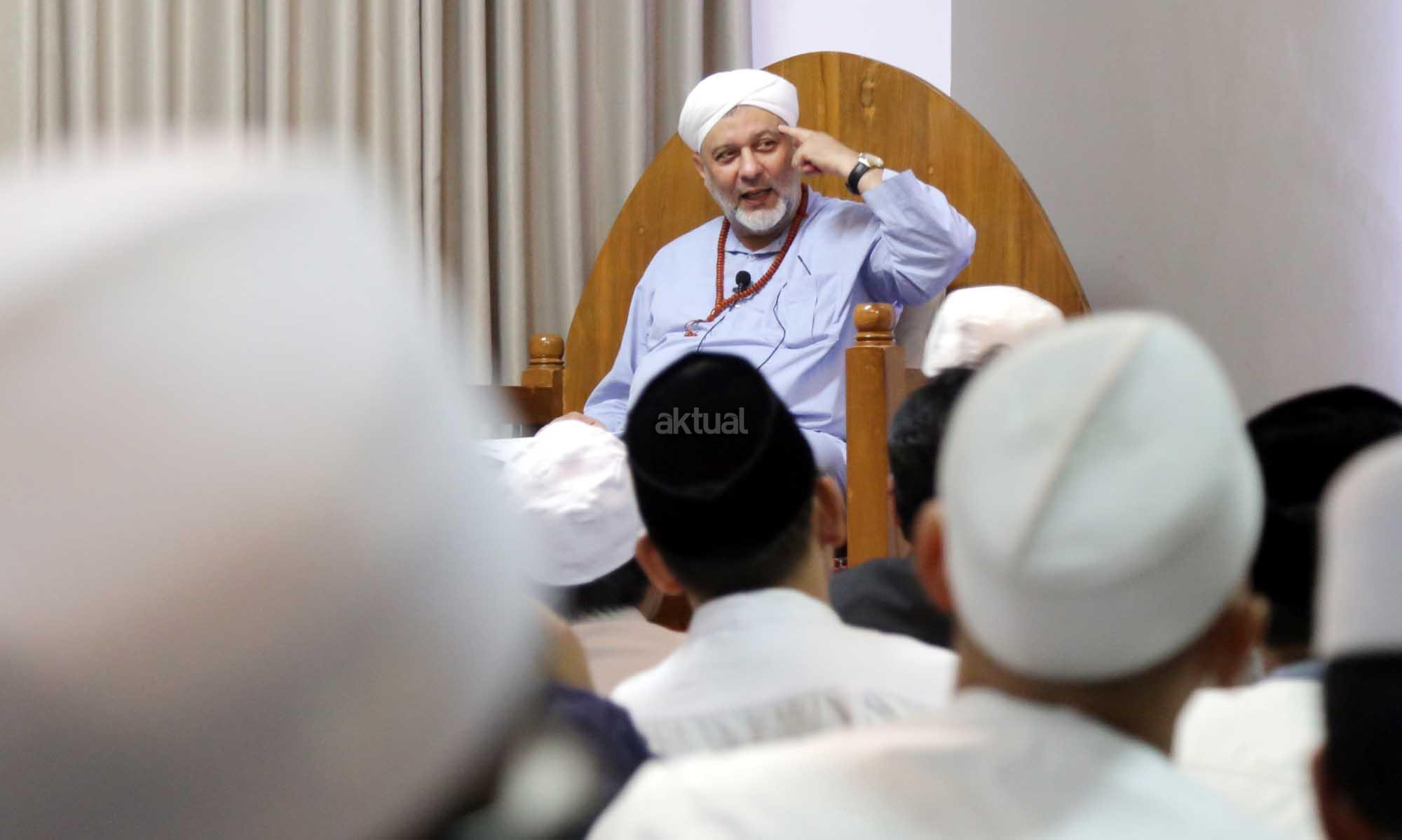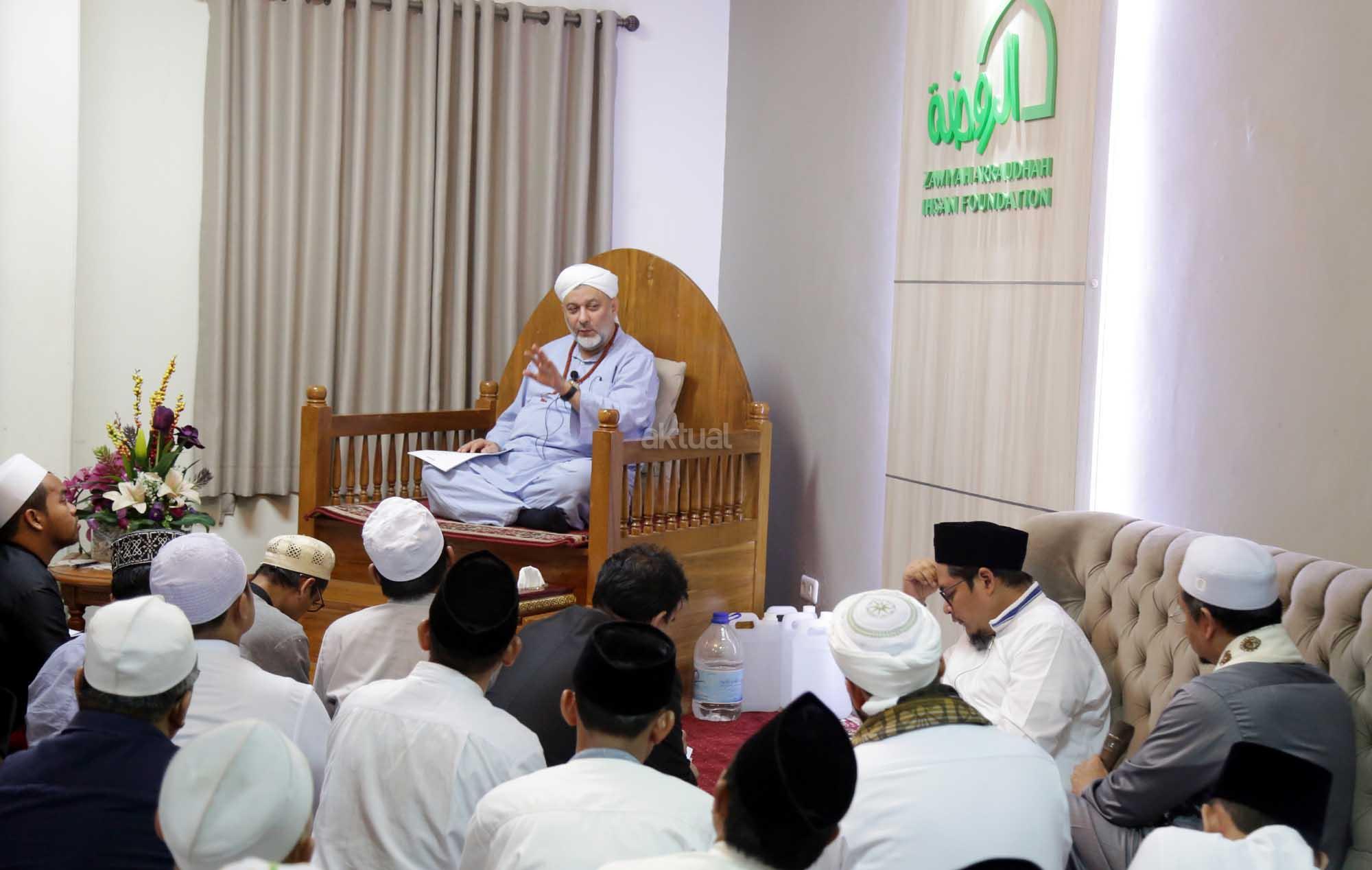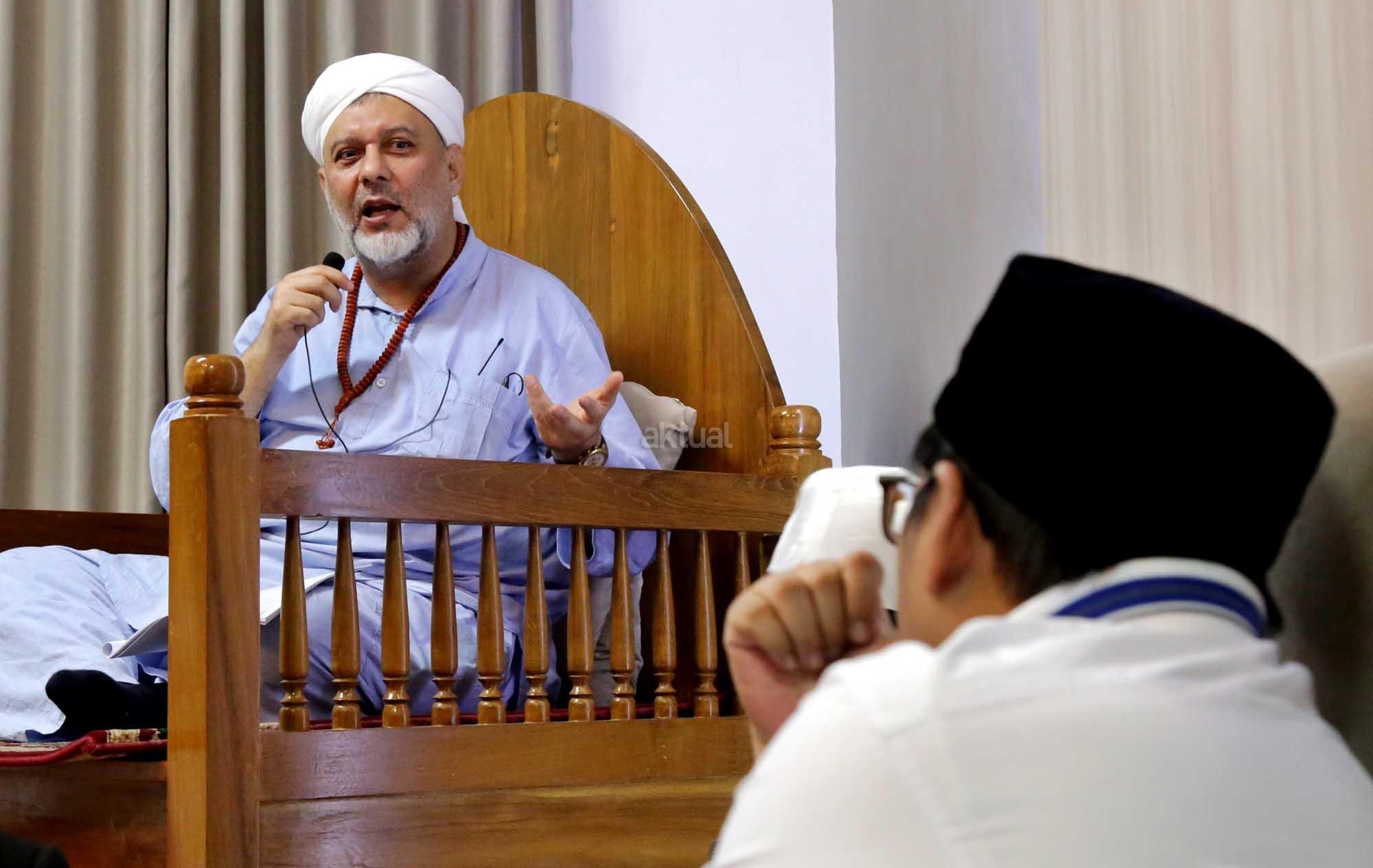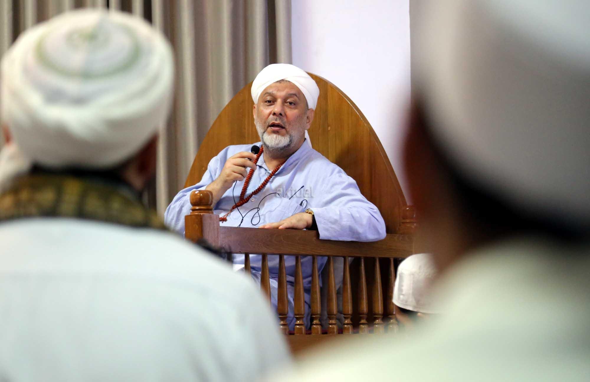 Syekh Dr. Mahmod Abu al Huda al Huseini saat mengisi Sya’rah “Hizab Bahr” Thoriqoh Syadziliyah di Zawiyah Arraudhah, Jalan Tebet Barat VIII, Jakarta Selatan, Senin (16/7/2018). Cucu Quthbul Aulia Syekh Imam Ahmad Arrifai ra Syiria – Turki, Mursyid Thoriqoh Darqowiyah Syadziliyah ini akan mengisi kajian di Zawiyah Arraudhah selama dua hari hingga 17 Juli 2018. AKTUAL/Tino Oktavino
