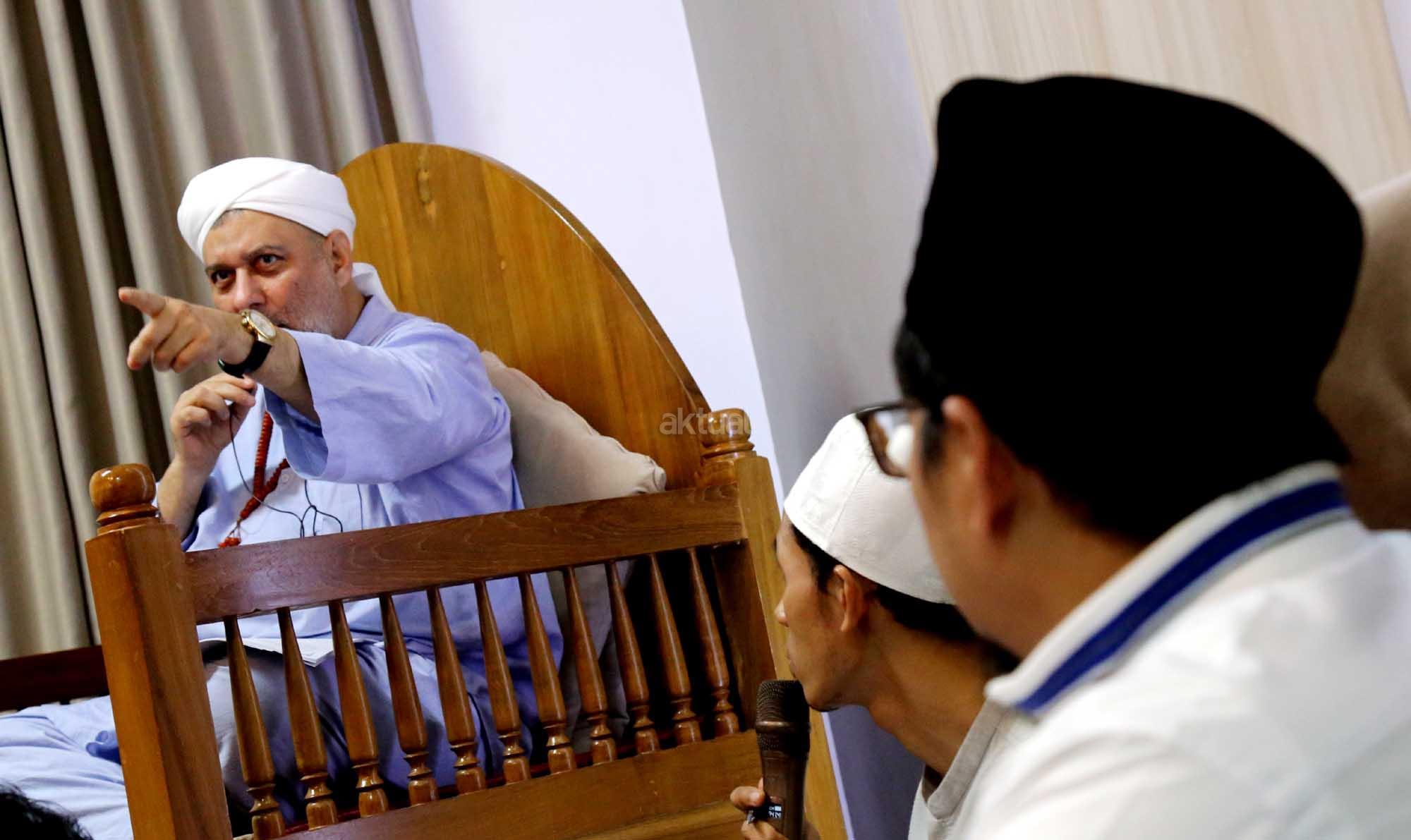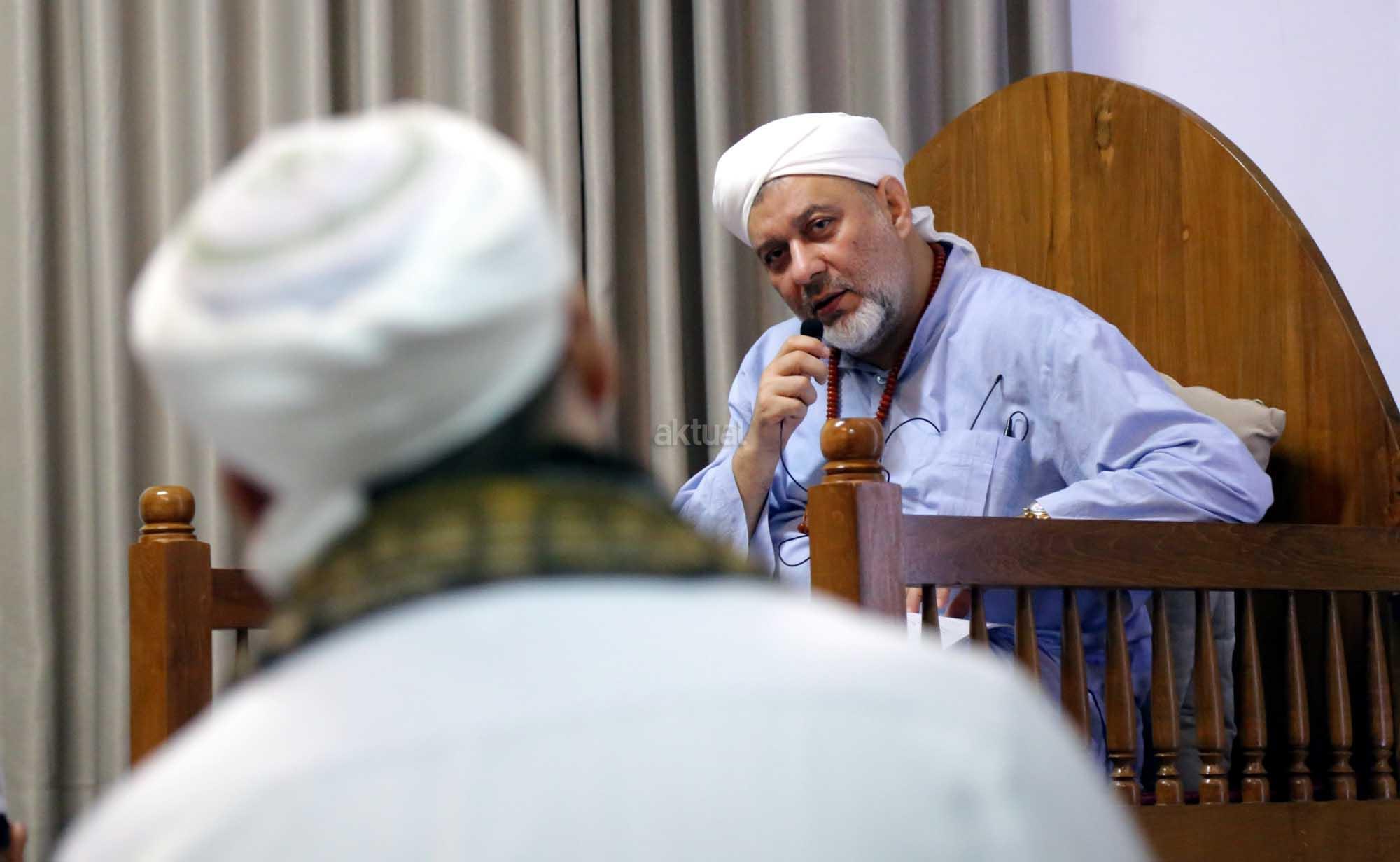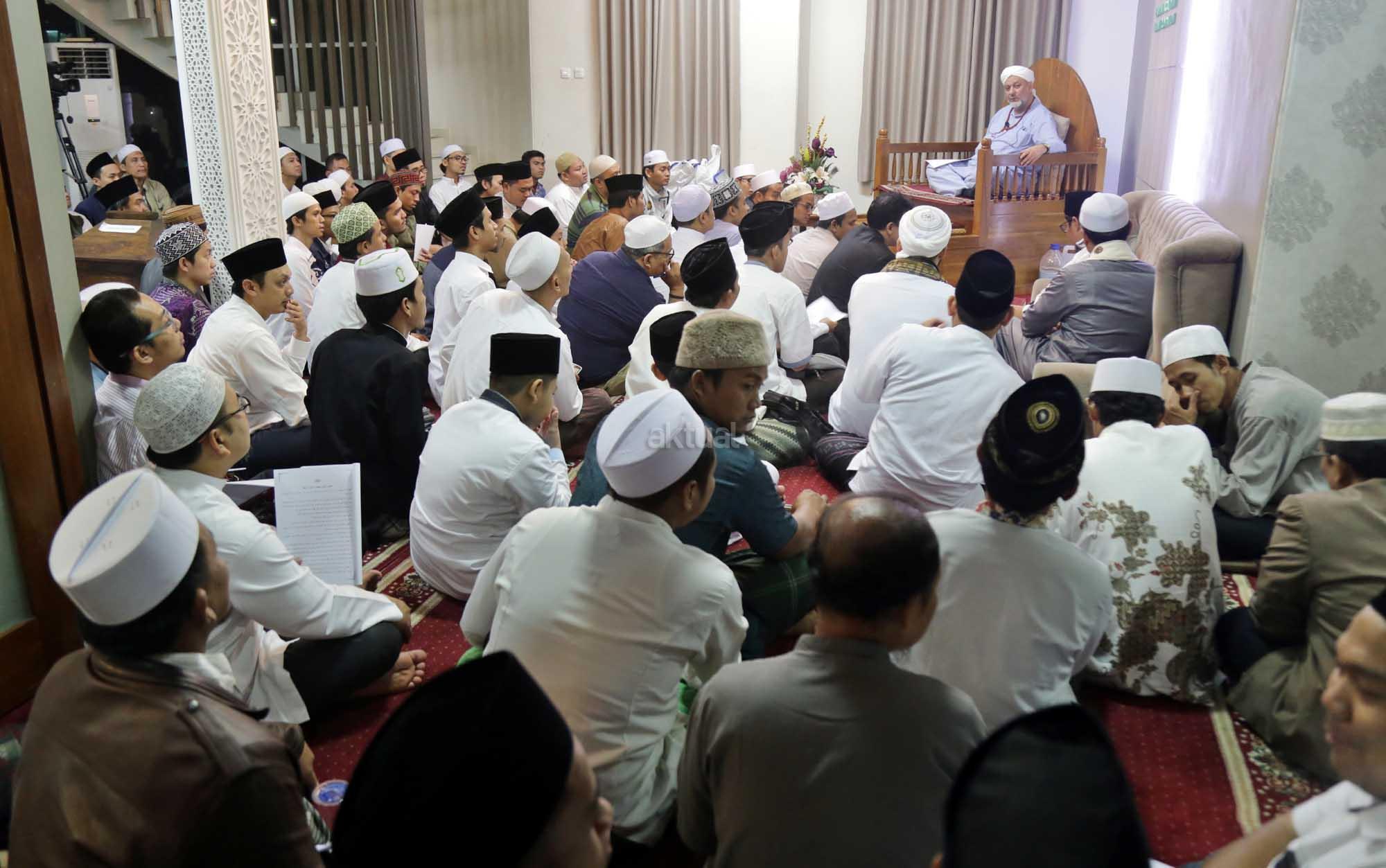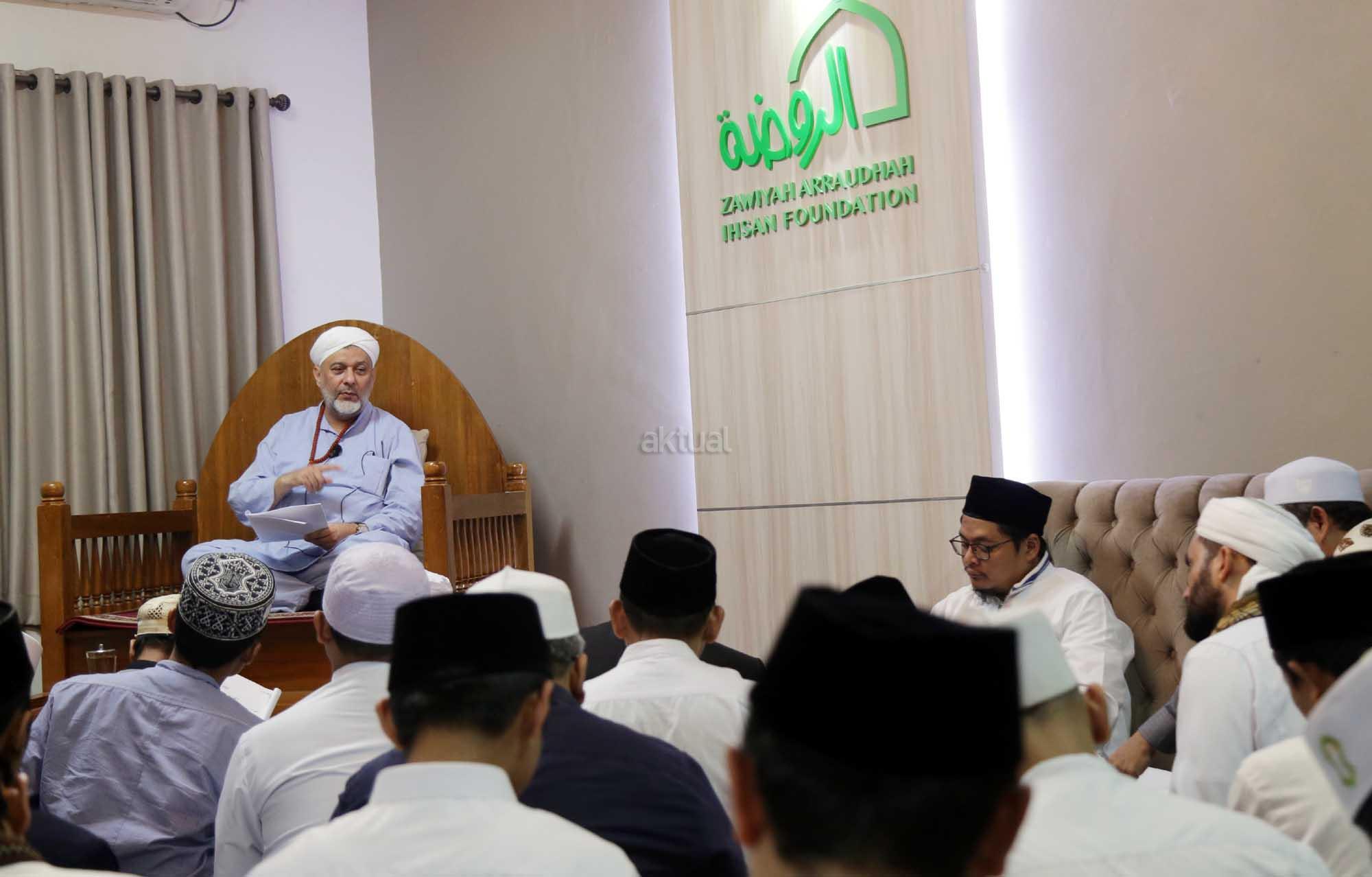 Syekh Dr. Mahmod Abu al Huda al Huseini saat mengisi Sya’rah “Hizab Bahr” Thoriqoh Syadziliyah di Zawiyah Arraudhah, Jalan Tebet Barat VIII, Jakarta Selatan, Senin (16/7/2018). Cucu Quthbul Aulia Syekh Imam Ahmad Arrifai ra Syiria – Turki, Mursyid Thoriqoh Darqowiyah Syadziliyah ini akan mengisi kajian di Zawiyah Arraudhah selama dua hari hingga 17 Juli 2018. AKTUAL/Tino Oktavino