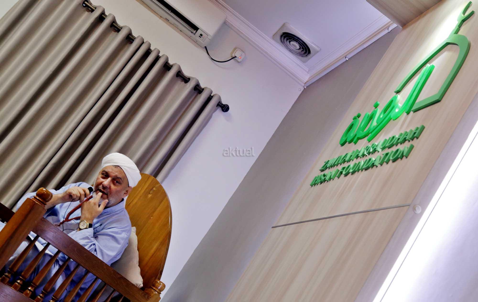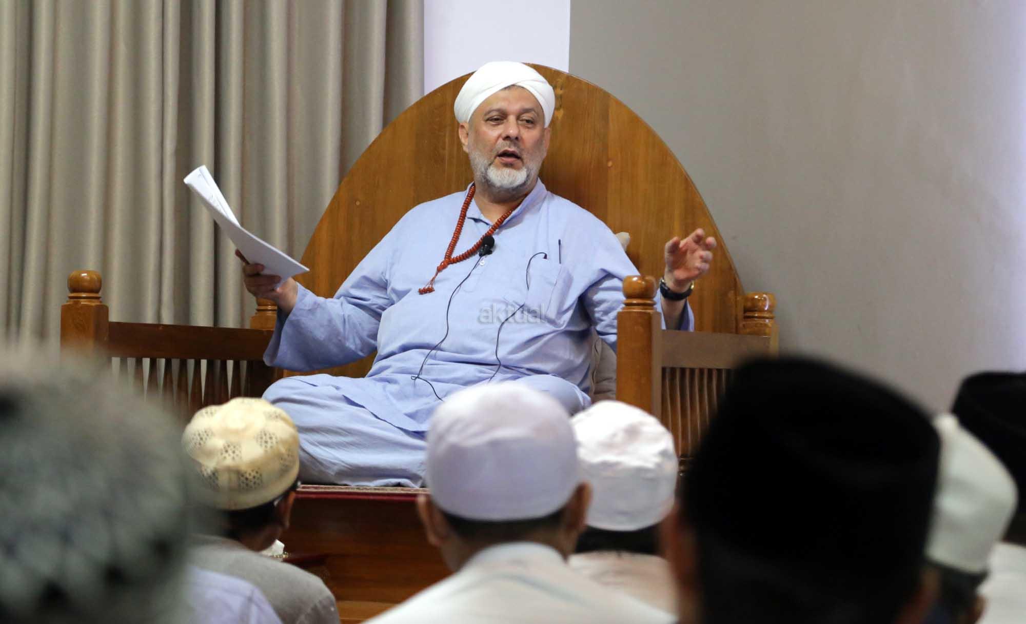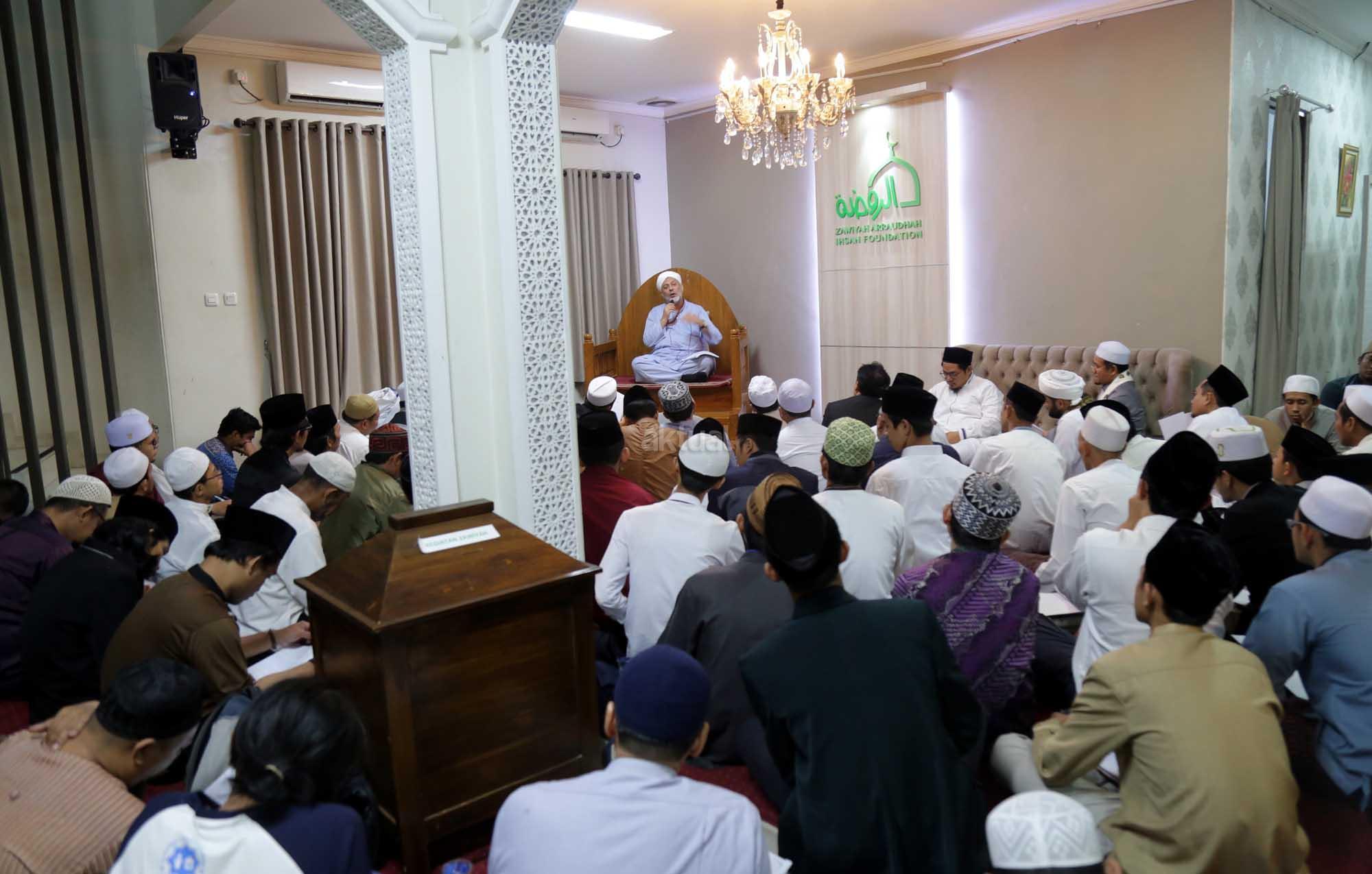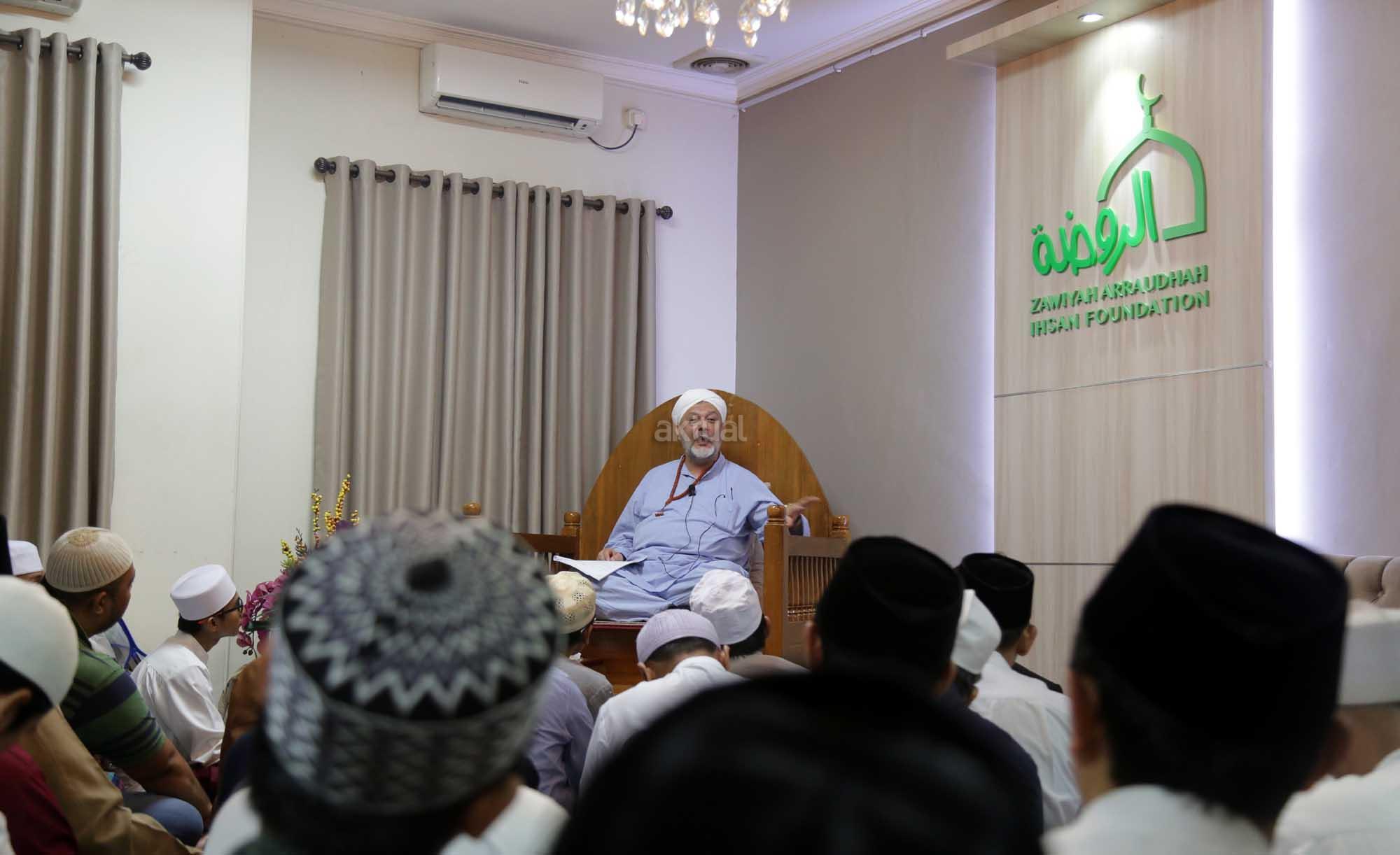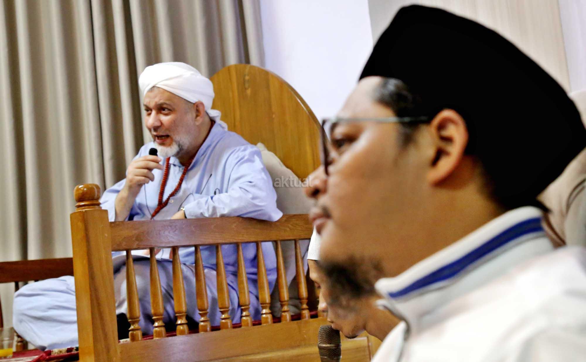 Syekh Dr. Mahmod Abu al Huda al Huseini saat mengisi Sya’rah “Hizab Bahr” Thoriqoh Syadziliyah di Zawiyah Arraudhah, Jalan Tebet Barat VIII, Jakarta Selatan, Senin (16/7/2018). Cucu Quthbul Aulia Syekh Imam Ahmad Arrifai ra Syiria – Turki, Mursyid Thoriqoh Darqowiyah Syadziliyah ini akan mengisi kajian di Zawiyah Arraudhah selama dua hari hingga 17 Juli 2018. AKTUAL/Tino Oktavino