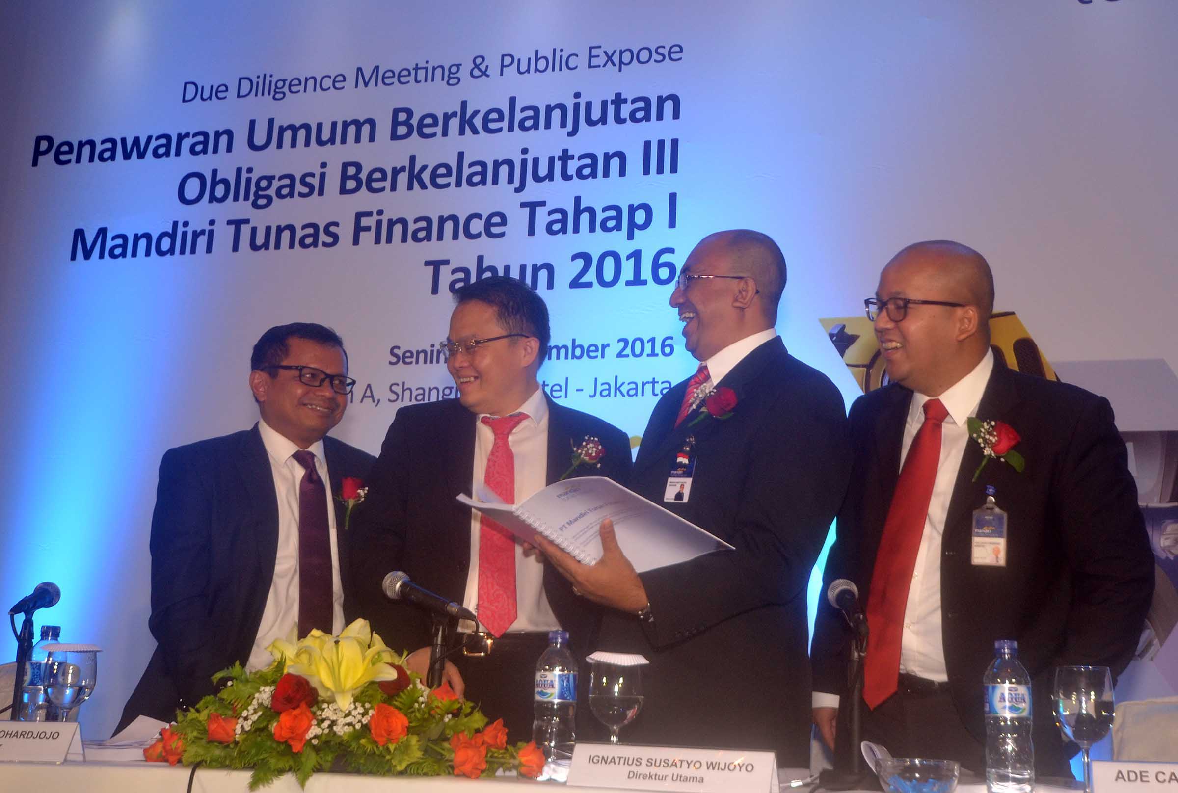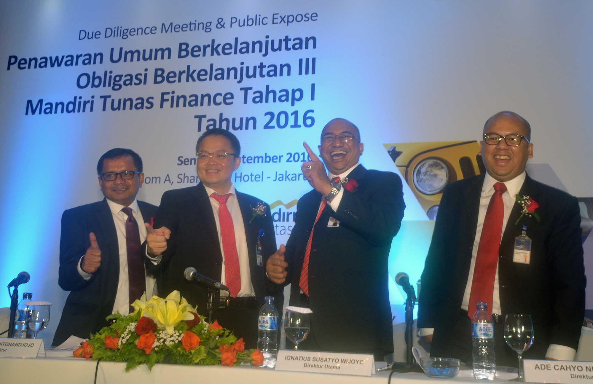 Direktur Utama PT Mandiri Tunas Finace, Ignatius Susatyo Wijoyo (kedua dari kanan) berbincang dengan Direktur, Harjanto Tjitohardjojo (kedua dari kiri) serta Direktur, Ade Cahyo Nugroho (kanan) dan Perwakilan Penjamin Emisi dari Mandiri Sekuritas , Donny Arsal (kiri) seusai penawaran Obligasi Berkelanjutan III Mandiri Tunas Finance Tahap I Tahun 2016 dengan nilai sebanyak banyaknya sebesar Rp 500 Miliar di Jakarta, Senin (5/9). Obligasi tersebut merupakan bagian dari rencana Penawaran Umum Berkelanjutan (PUB) Obligasi Berkelanjutan III senilai total Rp 3 Triliun.Saat ini, 51% saham Mandiri Tunas Finance dimiliki oleh Bank Mandiri dan sisanya sebesar 49% saham dipegang oleh Tunas Ridean. Sementara itu, pada kuartal I 2016, new lending perseroan naik 31,9% menjadi Rp 4,87 triliun dibandingkan periode yang sama tahun 2015 sebesar Rp 3,69 triliun.