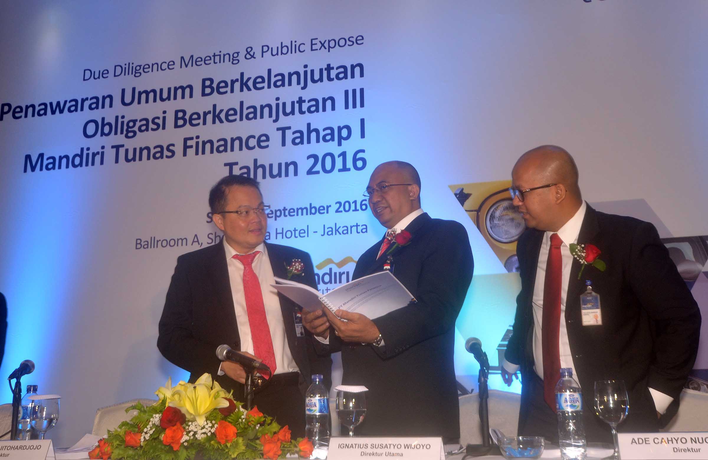 Direktur Utama PT Mandiri Tunas Finace, Ignatius Susatyo Wijoyo (tengah) berbincang dengan Direktur, Harjanto Tjitohardjojo (kiri) serta Direktur, Ade Cahyo Nugroho seusai penawaran Obligasi Berkelanjutan III Mandiri Tunas Finance Tahap I Tahun 2016 dengan nilai sebanyak banyaknya sebesar Rp 500 Miliar di Jakarta, Senin (5/9). Obligasi tersebut merupakan bagian dari rencana Penawaran Umum Berkelanjutan (PUB) Obligasi Berkelanjutan III senilai total Rp 3 Triliun.Saat ini, 51% saham Mandiri Tunas Finance dimiliki oleh Bank Mandiri dan sisanya sebesar 49% saham dipegang oleh Tunas Ridean. Sementara itu, pada kuartal I 2016, new lending perseroan naik 31,9% menjadi Rp 4,87 triliun dibandingkan periode yang sama tahun 2015 sebesar Rp 3,69 triliun.