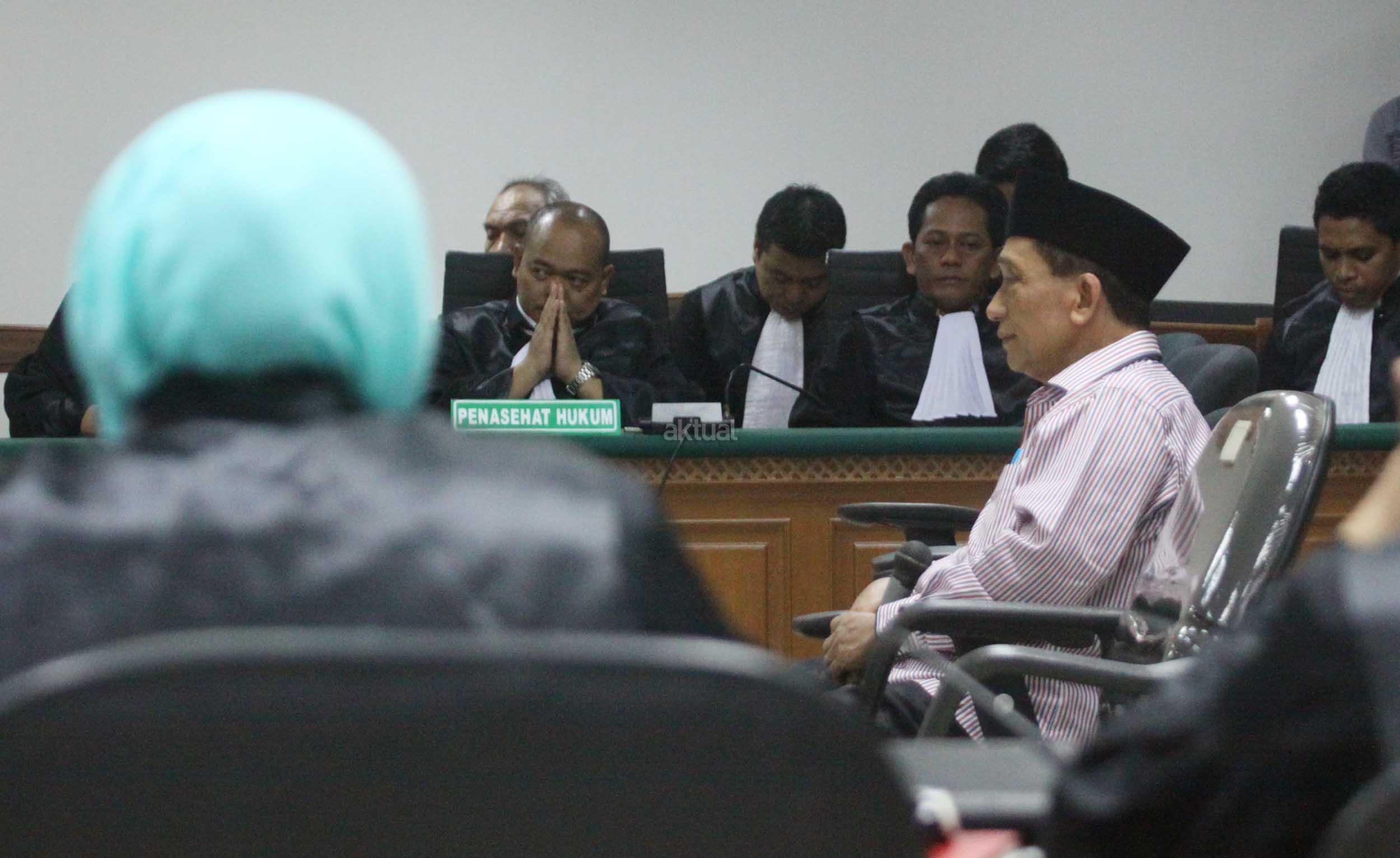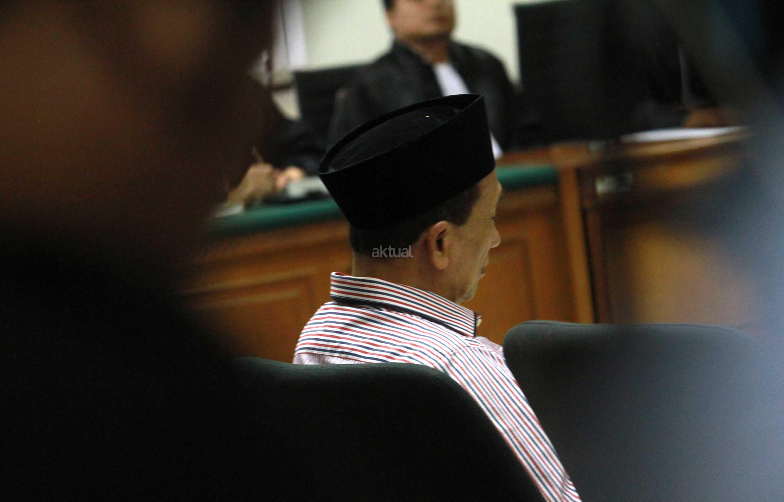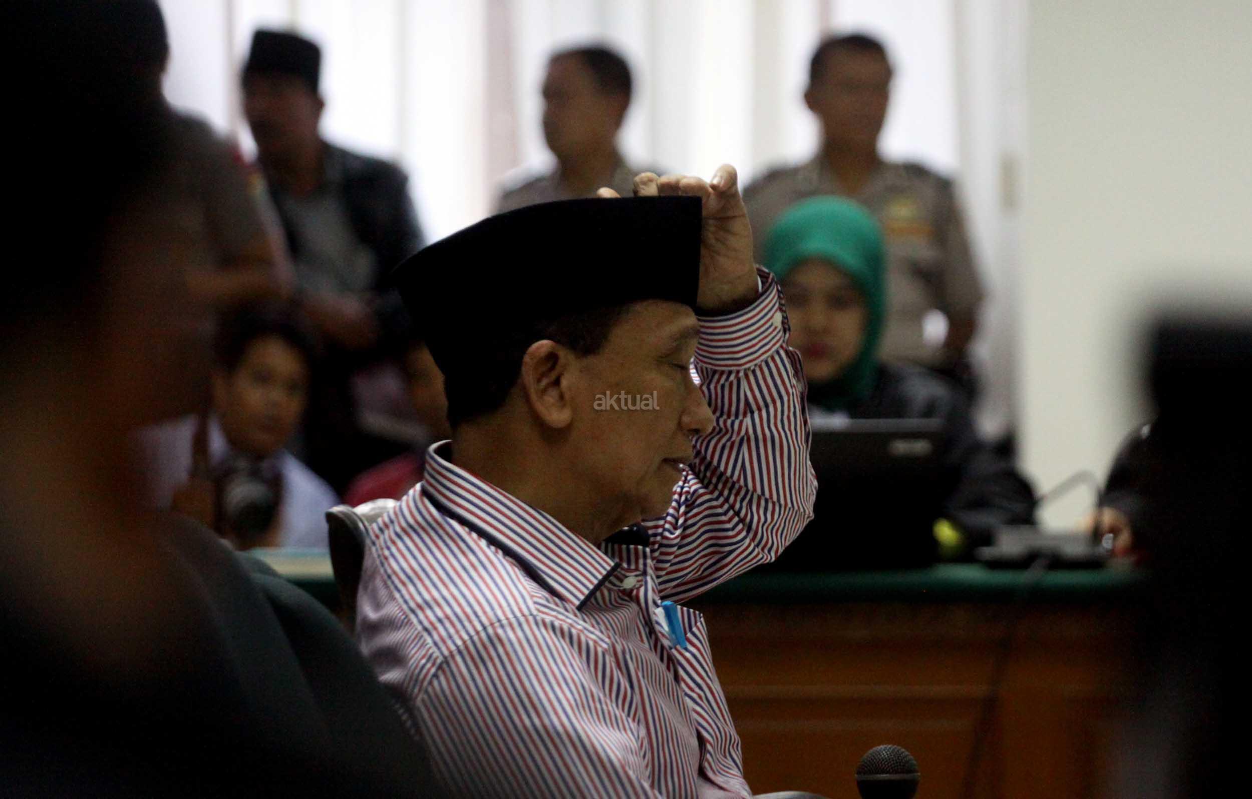 Terdakwa mantan Bupati Bangkalan Fuad Amin Imron saat menjalani dan mendengarkan sidang pembacaan putusan di Pengadilan Tipikor, Jakarta, Senin (19/10/2015). Majelis hakim yang diketuai M. Muchlis memvonis Fuad Amin 8 tahun penjara dan denda Rp1miliar subsider enam bulan karena terbukti menerima suap terkait jual beli gas alam di Bangkalan, Madura dari PT Media Karya Sentosa, serta melakukan Tindak Pidana Pencucian Uang.